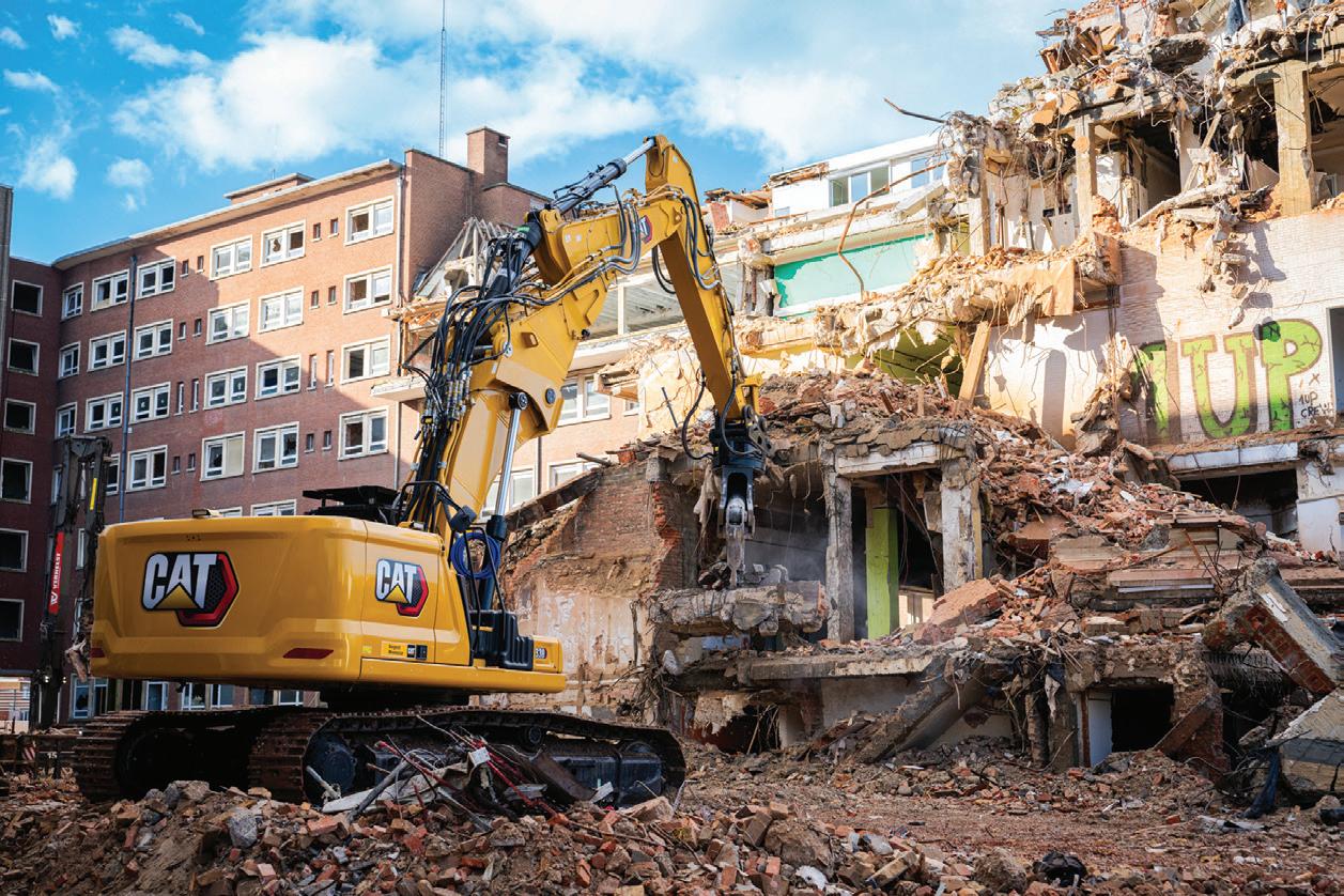 The Cat 330 UHD (Ultra High Demolition) excavator is a 46-ton machine engineered for demolition versatility in applications ranging from 5 to 6 storeys. With a reach of up to 20 metres (65 feet 6 inches) and a tool capacity of 3,300 kilograms (7,275 pounds), the machine can be configured with one-piece or two-piece retrofit booms to suit site requirements. Fifteen-minute boom swaps are possible with the hydraulic quick disconnect system. Operators can select a fixed or hydraulic-variable undercarriage for a 3-metre (9-foot 10-inch) transport width or 3.4-metre (11-foot 3-inch) working width for added stability.