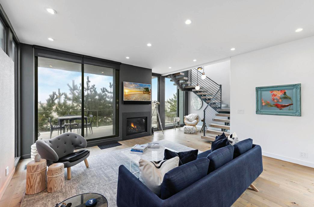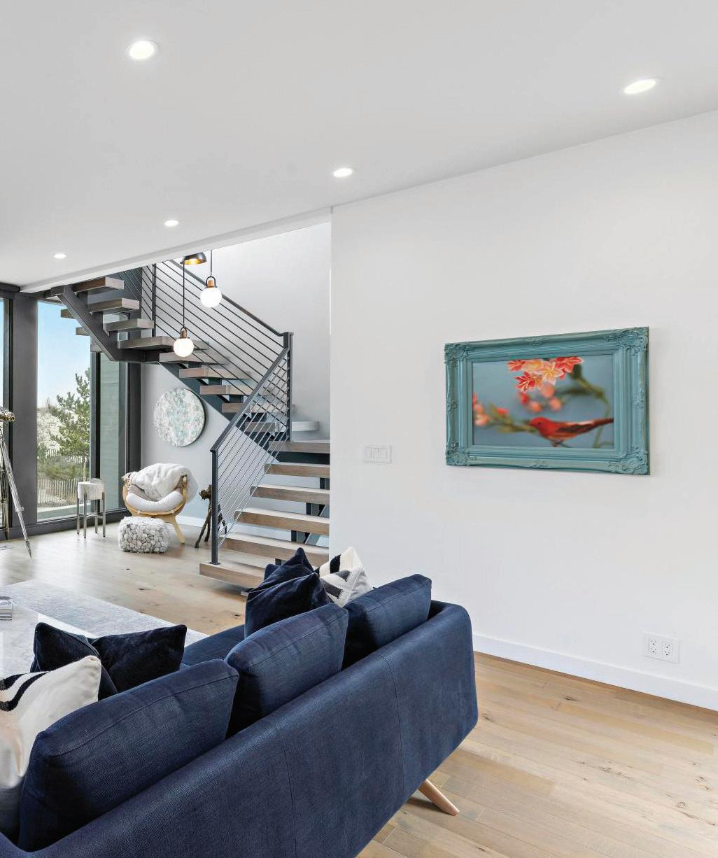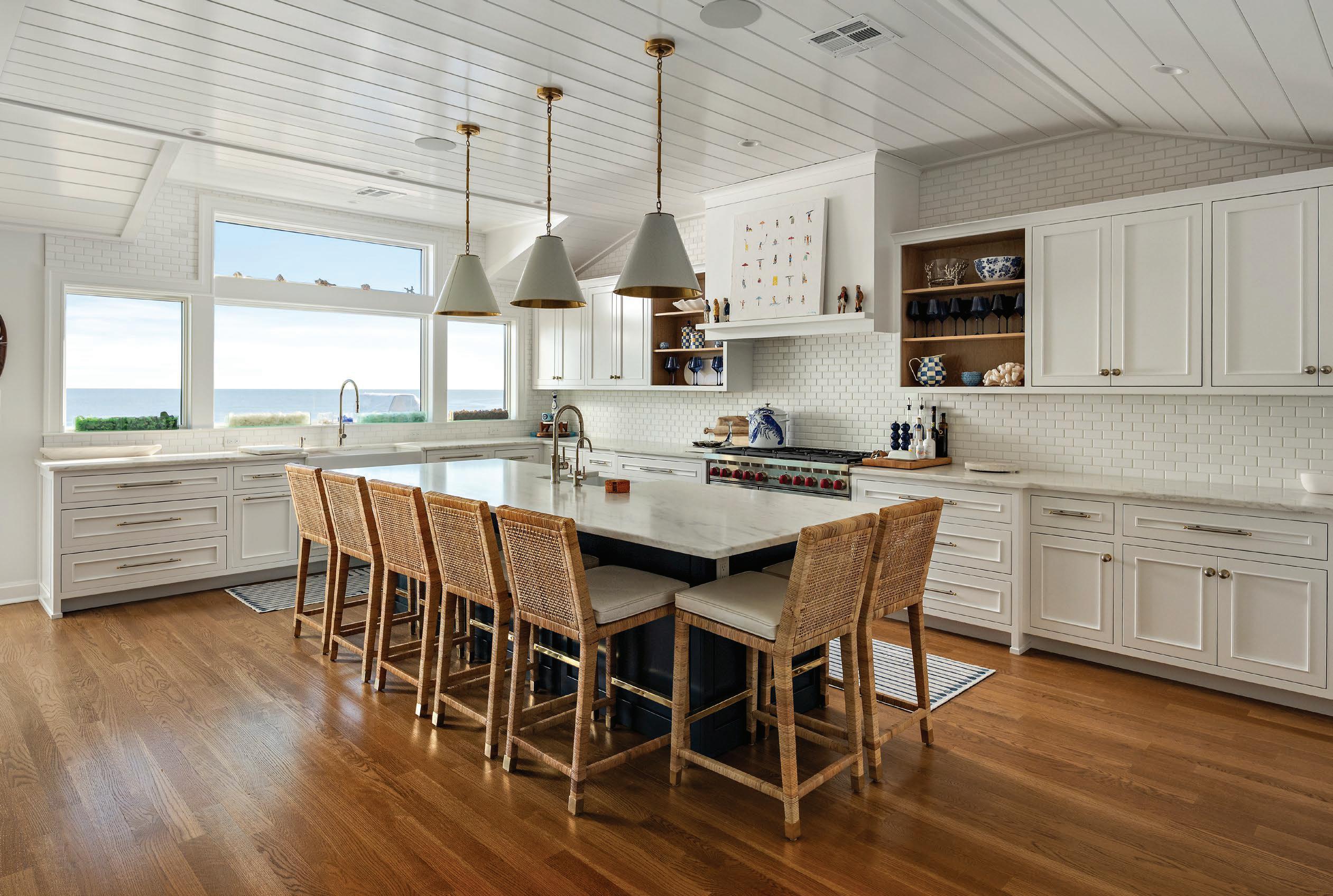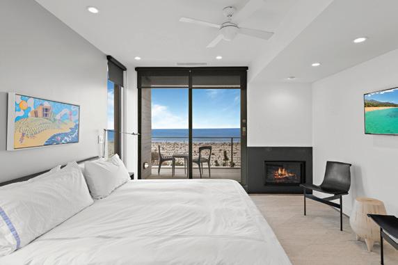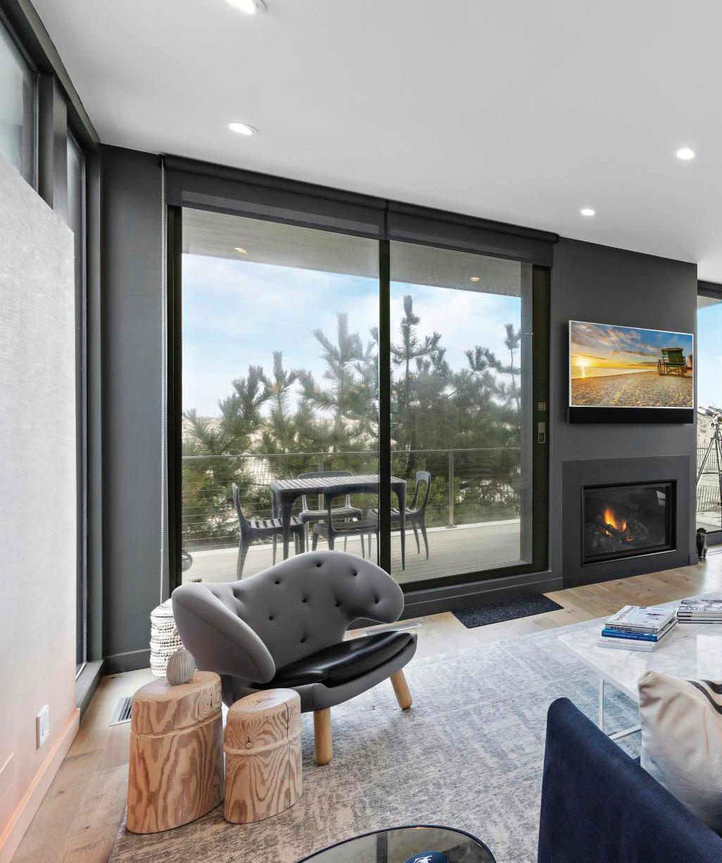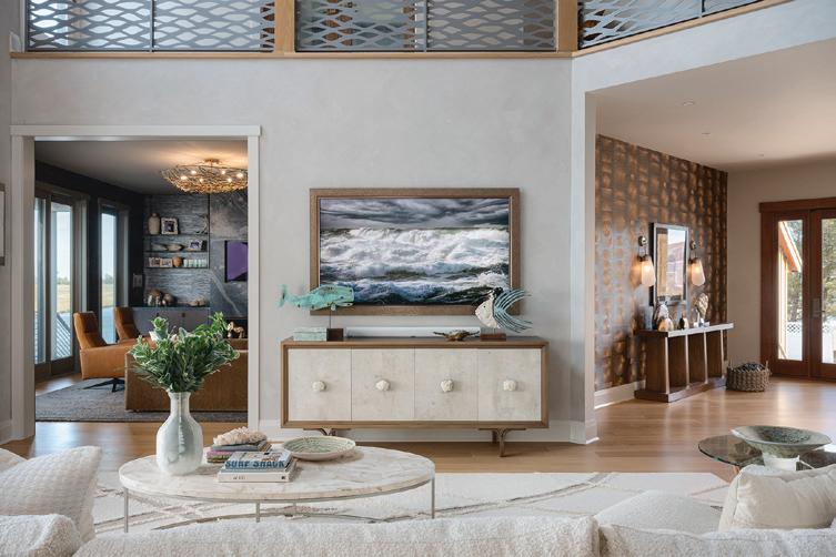Kim and beautifully crafted beds with trundles. An open, floating staircase leads down to the level below, which offers an open concept layout to carry the incredible seaside views throughout the space. A north wall of windows in the living room offers privacy through an architectural half wall, featuring ombre wallpaper from Calico & Co which echoes the unforgettable sunrise over the ocean. A Kindred gas fireplace situated between windows along the ocean wall creates a stellar effect, masterfully blending the earthy elements of fire and water. Adjacent to the living room, the thoughtfully designed cook’s kitchen is truly suited for everyday use. With a Thermador suite of appliances, creamy gray floorto-ceiling cabinetry, and a breakfast bar perfect for hungry children, the space is built to accommodate family meals. The adjoining dining area features custom furniture from Chicago-based architect Richard Gorman. In his signature modern style, a walnut slab table with stainless steel legs and a coordinating sideboard stand out as an investment in beauty and functionality.