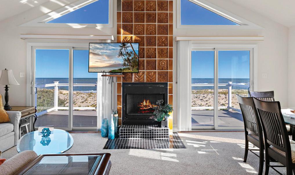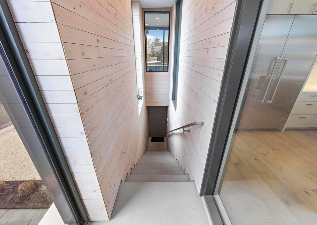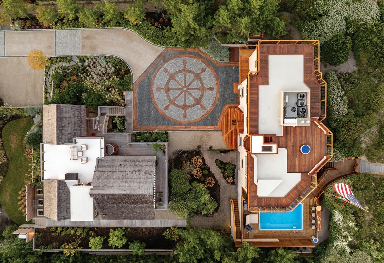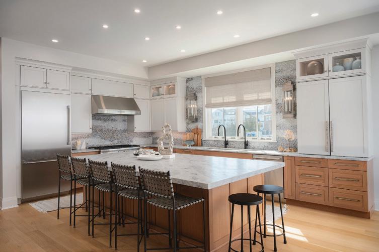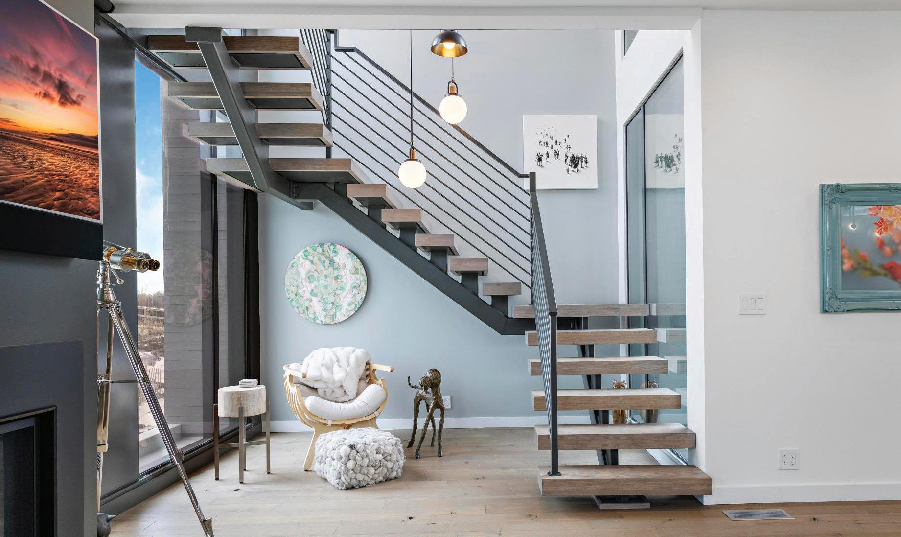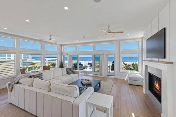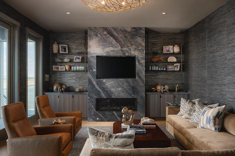 Kim and beautifully crafted beds with trundles. An open, floating staircase leads down to the level below, which offers an open concept layout to carry the incredible seaside views throughout the space. A north wall of windows in the living room offers privacy through an architectural half wall, featuring ombre wallpaper from Calico & Co which echoes the unforgettable sunrise over the ocean. A Kindred gas fireplace situated between windows along the ocean wall creates a stellar effect, masterfully blending the earthy elements of fire and water. Adjacent to the living room, the thoughtfully designed cook’s kitchen is truly suited for everyday use. With a Thermador suite of appliances, creamy gray floorto-ceiling cabinetry, and a breakfast bar perfect for hungry children, the space is built to accommodate family meals. The adjoining dining area features custom furniture from Chicago-based architect Richard Gorman. In his signature modern style, a walnut slab table with stainless steel legs and a coordinating sideboard stand out as an investment in beauty and functionality.