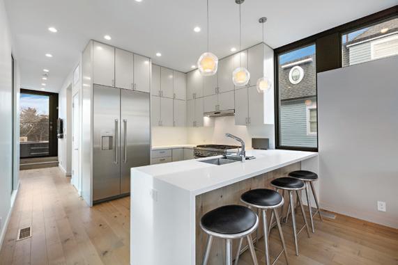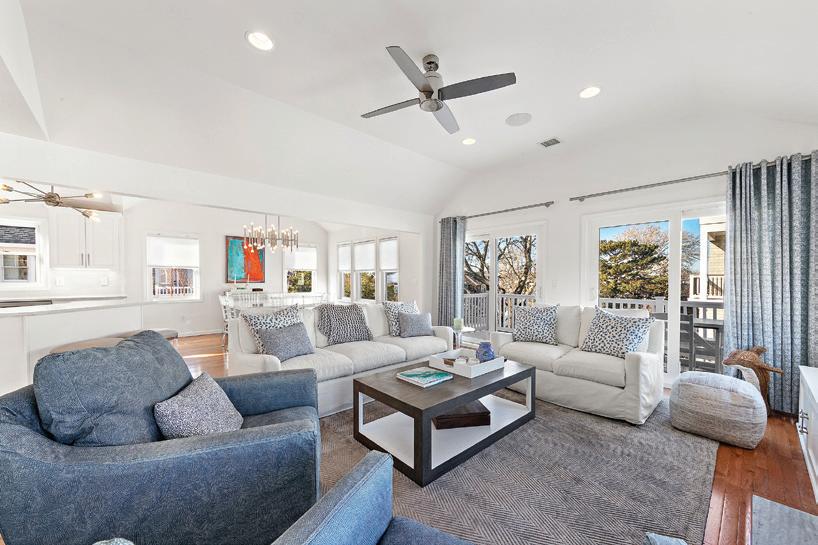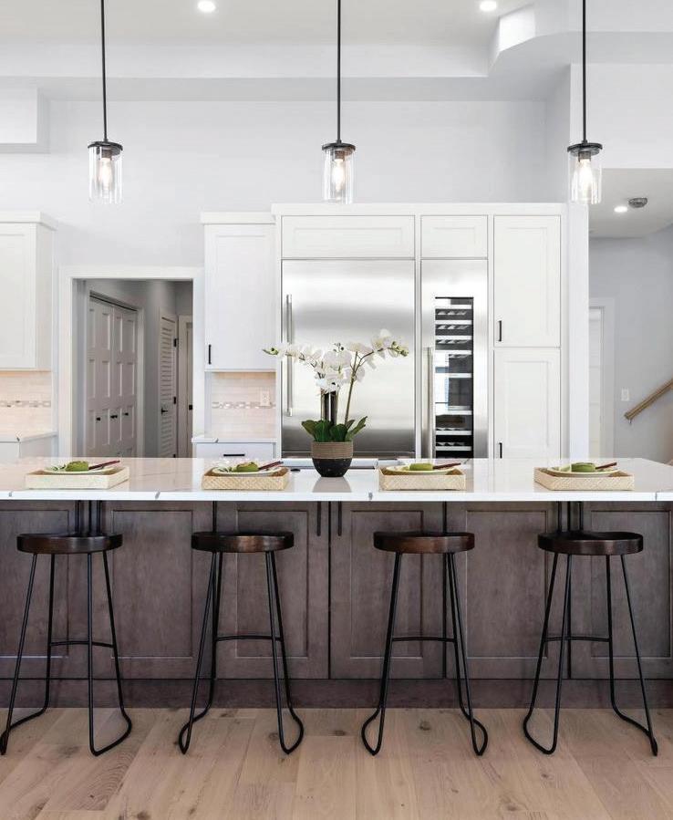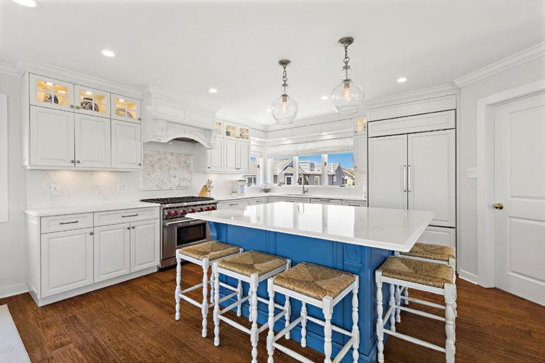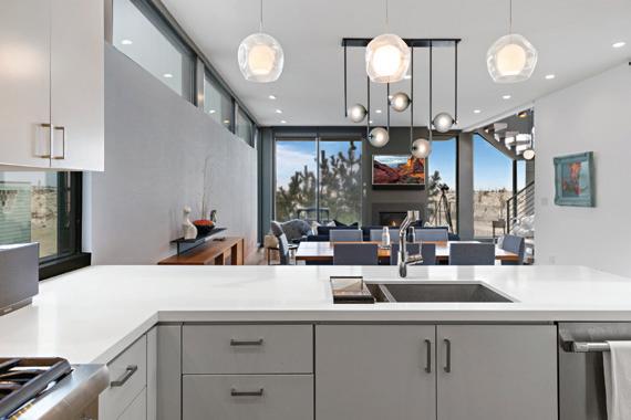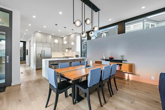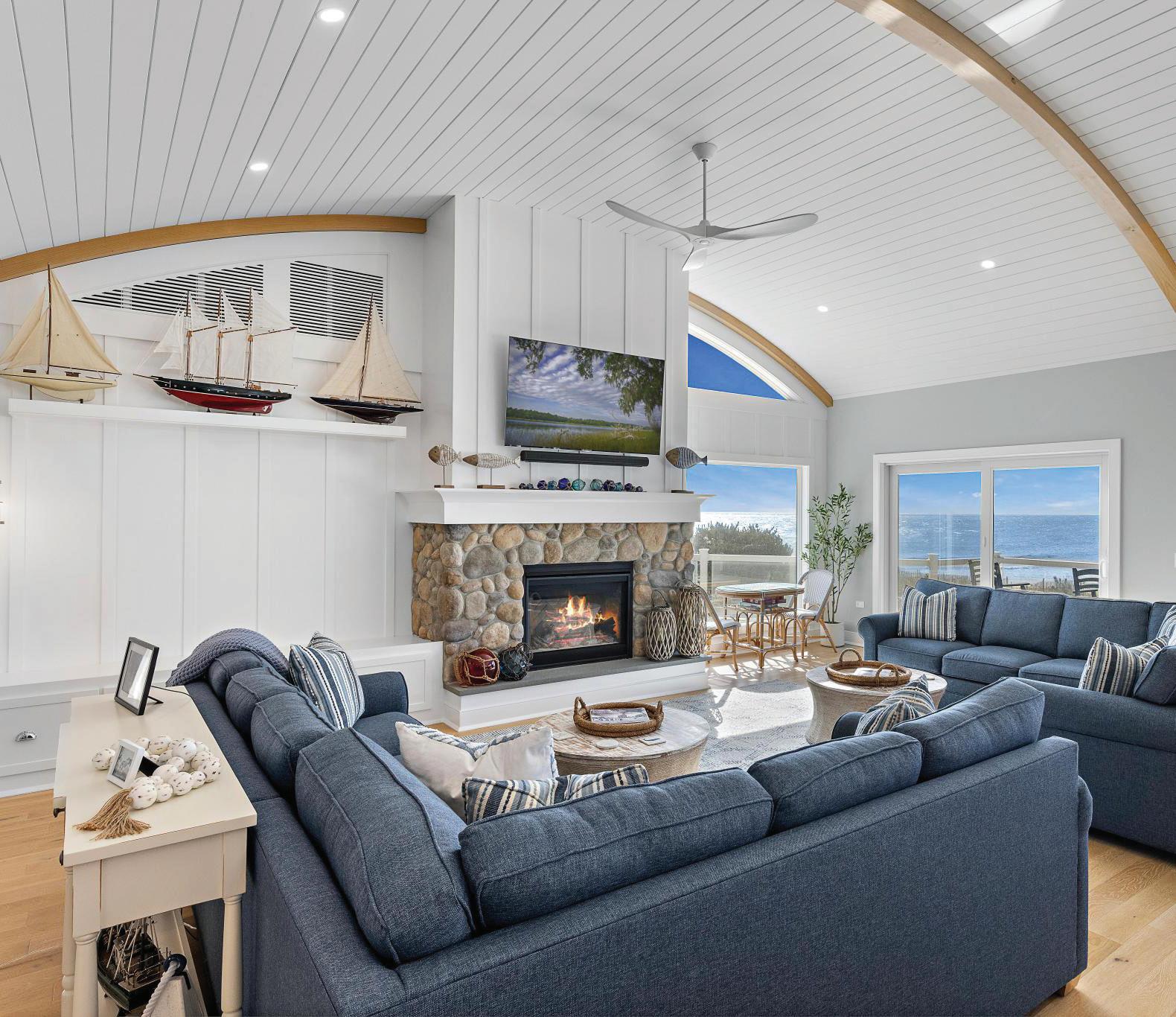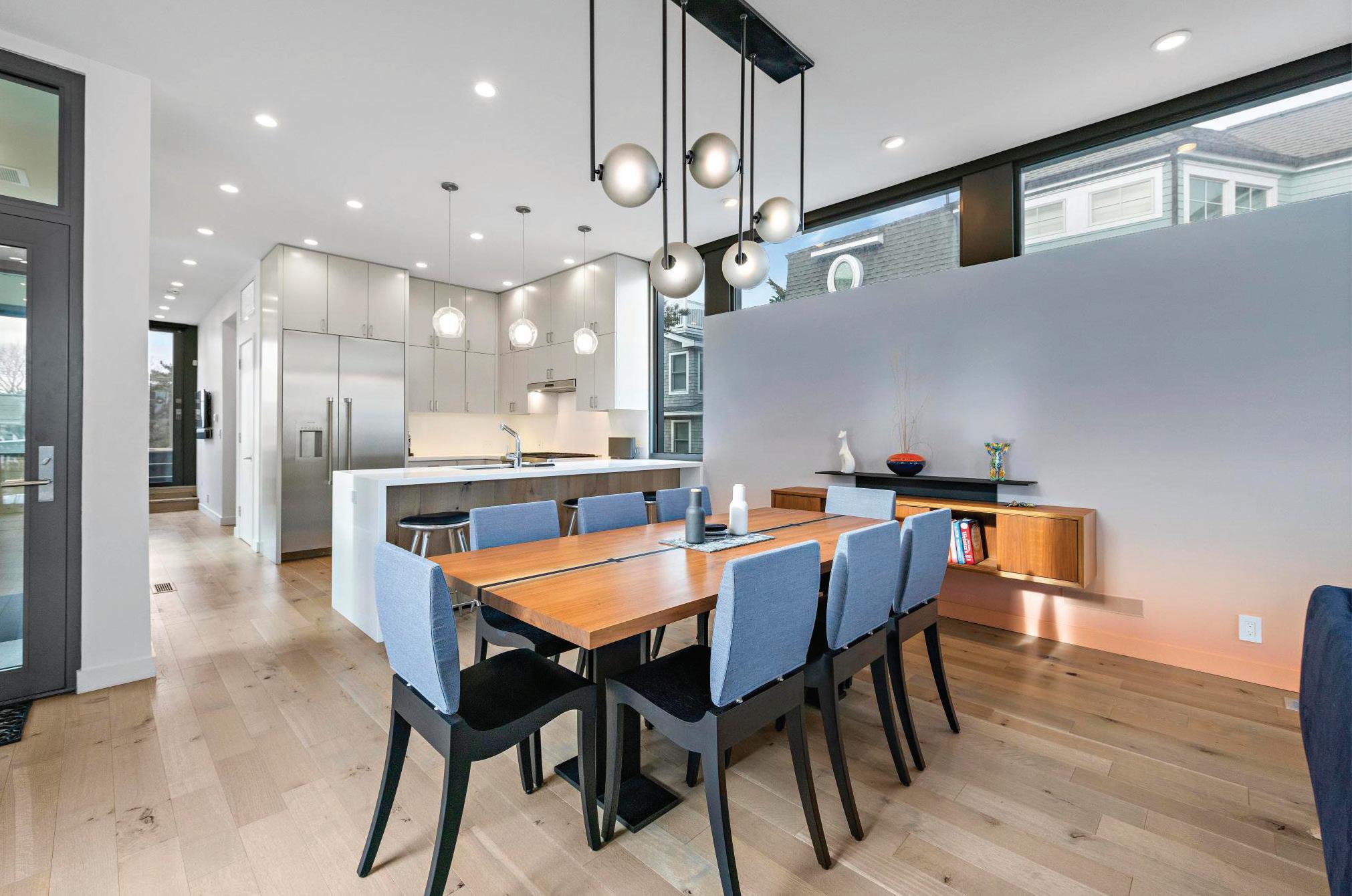 Kim and beautifully crafted beds with trundles. An open, floating staircase leads down to the level below, which offers an open concept layout to carry the incredible seaside views throughout the space. A north wall of windows in the living room offers privacy through an architectural half wall, featuring ombre wallpaper from Calico & Co which echoes the unforgettable sunrise over the ocean. A Kindred gas fireplace situated between windows along the ocean wall creates a stellar effect, masterfully blending the earthy elements of fire and water. Adjacent to the living room, the thoughtfully designed cook’s kitchen is truly suited for everyday use. With a Thermador suite of appliances, creamy gray floorto-ceiling cabinetry, and a breakfast bar perfect for hungry children, the space is built to accommodate family meals. The adjoining dining area features custom furniture from Chicago-based architect Richard Gorman. In his signature modern style, a walnut slab table with stainless steel legs and a coordinating sideboard stand out as an investment in beauty and functionality.