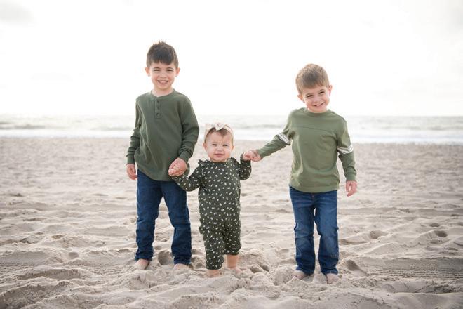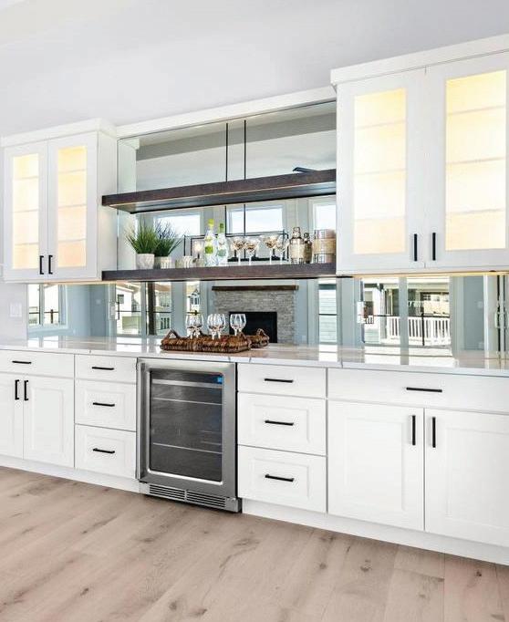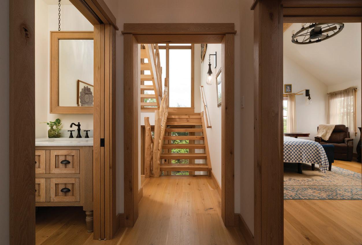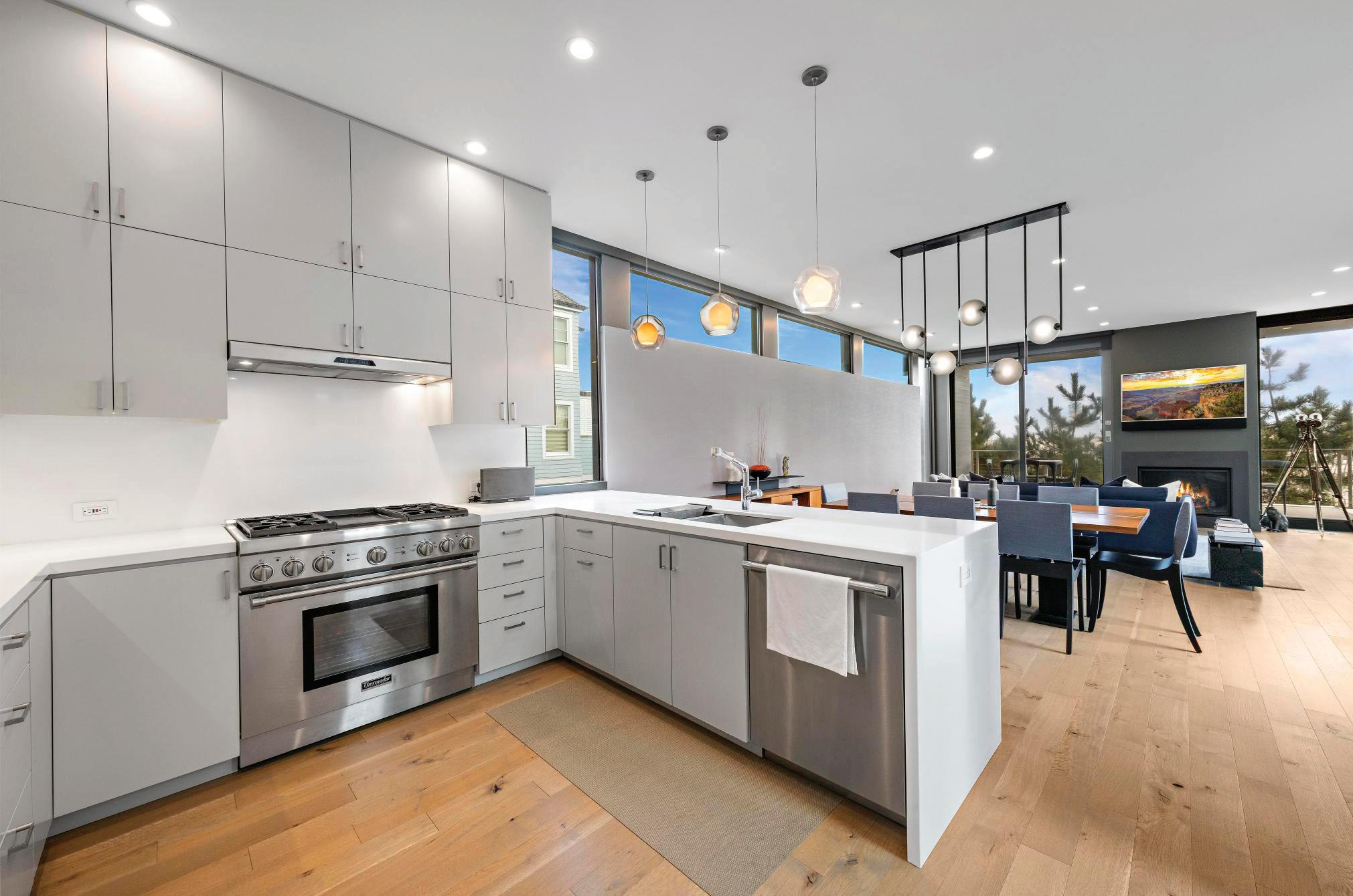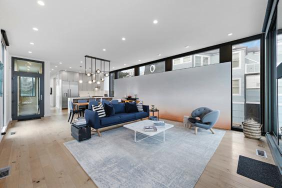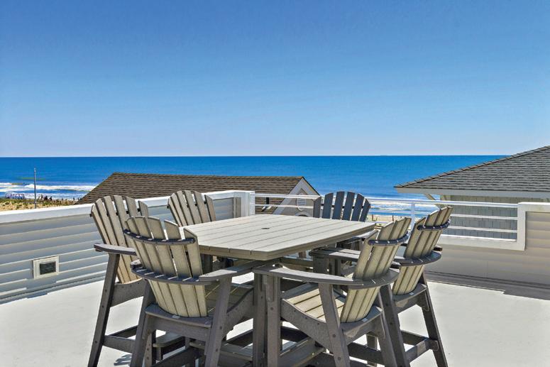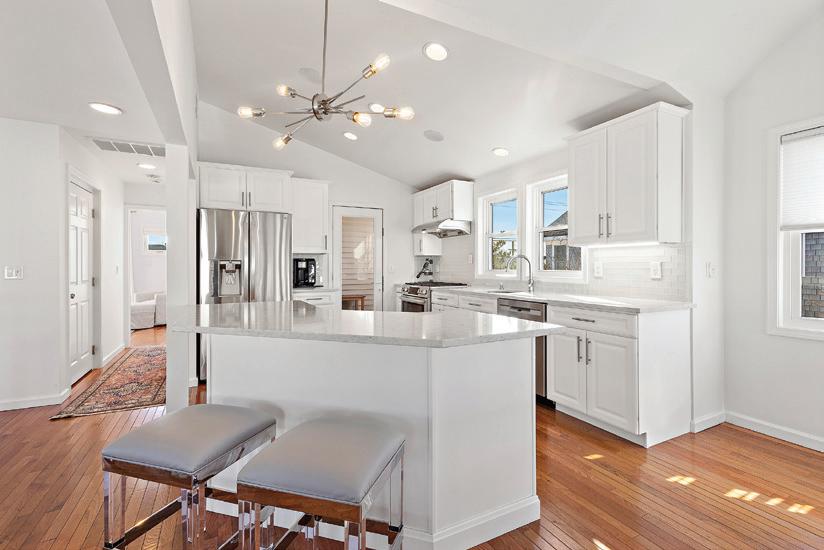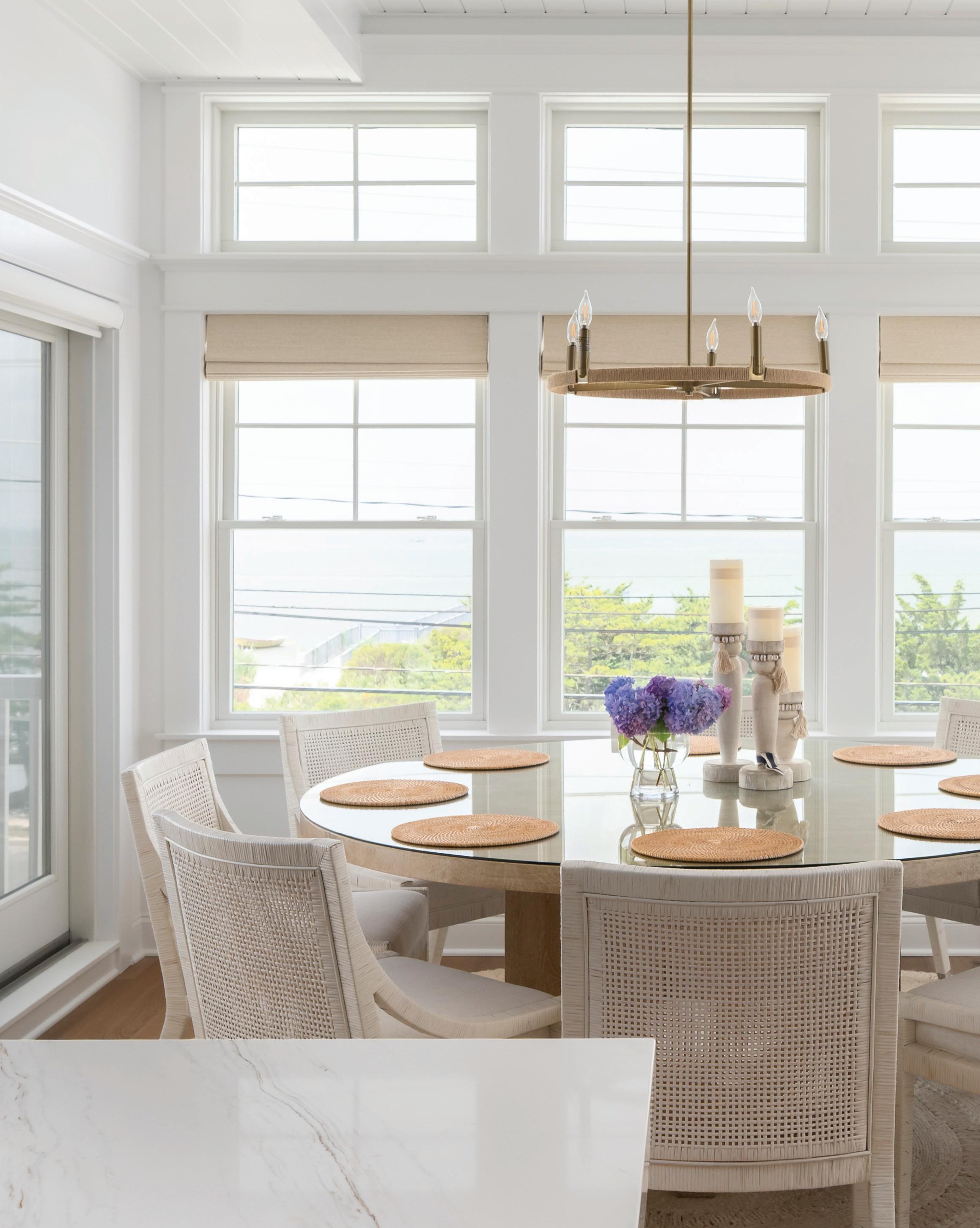 Kim and beautifully crafted beds with trundles. An open, floating staircase leads down to the level below, which offers an open concept layout to carry the incredible seaside views throughout the space. A north wall of windows in the living room offers privacy through an architectural half wall, featuring ombre wallpaper from Calico & Co which echoes the unforgettable sunrise over the ocean. A Kindred gas fireplace situated between windows along the ocean wall creates a stellar effect, masterfully blending the earthy elements of fire and water. Adjacent to the living room, the thoughtfully designed cook’s kitchen is truly suited for everyday use. With a Thermador suite of appliances, creamy gray floorto-ceiling cabinetry, and a breakfast bar perfect for hungry children, the space is built to accommodate family meals. The adjoining dining area features custom furniture from Chicago-based architect Richard Gorman. In his signature modern style, a walnut slab table with stainless steel legs and a coordinating sideboard stand out as an investment in beauty and functionality.