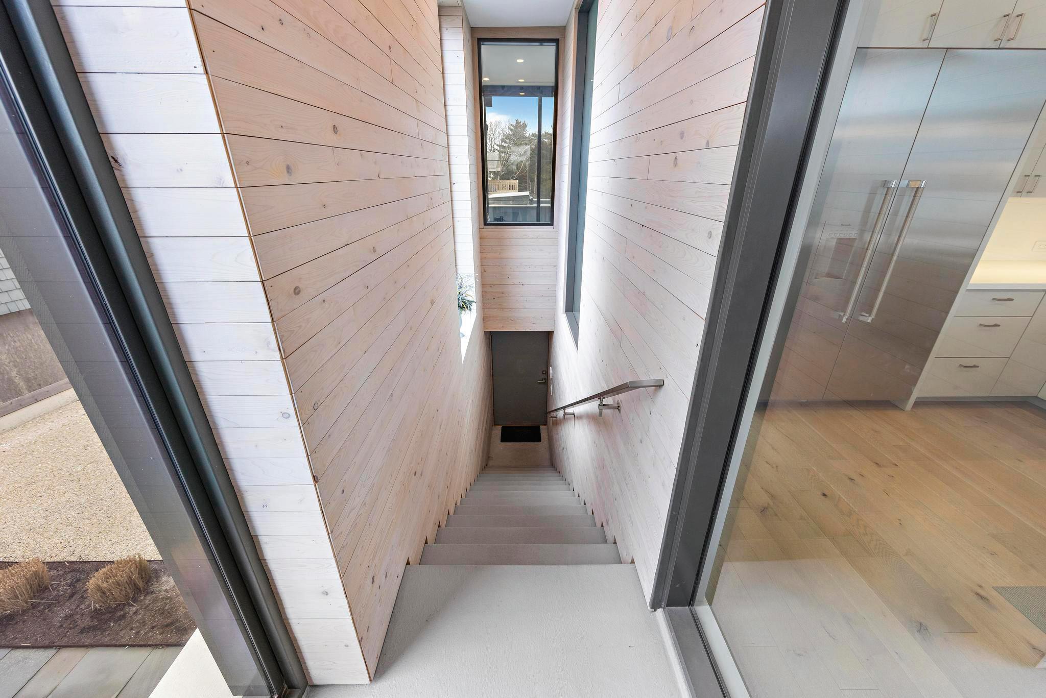 Expansive vertical windows surround the two floors of primary living space, creating stunning visual delight from both the inside and out. Horizontal red and white cedar siding envelops the