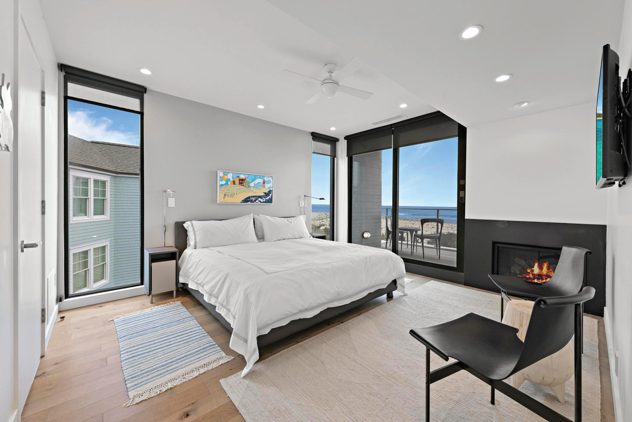 It’s a house that truly welcomes iconic pieces of furniture and artwork, featuring special, thoughtful touches in every space. The east and west walls of the interior are painted in charcoal, seamlessly blending with the enormous windows to create a sense of calm, framing the ocean views outside. Sleek, industrial-style light fixtures hang above the breakfast bar and staircase. A special nook off the main living room features a built-in bench loaded with pillows, an invitation for kids to have a little space of their own to watch tv and play video games. An additional bedroom tucked away beckons guests to enjoy the exceptional experience.
