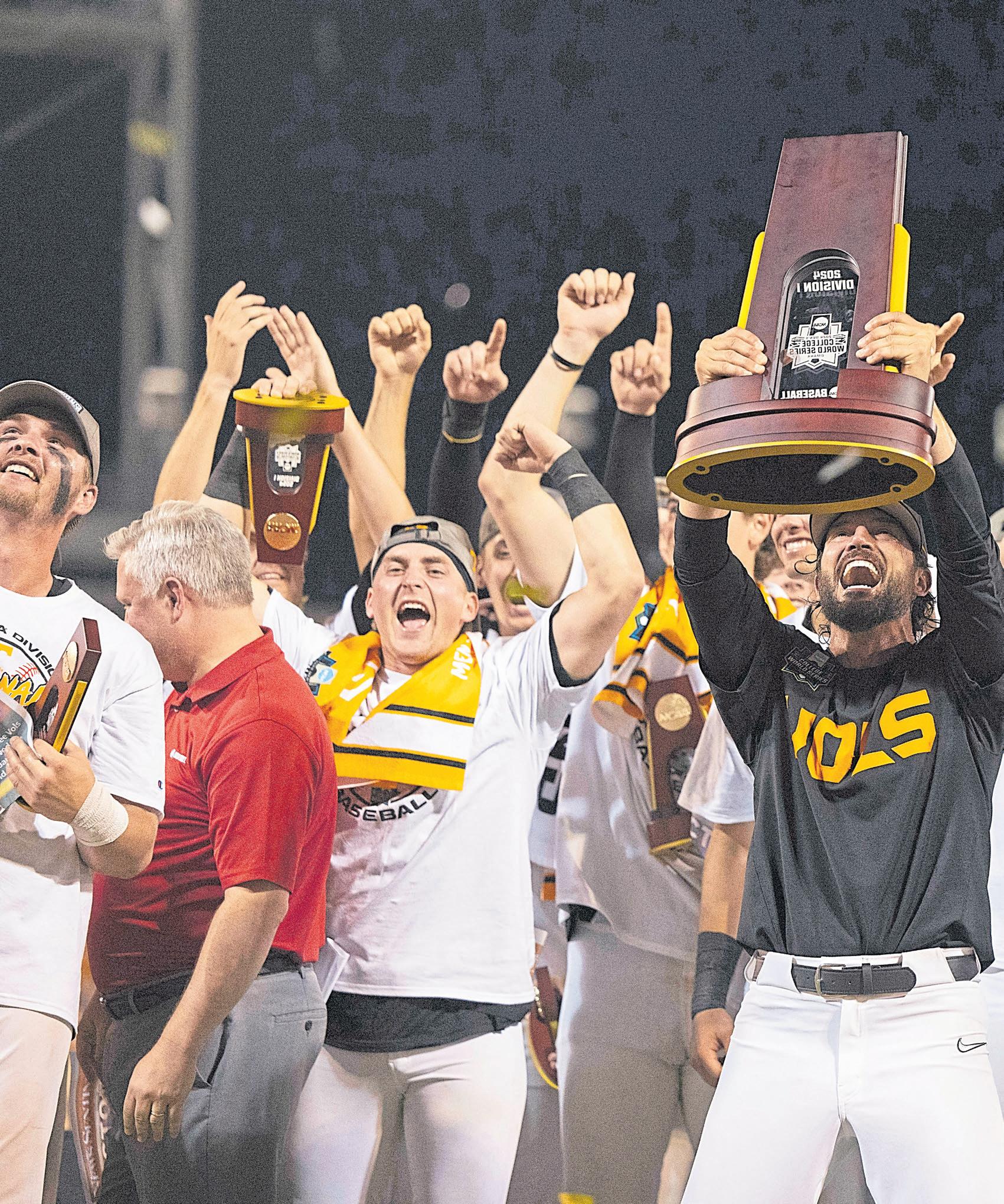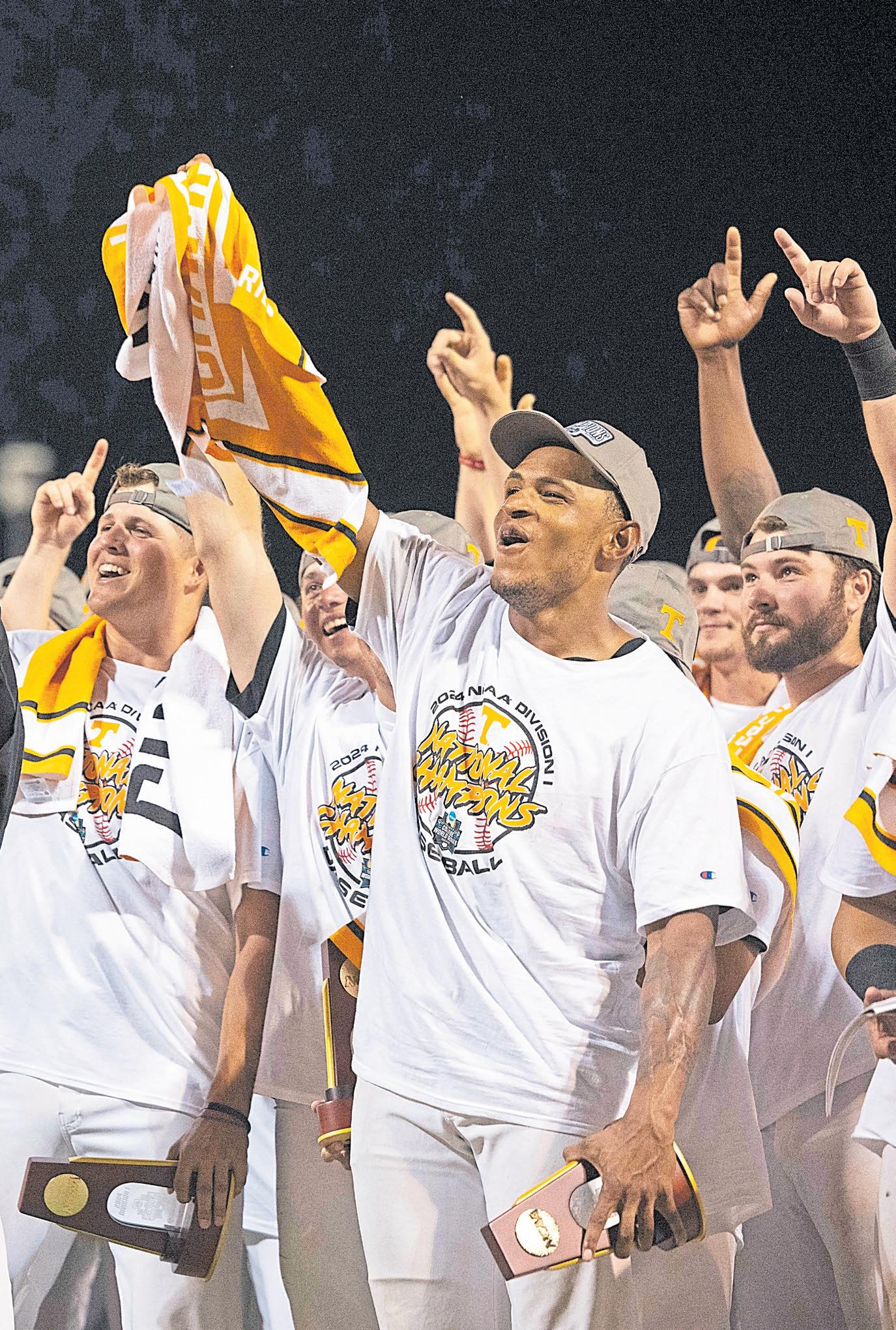 Tennessee coach Tony Vitello, center, hoists the championship trophy following his team’s 6-5 victory against Texas A&M in the 2024 NCAA College World Series.