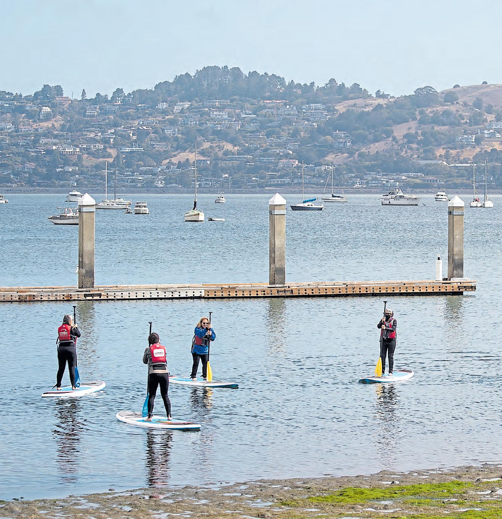 Sunlight hits the water like silver glitter as we strap leash cuffs to our ankles and scoot onto our paddle boards, pushing into the calm of Richardson Bay.
