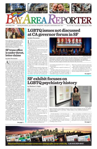 Serving the lesbian, gay, bisexual, transgender, and queer communities since 1971 www.ebar.com Vol. 52 • No. 34 • August 25-31, 2022 No. 673 May 27, 2021 outwordmagazine.com page 34 page 2 page 25 page 26 page 4 page 15 page 35 Todrick Hall: Returning to Oz in Sonoma County SPECIAL ISSUE - CALIFORNIA PRIDE! Expressions on Social Justice LA Pride In-PersonAnnouncesEvents “PRIDE, Pronouns & Progress” Celebrate Pride With Netflix Queer Music for Pride DocumentaryTransgenderDoubleHeader Serving the lesbian,gay,bisexual,transgender,and queer communities since 1971 www.ebar.com Vol. 52 No.16 April 21-27, 2022 3 Cannabis co. forming The See page by Matthew S.Bajko District SupervisorMattHaneyde-claredvictoryTuesday thespecial election San Francisco’s vacant 17th Assembly District seat based the initial vote count.Trailing in second wasDavidCampos, gaymanwhois vice chairofHaneytheCaliforniaDemocraticParty. took place with 64% of vote-by-mail ballots that the elections de- partment received and processed before Election while Campos received 36%. With3,306votesreceivedfrompollingplacwhere people cast their ballots in person Tuesday added Haney’s total vote count stood at 38,916 votes and Campos’ was 22,567Becausevotes.most ballots were expected be mailed in ahead Election Haney thanked voters for electing him the As- sembly seat representing the city’s eastern neighborhoods as soon the first election resultswereposted. “Firstresults out:We’reupbyover points. We won,” tweeted Haney. “Thank you so much to San Francisco voters, & to of our volunteers, donors, endors- ers, & everyone who worked so over 6 Camposmonths.” told his supporters as the first numbers came “it seem we goingto abletowinthisrace.” According to elections department it still approximately 16,400 ballots to countandexpected Christopher Robledo Haney winsbigin Assemblyrace Assemblymember-elect Matt Haney by Matthew S.Bajko Californialegislatorsareonceagainpushforward number of bills aimed improving the lives the state’s transgender and nonbinary residents.And due the legislative attacks on trans children in other states, lawmakers in Sacramento are also focused on assisting those youth and their parents who are trying access gender- affirminghealth by Cynthia Laird MayorLondonBreedhasmade official and appointed Crego as per- manent executive of FranciscoOffice TransgenderInitiatives. Crego, trans and nonbinary Spanish immitorgrant,hadbeenservingasactingexecutivedirecsince Farley, transwomanwhoheaded department since stepped down lastSeptemberafterleadingtheofficeforfouryears. Breed and Administrator Carmen Chu madetheannouncementApril The tional to the office’s efforts to promote safety and inclusion trans and gender-noncon- formingpeople,creating modelforotherlo- calgovernments follow.” Crego,34,said that one of his first priorities willbetostaffuptheoffice.Currently,thereare only three staff members, including him, and leaving the end the month, Crego said that ofCregotappedaspermanentED SanFrancisco’stransoffice 'PrEP Play' at NCTC ARTS 14 Filmfest faves CA Assembly Several LGBTQ-related bills are being heard Sacramento. Transissues topCALGBTQ legislativepush Sisters’ Easter party a hit TheSisters PerpetualIndulgence Easter backto Dolores ParkSunday,April thefirst since outbreakof COVID and crowd wasthrilled.Thisyear’sHunkyJesus “Black Woman (Brittany andthe Mary, was“TransgenderMaria Guadalupe” Zaldivar).Theday nearlytwo-dozen Sistersgathered Alley,betweenDolores Landers for commemorativestreet renamingof the toSisterVish-Knew after Sistersco-founder Vish-Knew, Kenneth Bunch.For onthat, story,page ARTS Sci-fi writing program REACH CALIFORNIA’S LARGEST LGBTQ AUDIENCE. CALL 415-829-8937 CA-LGBTQ-STRIP.indd 1 6/14/22 10:38 AM 02 05
