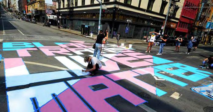 Volunteers put the finishing touches on a Black Trans Lives Matter mural at the corner of Turk and Taylor streets in August 2020.