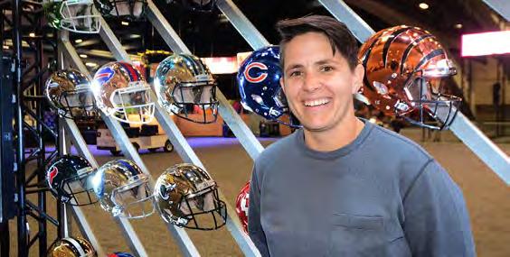 Amanda Ehrhardt stood in front of NFL team helmets at the Super Bowl Experience at Moscone Center.