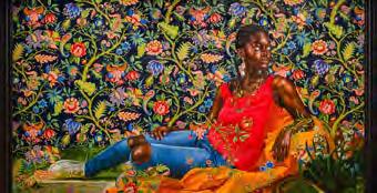 His massive portraits are colordrenched dense worlds of Black people reclining in deep backgrounds lush with leaves, flowers, branches and vines in various degrees of bloom and decay.