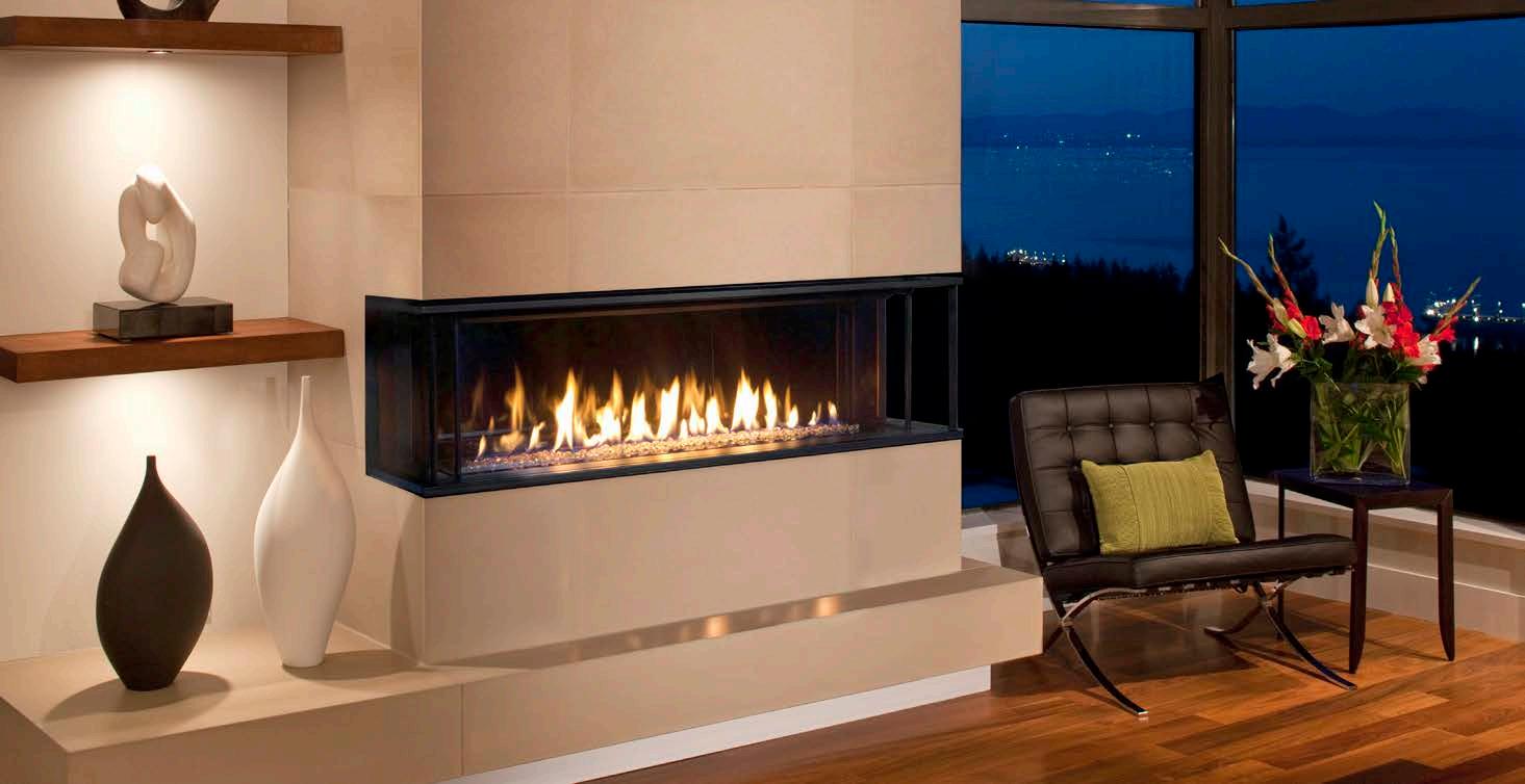Valor LX2 3-sided gas fireplace shown here with Murano glass, and reflective glass liner