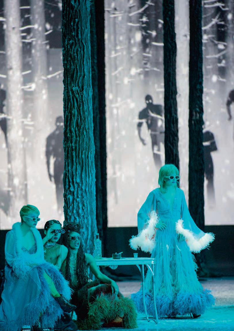 Im Jahr 2007 lenkte Warlikowski bei seinem Münchner Regiedebüt in Pjotr I. Tschaikowskis Eugen Onegin unseren Blick auf eine mögliche homosexuelle Beziehung zwischen dem Titelhelden und seinem Freund Lenski, was bei einigen Zuschauern und Kritikern Entrüstungsstürme provozierte. 2013 wurde die Premiere von Richard Strauss’ parabolisch aufgeladener und in spätromantisch sattem Sound schwelgender Die Frau ohne Schatten nicht nur durch den fulminanten Einstand des damaligen Generalmusikdirektors Kirill Petrenko zu einem Sensationserfolg. Da s feinfühlige psychoanalytische Durchleuchten der Konflikte um Annäherung und Begehren der beiden im Zentrum stehenden Ehepaare ließ ebenso mitfiebern wie die eindrucksvollen Bilder aus Alain Resnais’ʼFilm Letztes Jahr in Marienbad aus den 1960er Jahren mit dessen Schauplätzen im Schlosspark Nymphenburg als Seelenlandschaft sich (nicht) begegnender Partner. Manch einer wird sich außerdem erinnern an den Boxring, die Projektionen aus expressionistischen Filmen und die Nachstellungen legendär gewordener Kunstperformances in Franz Schrekers Die Gezeichneten, den leichtfüßigen Pas de deux mit dem Tod in persona einer sich in den Wahnsinn tanzenden Salome oder die spektakuläre Breakdance Show inmitten eines verschneiten Waldes bei D ido and Aeneas … Erwartung, wo die szenische Verschränkung einer Barockoper mit der atonalen Musik Arnold Schönbergs gelang. Für die choreographischen