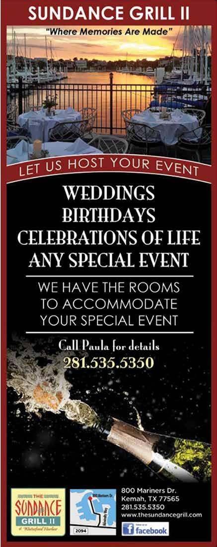 of the chamber; and Board Members Naseema Mohamed, Hank Dugie and Jimmy Fullen. Some of the others in the crowd included League City Director of Economic Development Scott Livingston, attorney Duana Boswell, soonto-be Clear Lake Chamber Chairman Rebecca Lilley, Galveston County Commissioner Dr. Robin Armstrong, and Pastor Steve Rhoades of Bay Harbor Methodist Church, and candidate for Galveston County constable Blake Patton