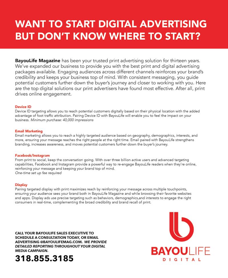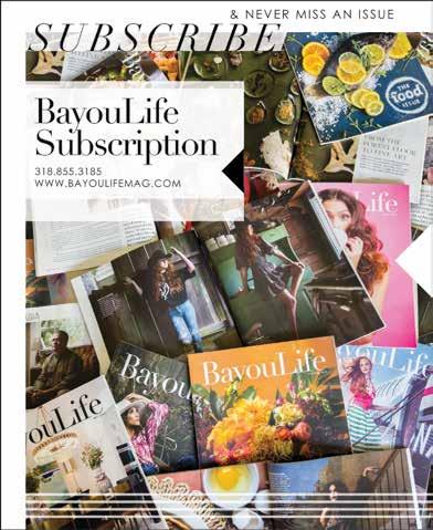 BayouLife Magazine is published and distributed by Redbird Publishing, LLC. Postal subscriptions ($30) can be ordered online at www.bayoulifemag.com. BayouLife Magazine is not responsible for unsolicited photographs, manuscripts, or other materials. Opinion columns do not represent the views of the publisher. Reproduction of contents without express written permission is prohibited.
