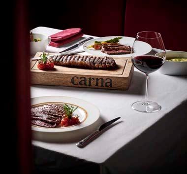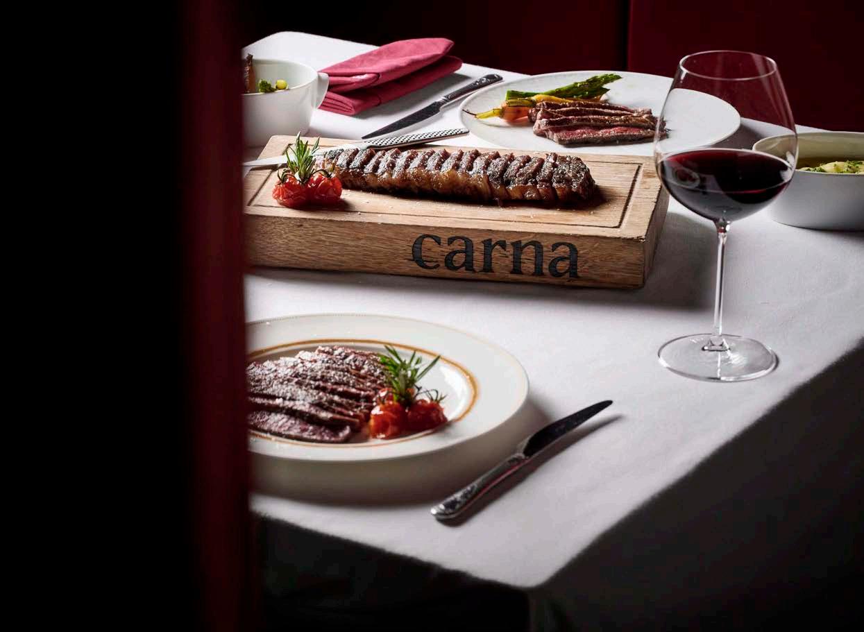 meats. Take your pick from the Wagyu Tomahawk MB 8–9, Striploin MB 9+, Flap steak, Oyster blade or Flank. Carna presents a diverse range of cuts, each prepared to highlight its unique texture and character. Signature dishes such as the Oven-roasted whole veal shank and Slow-braised wagyu short rib further demonstrate Carna’s dedication to Dario’s ethos. In perfect balance, Carna also unveils a vibrant selection of vegetarian and plant-based dishes that reflect the same creativity and attention to detail as the meat selection. Highlights include the Baked cauliflower with roasted cauliflower purée, romesco sauce, hazelnut, and garlic manchego cheese, the umami-rich Josper roasted eggplant with pesto yoghurt, mustard miso glaze, pickled mustard, and almond, and the delicately prepared Corn agnolotti with sage and corn emulsion. Desserts offer the perfect ending to this dining experience, with signature creations including the Carna tiramisu with smoked mascarpone cream, the light Chocolate mousse with hazelnut praline, and the refined Pistachio ice cream drizzled in Dario’s olive oil. Paired with an expertly curated beverage list, the new menu brings together bold flavours, craftsmanship, and conviviality, offering an experience for meat aficionados and plant-forward diners.