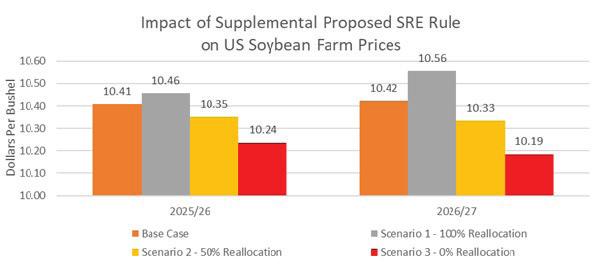 Clean Fuels Alliance America shared with U.S. EPA Administrator Lee Zeldin projections of the economic impact for U.S. soybean farmers and processors of EPA’s proposed supplemental “SRE reallocation volume” to the 2026 and 2027 RFS volumes. EPA is co-proposing to either fully (100%) or partially (50%) account for the 2023-25 small refinery exemptions granted this year by adding a supplemental volume in 2026 and 2027. The agency is also taking comment on other volumes, including 0%.