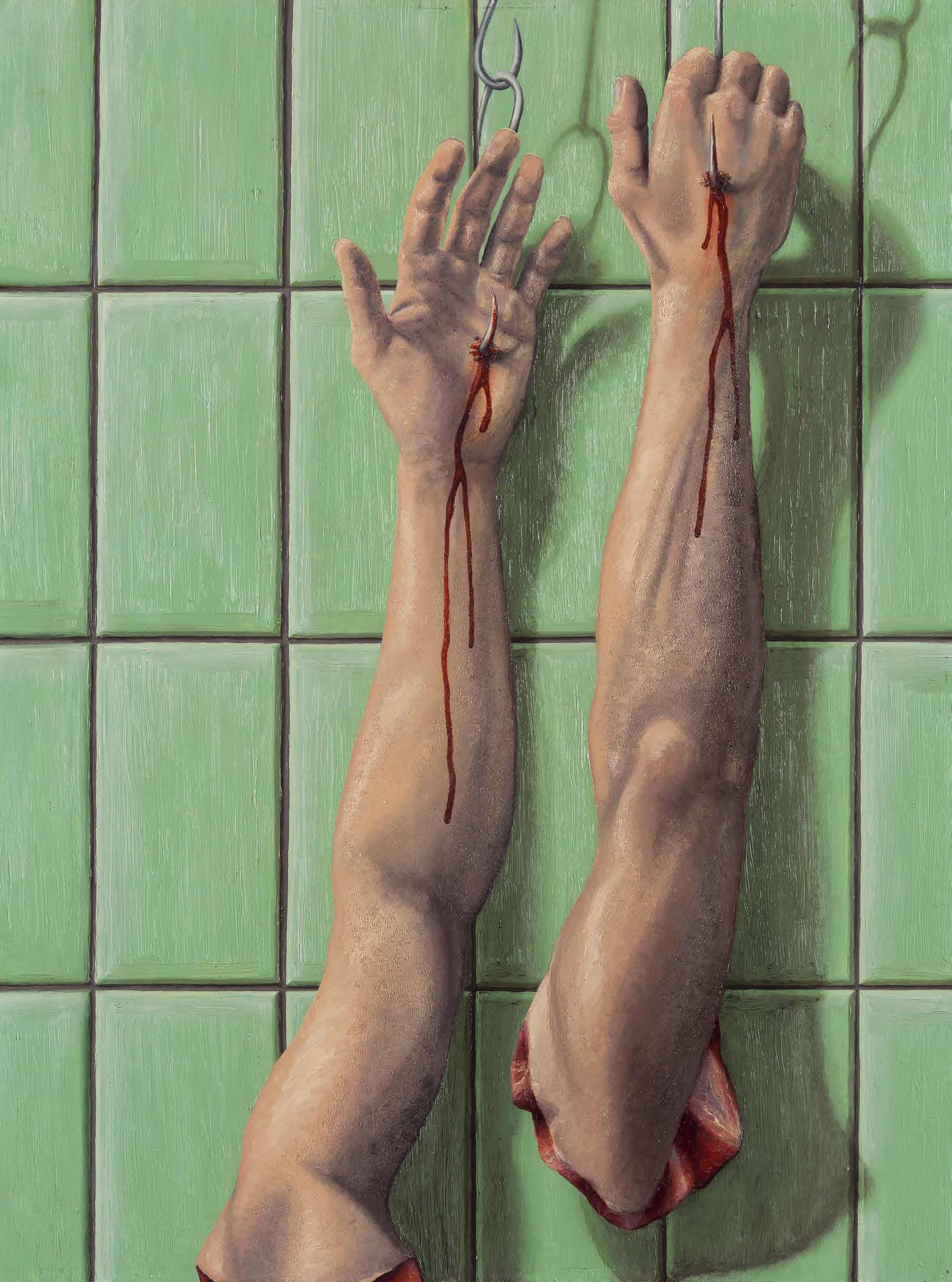 The week Suidman worked as a temporary employee in a Utrecht abattoir inspired a number of his most characteristic paintings such as The Slaughterhouse (1998-99), ‘a bloody representation of man as a meat product’. ‘The cheerful butchers in the foreground are in stark contrast to the those dying on the back wall in anguish’, he wrote on his website. Blood became a recurring theme in his oeuvre, even though many of these works remained unsold, with the notable exception of The Butcher (2002): it was purchased by the Centraal Museum in Utrecht after his death.