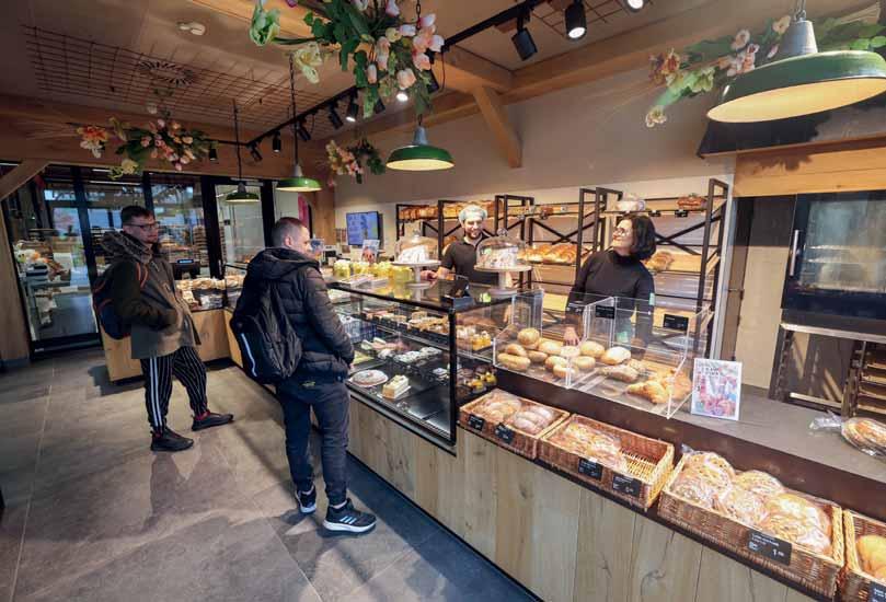 Door een scheidingswand wordt het ovengedeelte van de daarachter liggende banketbakkerij gescheiden, zodat de warmte niet op de koele ruimte afstraalt. De oven staat aan de straatkant. Als er gebakken wordt, gaat de buitenpui open en zien klanten hoe de warme broden, broodjes en andere lekkernijen uit de rotatieoven rollen. De geur helpt mee de verkoop te stimuleren. ‘Klanten kunnen al om zes uur terecht. Er zijn veel mensen die er gebruik van maken’, vertelt Dennis. ‘Ze rijden langs voordat ze naar hun werk gaan. Als we hier toch zijn, kunnen we ze net zo goed helpen, is ons uitgangspunt. Eerder hielpen we mensen die uit het nachtleven kwamen nog vroeger. Die kwamen af op de broodjes die buiten stonden af te koelen, maar daarmee zijn we gestopt. Er wonen hier mensen in de buurt, dat gaf te veel rumoer.’