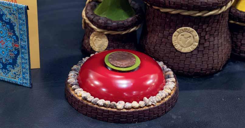 verder, op het thema Celebrations ditmaal, dat het 25-jarig jubileum van het patisserieteam omlijstte. In 2022 maakte ze een taart gebaseerd op een creatie van toppatissier Frank Haasnoot. ‘Frank gaf me toen tips om het taartje mooier te maken’, vertelt Noa. Die tips nam ze mee voor 2024. ‘Ik was de vorige keer niet tevreden over de vorm en de technieken. Ik wilde de interieurs anders hebben. De eerste keer werkte ik met getoerd gerezen, daar heb ik veel minder mee, dat werd een grote flop. Wat voor mij vooral belangrijk was, was dat de taart uitgebalanceerde smaken zou hebben. Ik wilde bepaalde mondgevoel-structuren creëren en ik wilde smaken geïnspireerd op India gebruiken. Het moest “gewoon” heel lekker smaken. Het zijn eigenlijk twee taarten die zijn samengevoegd’, vertelt ze. Tom vult aan: ‘Heel anders dan anders en daarmee heeft ze de jury weten te prikkelen. Het ene deel is een gebakken taartje met een heel dunne bodem, de andere helft is opgebouwd uit een mousse en cremeaux.’
