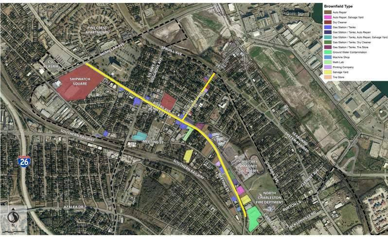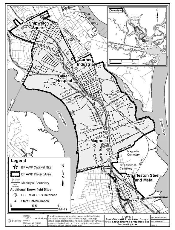The BF AWP project area focused on a 4.3 square mile corridor in the Neck Area which included five key catalyst brownfield sites: Baker Hospital, Shipwatch Square, Carner Industrial, Magnolia and Charleston Steel and Metal. As the work plan was being developed, it was noted that four of the five identified key catalyst sites were either under construction or being planned/developed by others and it was recommended that new focus sites be identified within the BF AWP Project Area.