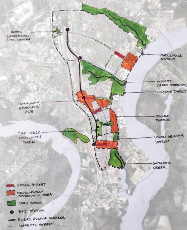 Through their study, they determined that there are four key communities within North Charleston: Park Circle District, Noisette District, Chicora District and Union Heights Districts. The areas were identified as walkable areas that serve as neighborhood gathering places, provide access to amenities and services, provide access to open space, are centers for community outreach and have connections to the broader area by way of Rivers and Spruill Avenues. They then used this “district” breakdown of the region to give potential locations for three key centers/areas: