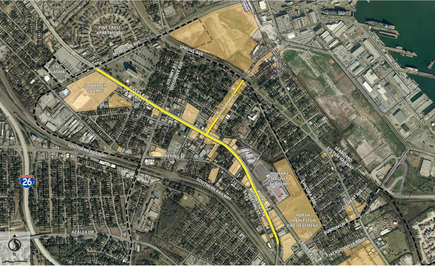 The planning corridor focuses on Rivers Avenue running south from its intersection with McMilllan Avenue to where it crosses over the Southern Railway and where Carner Avenue intersects with Burton Lane. The corridor includes four key intersections, as well as Reynolds Avenue between Meeting Street and Spruill Avenues. While Charleston County government does own several key properties and provides various services within the planning corridor, all properties are within the jurisdiction of North Charleston.
