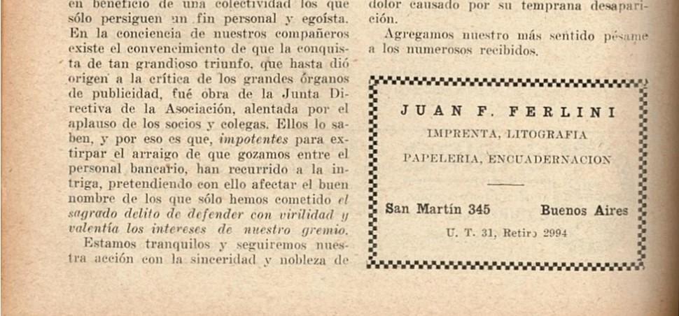 Boletín de la Asociación Bancaria Nacional : órgano informativo del personal bancario. Cambio de título: hasta 1934 como Boletín de la Asociación Bancaria, titulo posterior “Acción Bancaria” a partir de 1935, continuo con el mismo propósito inicial, ser una vía de comunicación entre la Asociación Bancaria y los empleados bancarios de todo el país. Existencias en la colección impresa: Existencias: 1928-1934. (Boletín). 1935-1948, (1949-1954), 1955-1957. (Acción Bancaria). Numero presente en la colección impresa de la Biblioteca Tornquist), solicitar por: BCRA-BT:REV. 216.2. (a. 1, n. 1, jul. 1928.)
