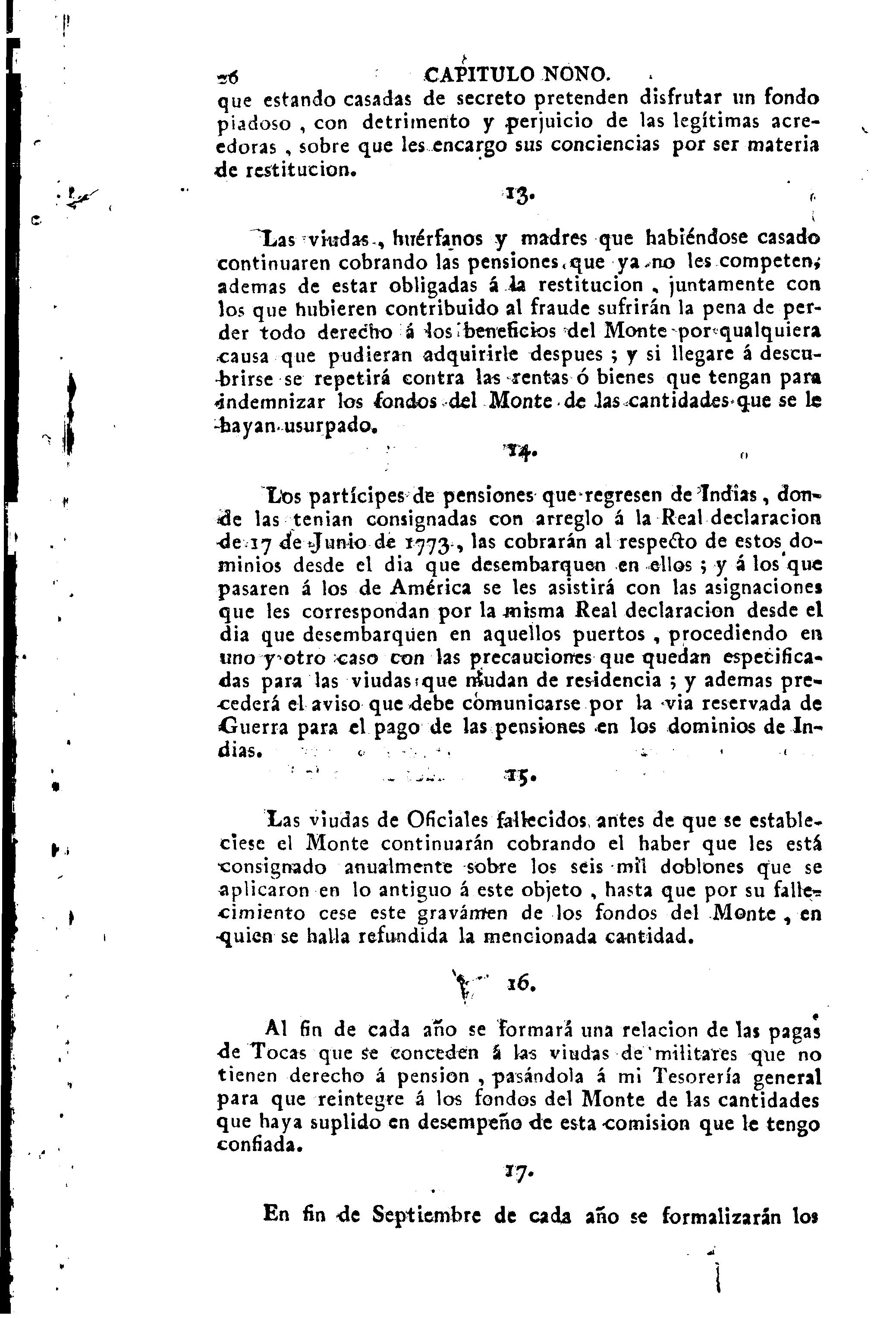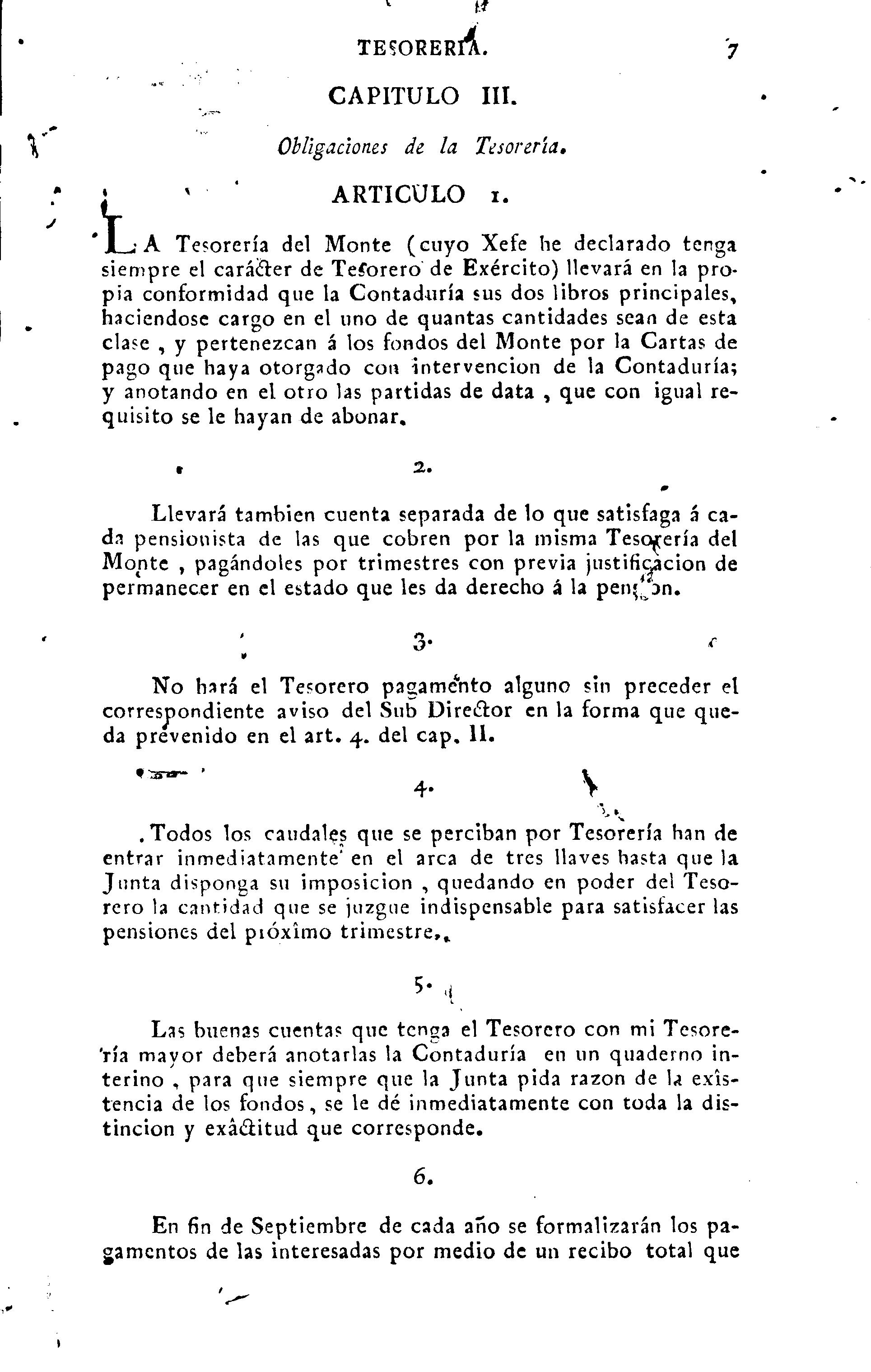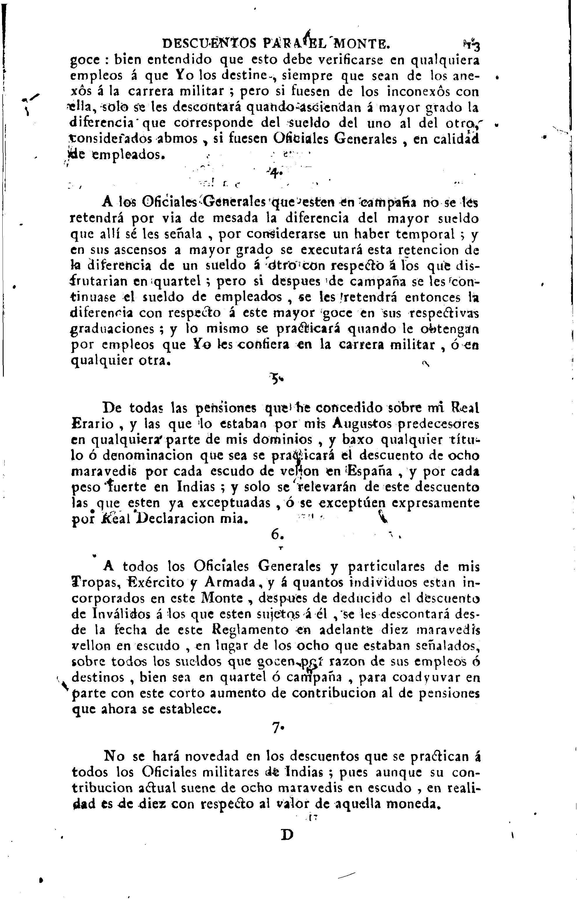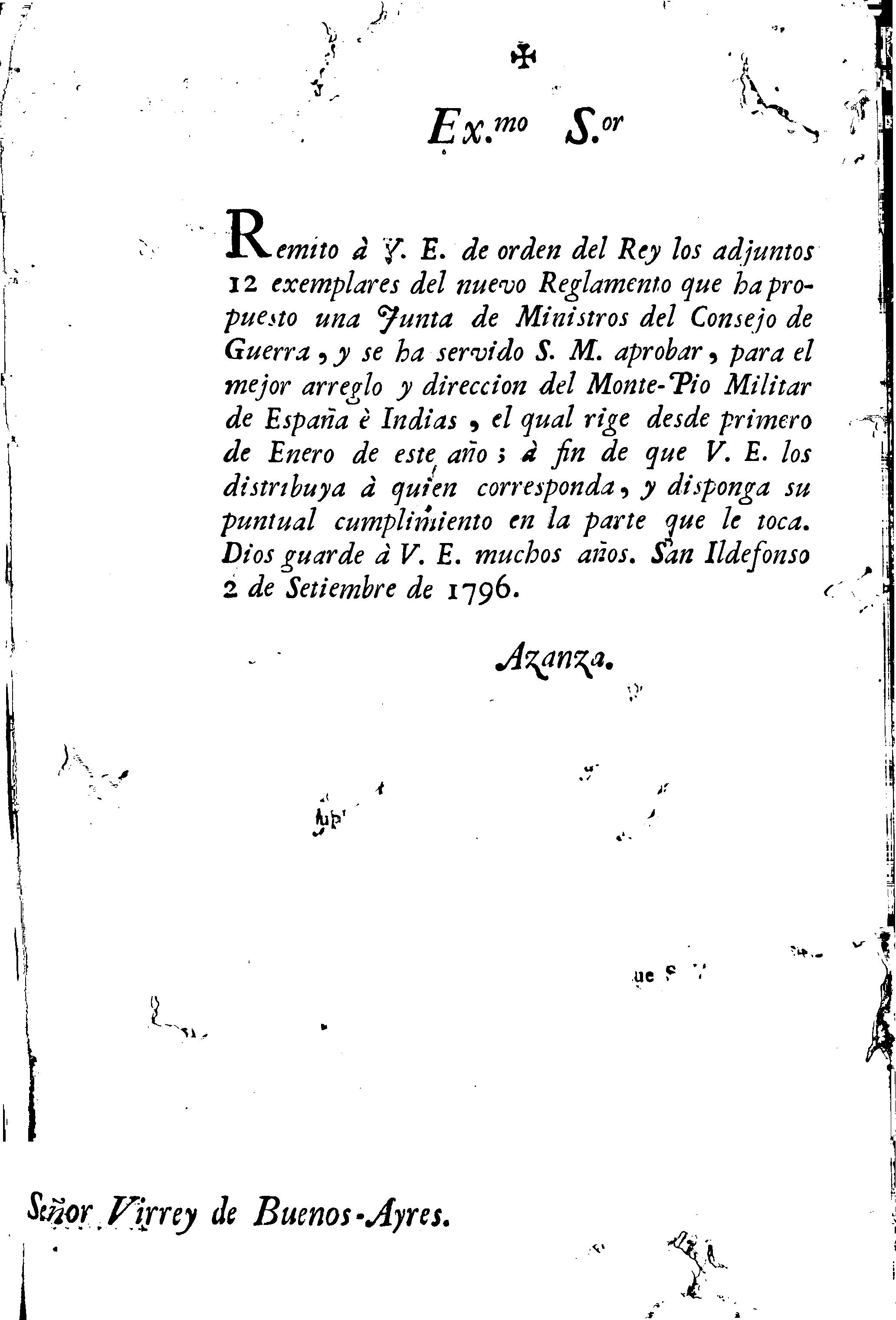 Este reglamento de 1796 dictado por orden del virrey Don Pedro de Melo fue reimpreso en Buenos Aires por primera vez el año 1800. Incluye normativa vigente en la época virreinal para la administración del Monte Pio, era un fondo de dinero acumulado en base de descuentos a honorarios para la administración de jubilaciones y pensiones. EPIGRAFE: Reglamento sobre los derechos de las familias militares contemplando pensiones, descuentos, pagamentos, entre otros. Acompañado de los documentos que justifican dichos derechos, poniendo en conocimiento al Subdirector del Monte, quién realizará las tareas pertinentes para dar a conocer a los capitanes generales, gobernadores, intendentes y demás jefes, verificando su cumplimiento y la utilización de los fondos restantes del Monte.