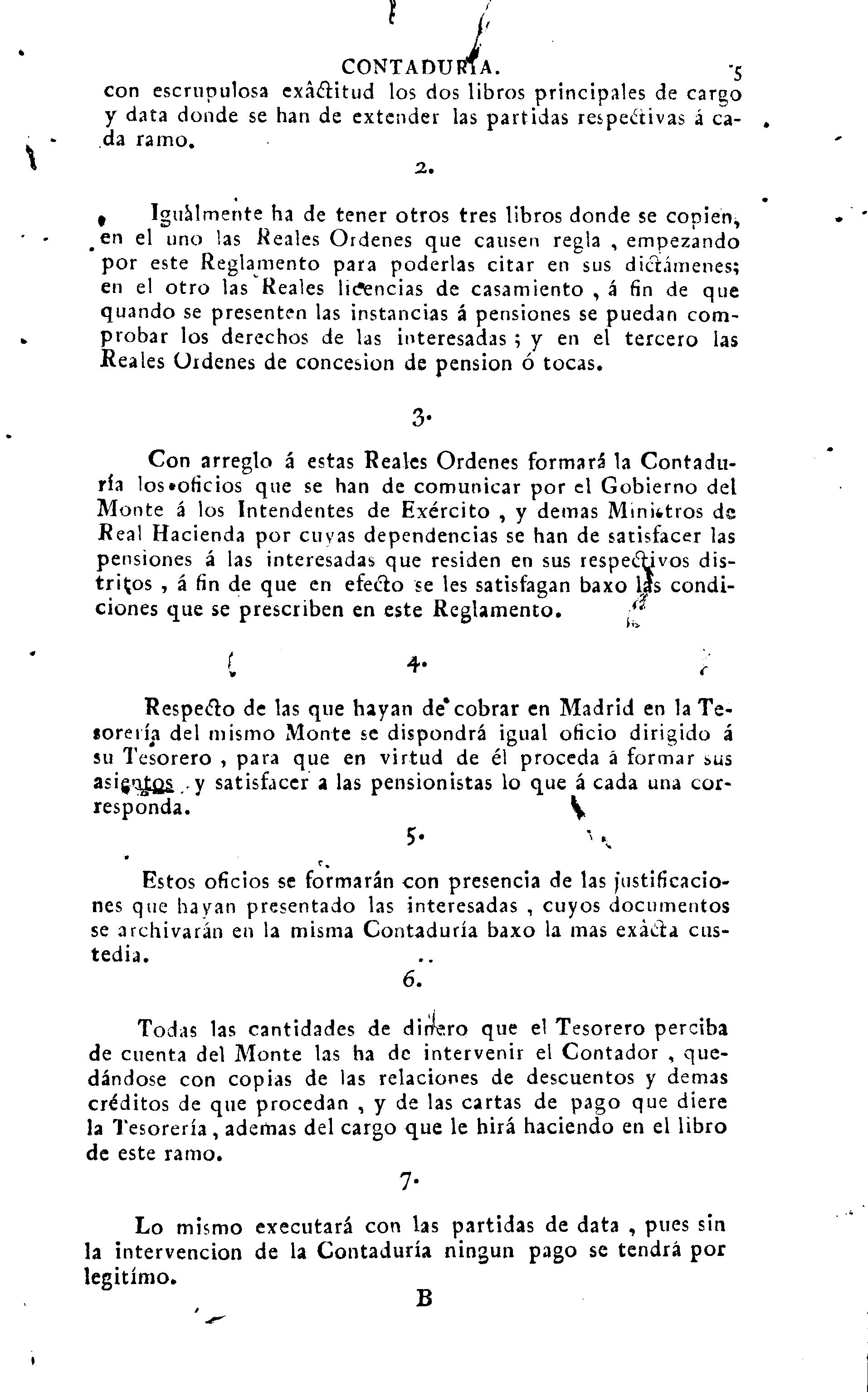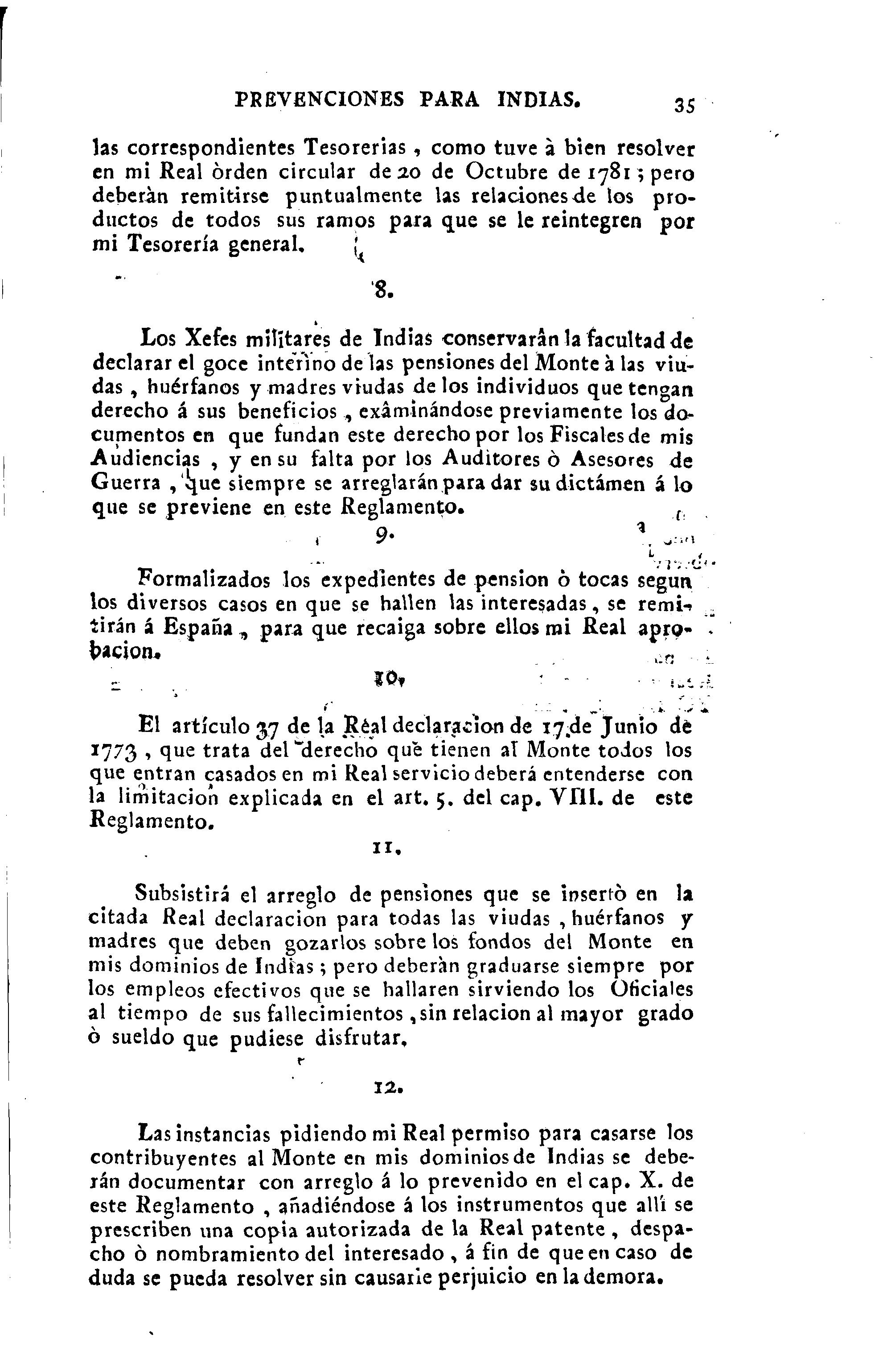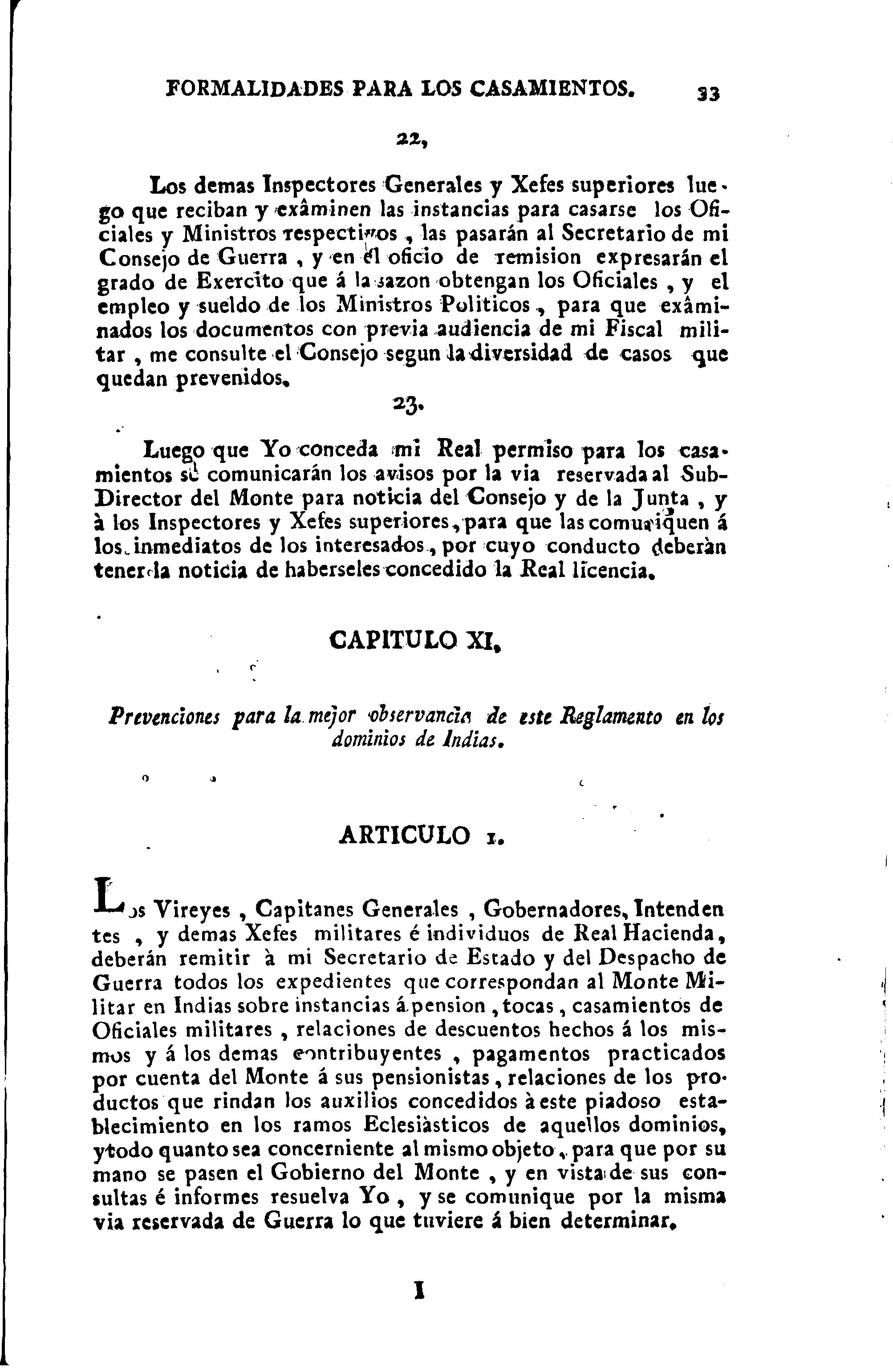 Este reglamento de 1796 dictado por orden del virrey Don Pedro de Melo fue reimpreso en Buenos Aires por primera vez el año 1800. Incluye normativa vigente en la época virreinal para la administración del Monte Pio, era un fondo de dinero acumulado en base de descuentos a honorarios para la administración de jubilaciones y pensiones. EPIGRAFE: Reglamento sobre los derechos de las familias militares contemplando pensiones, descuentos, pagamentos, entre otros. Acompañado de los documentos que justifican dichos derechos, poniendo en conocimiento al Subdirector del Monte, quién realizará las tareas pertinentes para dar a conocer a los capitanes generales, gobernadores, intendentes y demás jefes, verificando su cumplimiento y la utilización de los fondos restantes del Monte.