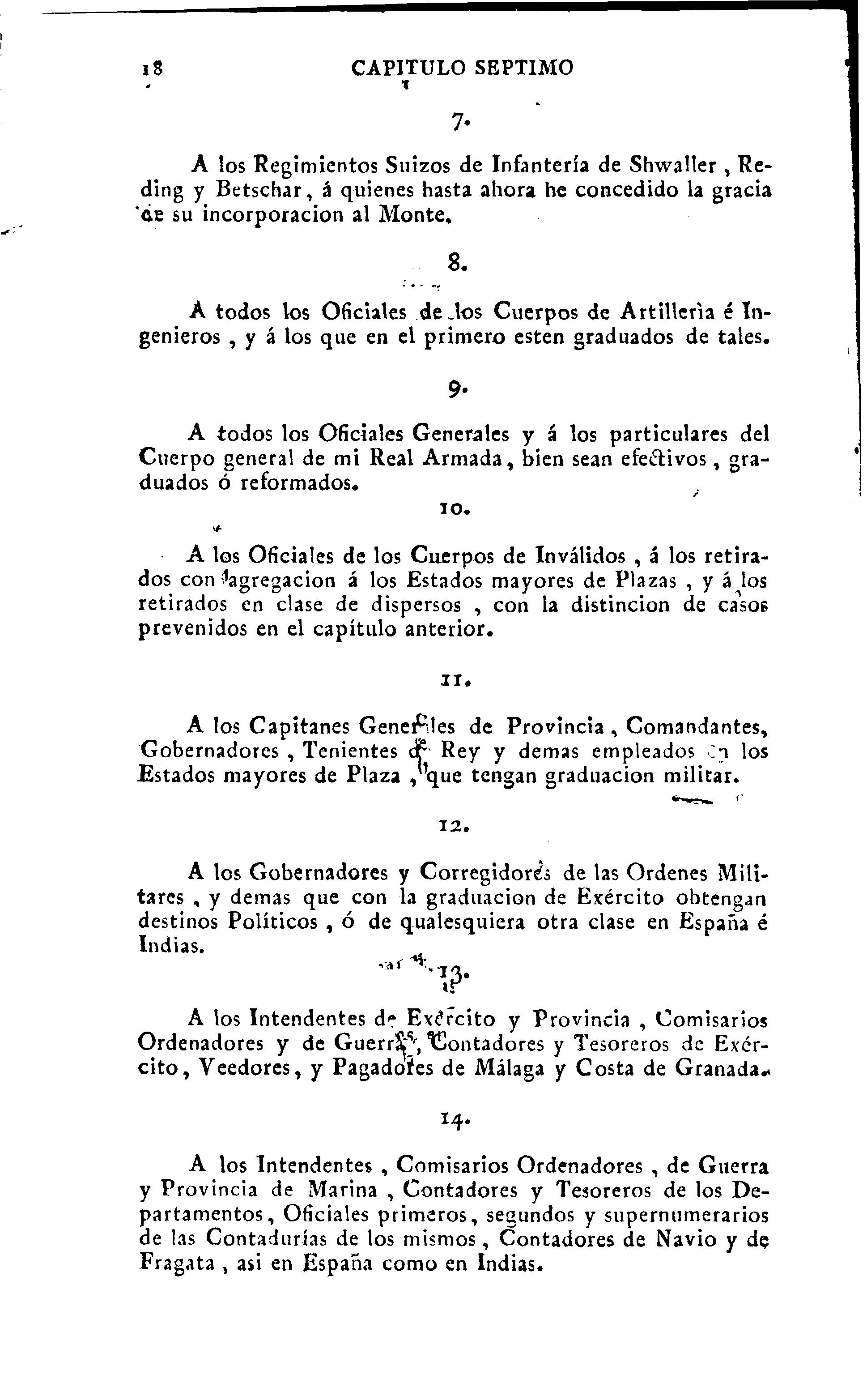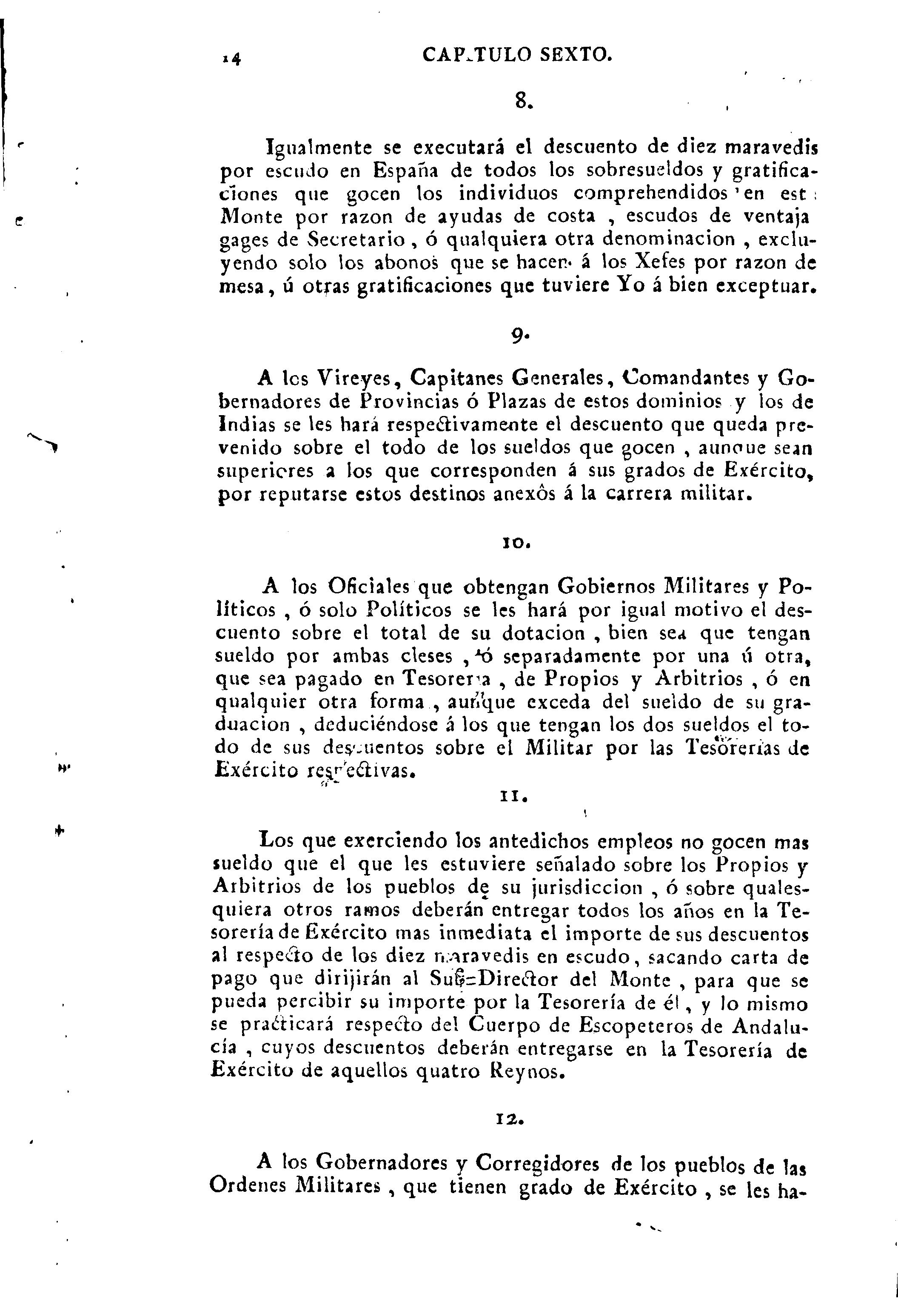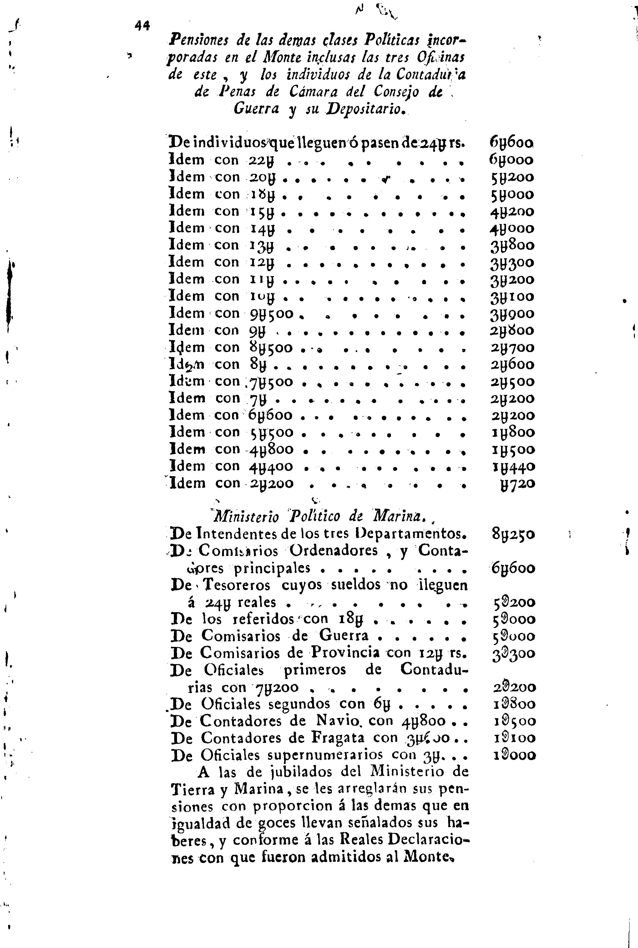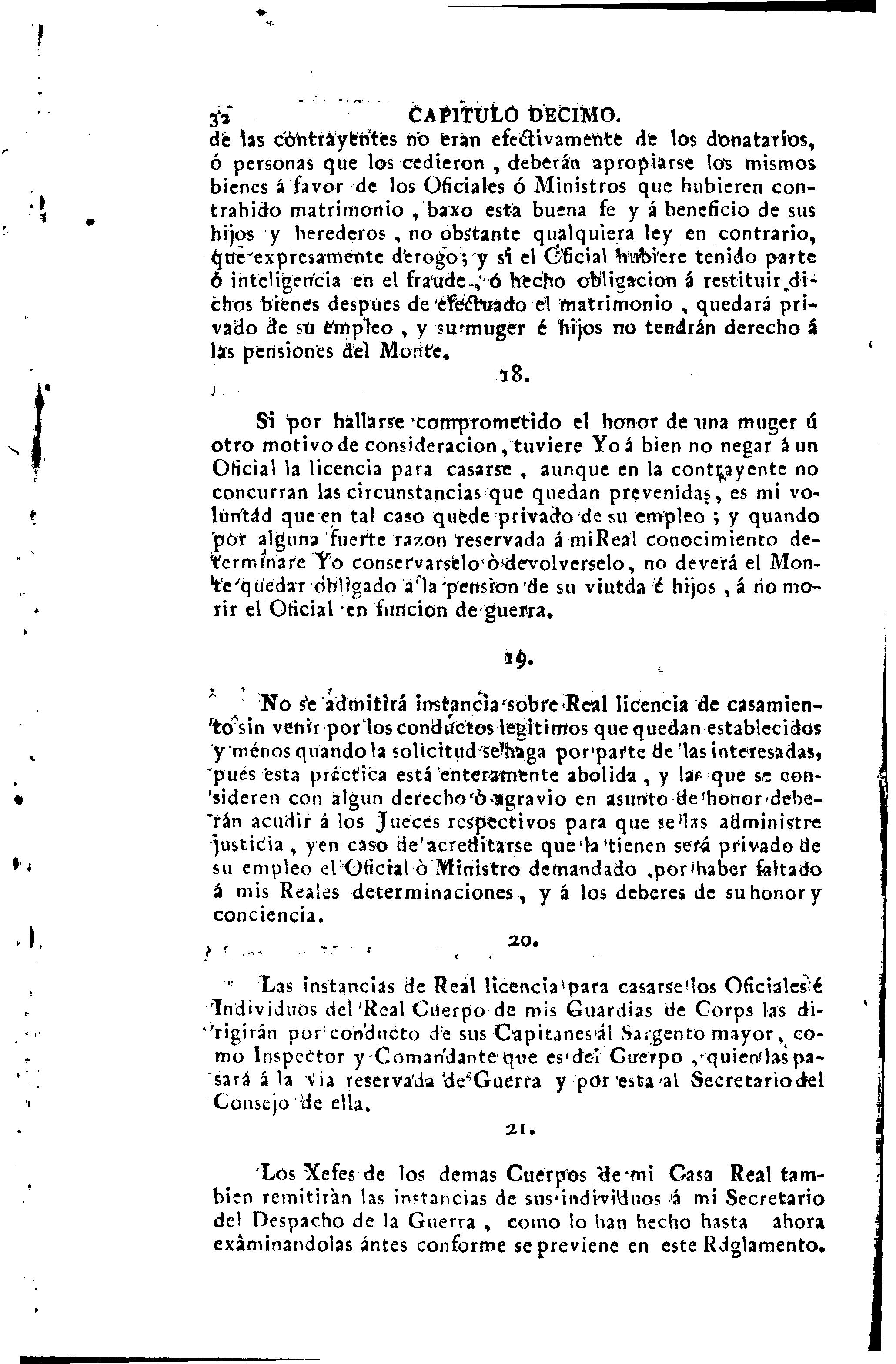 Este reglamento de 1796 dictado por orden del virrey Don Pedro de Melo fue reimpreso en Buenos Aires por primera vez el año 1800. Incluye normativa vigente en la época virreinal para la administración del Monte Pio, era un fondo de dinero acumulado en base de descuentos a honorarios para la administración de jubilaciones y pensiones. EPIGRAFE: Reglamento sobre los derechos de las familias militares contemplando pensiones, descuentos, pagamentos, entre otros. Acompañado de los documentos que justifican dichos derechos, poniendo en conocimiento al Subdirector del Monte, quién realizará las tareas pertinentes para dar a conocer a los capitanes generales, gobernadores, intendentes y demás jefes, verificando su cumplimiento y la utilización de los fondos restantes del Monte.