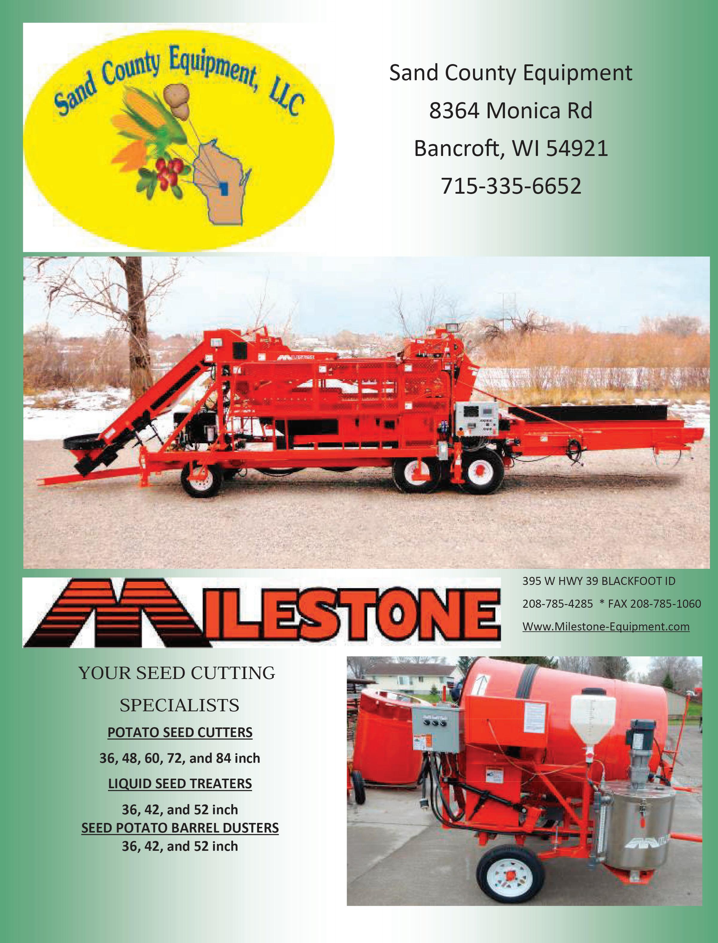 700 Fifth Avenue, Antigo, Wisconsin 54409 Subscription rates: $2/copy, $22/year; $40/2 years. Foreign subscription rates: $35/year; $55/2 years. Telephone: (715) 623-7683 Mailing address: P.O. Box 327, Antigo, Wisconsin 54409 Or, subscribe free online: http://wisconsinpotatoes.com/blog-news/subscribe/ ADVERTISING: To advertise your service or product in this magazine, call (715) 630-6213, or email: Joe Kertzman: jkertzman@wisconsinpotatoes.com. The editor welcomes manuscripts and pictures but accepts no responsibility for such material while in our hands. Quality Growers of Foundation and Certified Seed Potatoes for Over 50 Years! We handle our own line of clean and dependable late model trucks for all of your delivery needs. N3502 Hwy H • Antigo, WI 54409 Office: 715-627-7753 • Fax: 715-623-5412 • mike@baginskifarms.com Yellows: Colomba Whites: Superior Reds: Red Norland Modoc Russets: Norkotah #8 Burbank Gold Rush Mercury Silverton Plover Featuring Colomba An early maturing and high yield potential yellow variety. 5