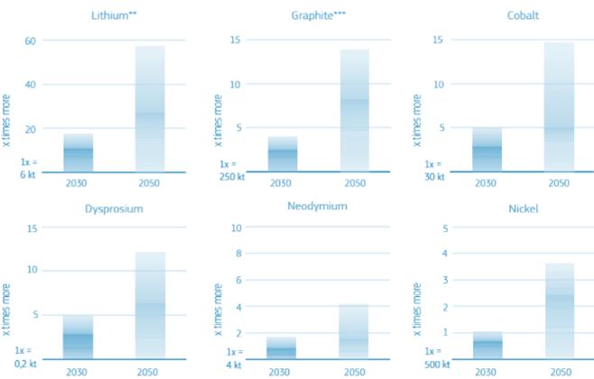 ▪ Europe has substantial raw material dependencies not only in energy raw materials but also in critical metals and minerals. Europe’s dependency on many mineral raw materials from China, for example, already outweighs its dependency on Russia for oil and gas. However, in the case of mineral commodities there are no national (strategic) reserves as there are for oil and gas. Global demand until 2050 compared to the year 2010 is forecast to rise by