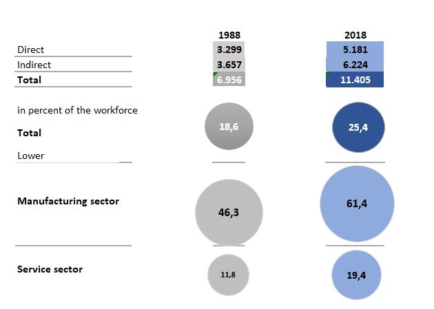 Trade disputes and geopolitical uncertainties are currently making life very difficult for the exportoriented German industry. This could ultimately have an impact on employment considering that the growth in jobs over the past 20 years can largely be attributed to the well-performing export business. A good 25 percent of jobs in Germany in 2018 were based on exports, compared to just 19 percent in 2018.16