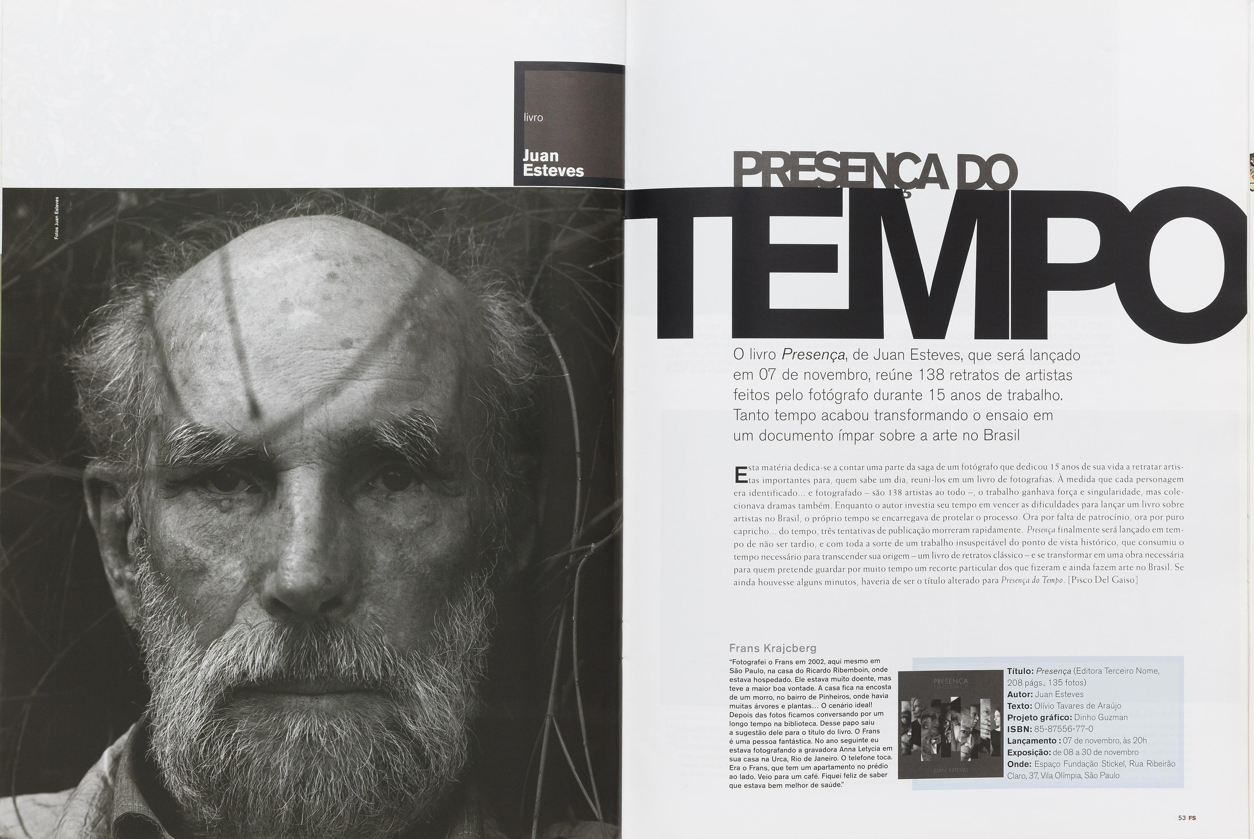 sta matéria dedica-se a contar uma parte da saga de um fotógrafo que dedicou 15 anos de sua vida a retratar artisE... importantes para, quem sabe um dia, reuni-los em um livro de fotografias. À medida que cada personagem era identificado... e fotografado são 138 artistas ao todo , o trabalho ganhava força e singularidade, mas colecionava dramas também. Enquanto o autor investia seu tempo em vencer as dificuldades para lançar um livro sobre artistas no Brasil, o próprio tempo se encarregava de protelar o processo. Ora por falta de patrocínio, ora por puro capricho... do tempo, três tentativas de publicação morreram rapidamente. Presença finalmente será lançado em tempo de não ser tardio, e com toda a sorte de um trabalho insuspeitável do ponto de vista histórico, que consumiu o tempo necessário para transcender sua origem um livro de retratos clássico e se transformar em uma obra necessária para quem pretende guardar por muito tempo um recorte particular dos que fizeram e ainda fazem arte no Brasil. Se ainda houvesse alguns minutos, haveria de ser o título alterado para Presença do Tempo. [Pisco Del Gaiso]