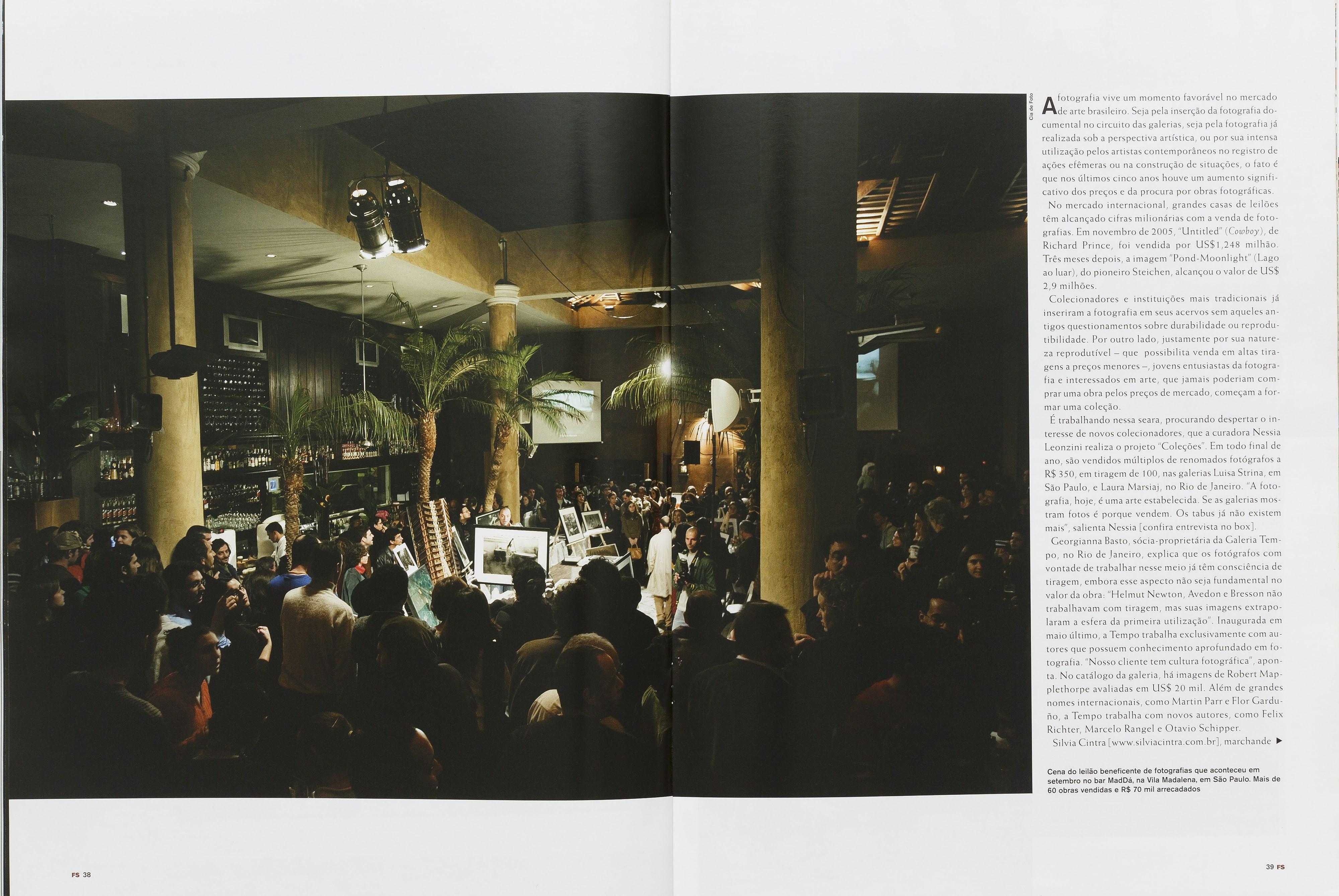 UMA! Esta edição de número 14 da FS traz, entre outros temas interessantes, uma matéria especial sobre colecionismo de fotografias. Nunca é demais atentar para o fato de que a fotografia vem ganhando espaço na vida das pessoas. Não me refiro aqui às pessoas diretamente interessadas nessa arte como fotógrafos etc. , falo de gente comum, que tem algum apreço por arte e disposição para lotar um bar numa noite chuvosa (o bar MadDá, palco de um leilão de fotografias que aconteceu em setembro, em São Paulo) para adquirir uma obra fotográfica. Embora o digital tenha trazido problemas na mesma medida em que trouxe soluções aos fotógrafos, o fato é que, se olharmos para além dos nossos umbigos e fotógrafos têm uma relação muito complicada com seus umbigos =, veremos que o universo imagético das pessoas vem se ampliando rapidamente graças ao contato diário com imagens de toda ordem, fenômeno contemporâneo que não deixará as coisas como estão. Esse leilão ligou as antenas de todos os envolvidos para a possibilidade real de repetir a dose anualmente e, quem sabe, com maior frequência até. Restam apenas algumas dúvidas, entre elas se um leilão independente e sem fins filantrópicos teria a mesma repercussão. As galerias que representam fotógrafos abririam mão de seus autores por uma noite, entendendo que ganhariam com isso a longo prazo? Como sofisticar a organização sem perder a informalidade e sem que o negócio deixe de ser convidativo para qualquer bolso? Quais seriam os critérios de seleção dos autores? Que fotografia, afinal, está sendo vendida como obra de arte? Nas páginas da FS (ver matéria na página 36), nas Semanas de Fotografia ou nas páginas virtuais do Fotosite, que no mês de setembro bateu a marca de 50 mil usuários distintos, essas e outras dúvidas devem ser respondidas. Dou-lhe duas...