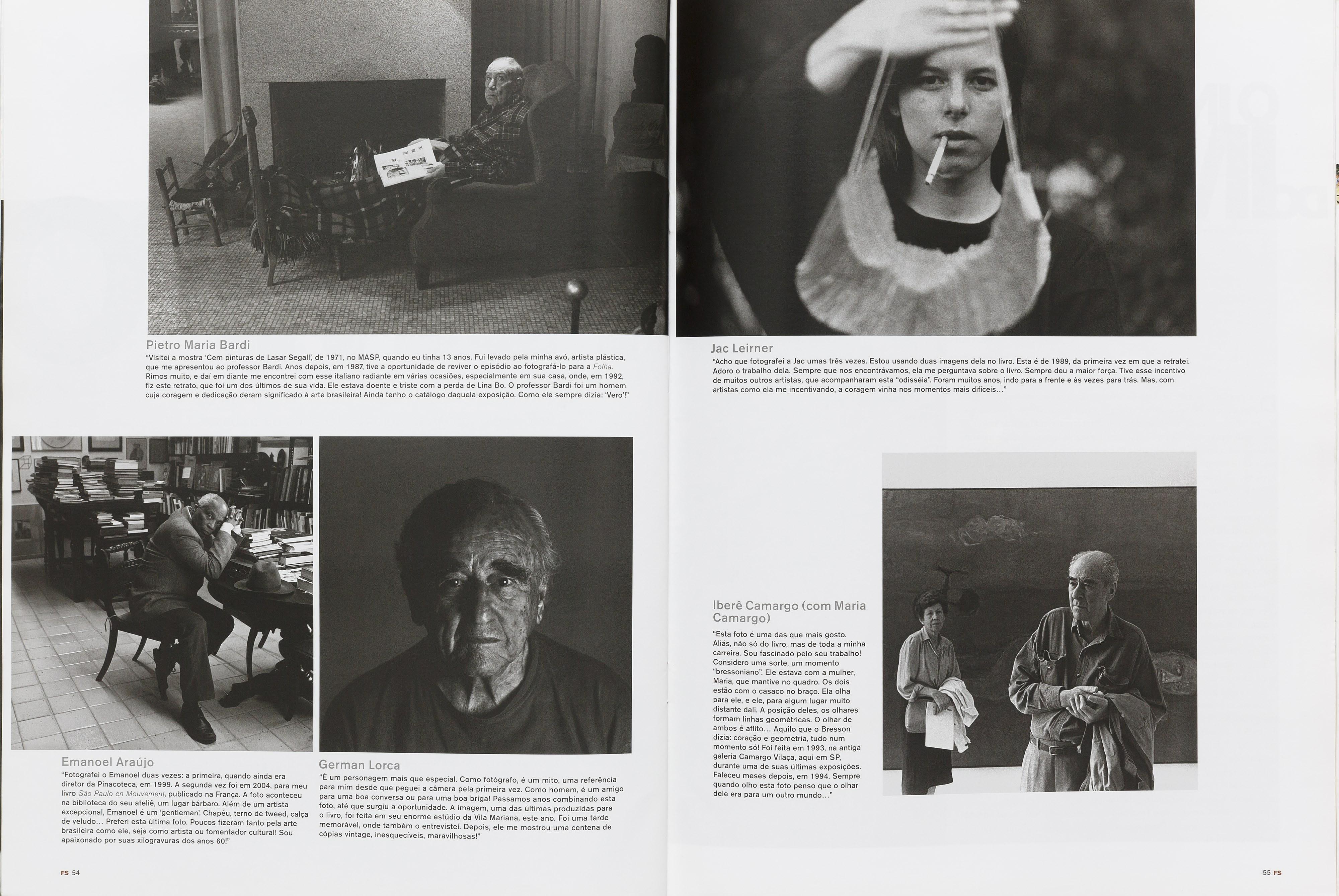 Esta foto é uma das que mais gosto. Aliás, não só do livro, mas de toda a minha carreira. Sou fascinado pelo seu trabalho! Considero uma sorte, um momento bressoniano . Ele estava com a mulher, Maria, que mantive no quadro. Os dois estão com o casaco no braço. Ela olha para ele, e ele, para algum lugar muito distante dali. A posição deles, os olhares formam linhas geométricas. O olhar de ambos é aflito... Aquilo que o Bresson dizia: coração e geometria, tudo num momento só! Foi feita em 1993, na antiga galeria Camargo Vilaça, aqui em SP, durante uma de suas últimas exposições. Faleceu meses depois, em 1994. Sempre quando olho esta foto penso que o olhar dele era para um outro mundo...