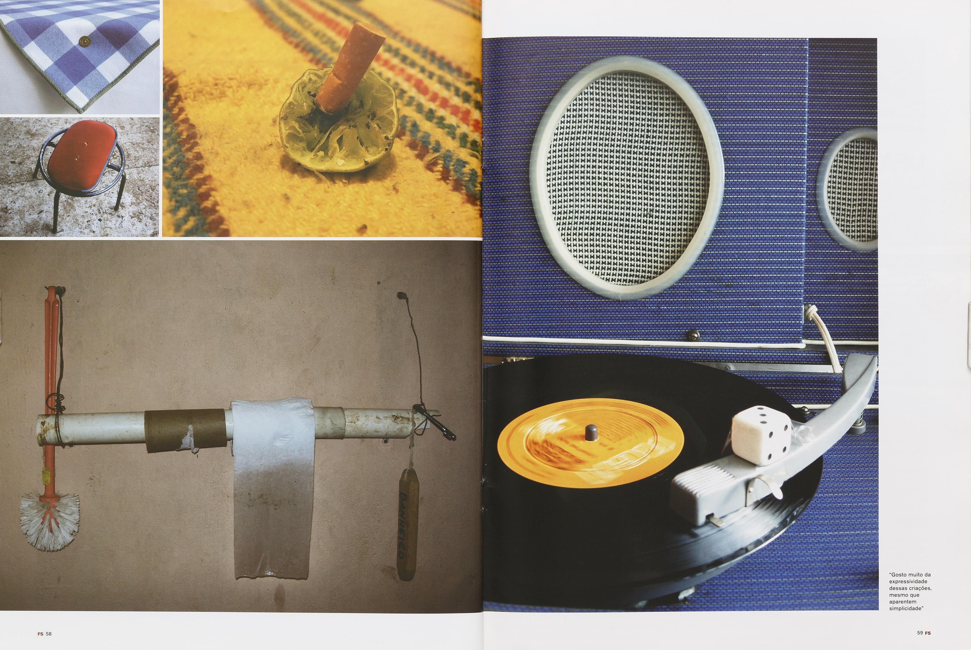 Mas o ensaio não é feito só de flagrantes. Cerca de 5% dos 40 registros de Gambiarras foram executados em estúdio, onde o artista reproduziu situações que estavam em sua memória mas não haviam sido registradas, como é o caso da imagem do dado servindo de peso para a agulha do toca-discos. Gosto muito da expressividade dessas criações improvisadas, mesmo que aparentem simplicidade , salienta.
