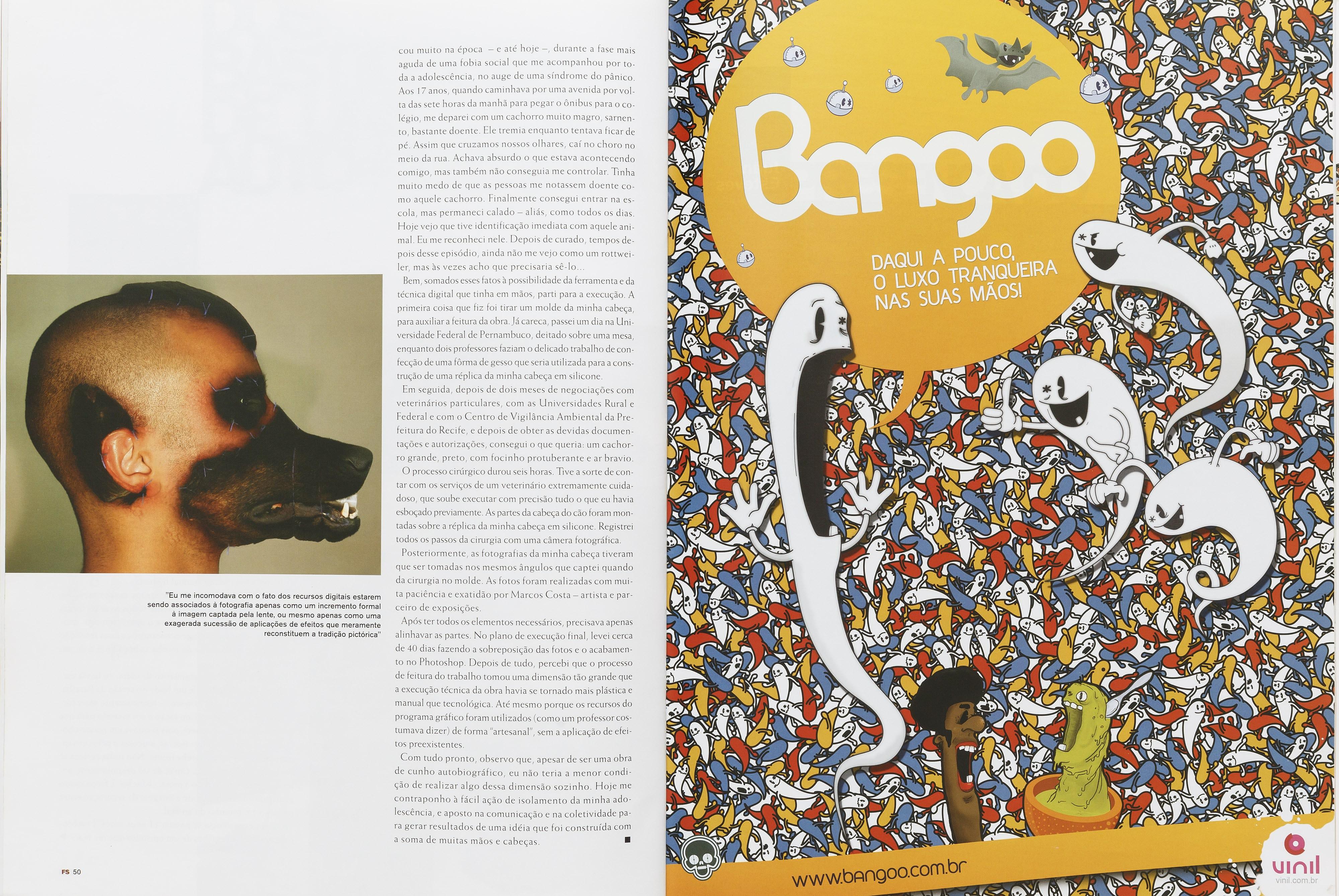 Em seguida, depois de dois meses de negociações com veterinários particulares, com as Universidades Rural e Federal e com o Centro de Vigilância Ambiental da Prefeitura do Recife, e depois de obter as devidas documentações e autorizações, consegui o que queria: um cachorro grande, preto, com focinho protuberante e ar bravio O processo cirúrgico durou seis horas. Tive a sorte de contar com os serviços de um veterinário extremamente cuidadoso, que soube executar com precisão tudo o que eu havia esboçado previamente. As partes da cabeça do cão foram montadas sobre a réplica da minha cabeça em silicone. Registrei todos os passos da cirurgia com uma câmera fotográfica. Posteriormente, as fotografias da minha cabeça tiveram que ser tomadas nos mesmos ângulos que captei quando da cirurgia no molde. As fotos foram realizadas com muita paciência e exatidão por Marcos Costa artista e parceiro de exposições.