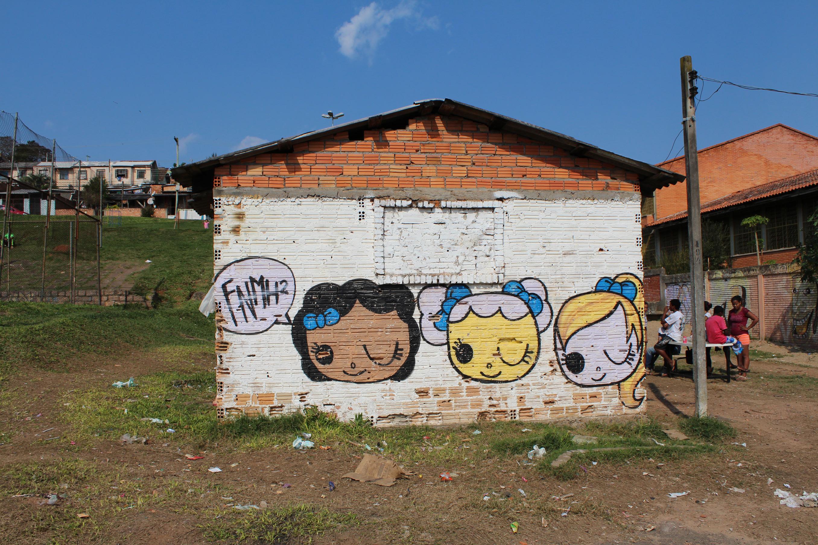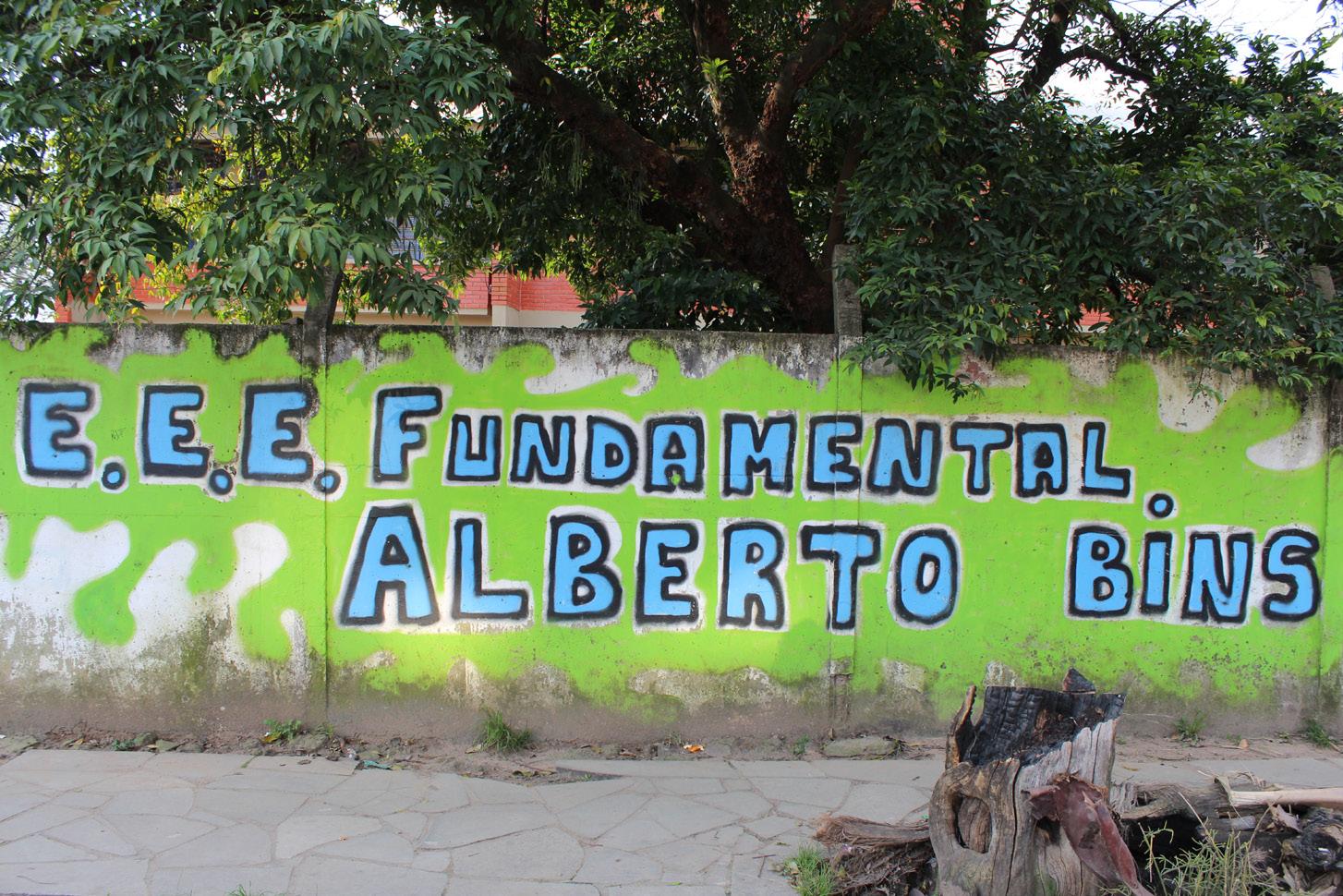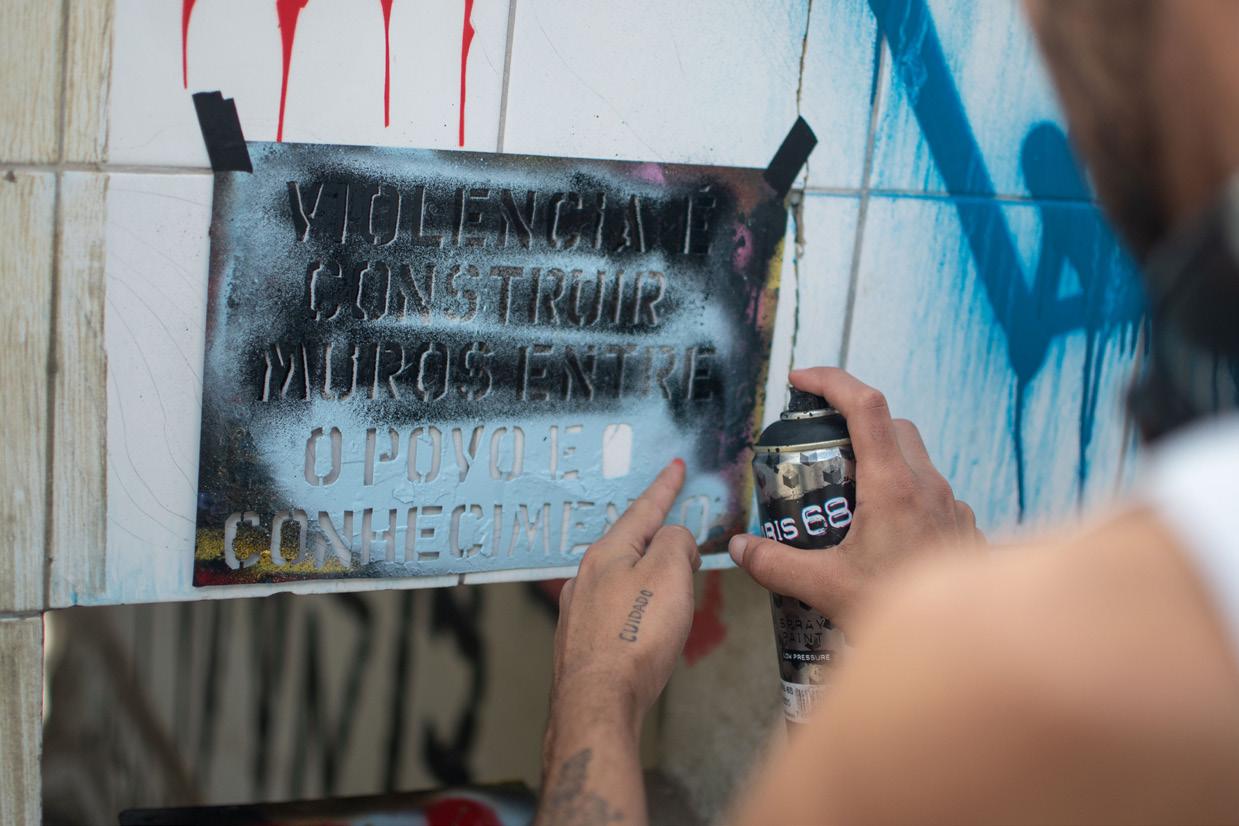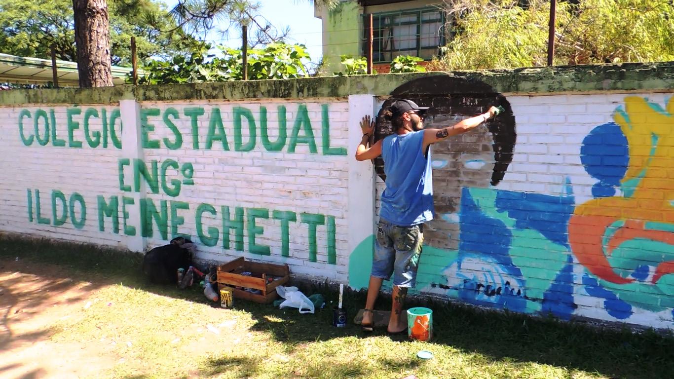 Em Compartilhando pincéis, tintas e histórias: Mutirão de graffi ti no Colégio Ildo Meneghetti, Leonardo Palhano Cabreira acom panha um mutirão de graffiti para dar novas cores ao muro do Co légio Ildo Meneghetti, no bairro Restinga em Porto Alegre/RS.