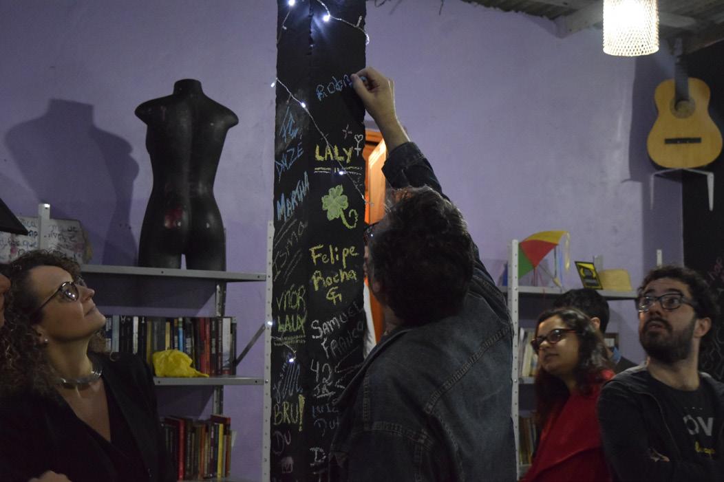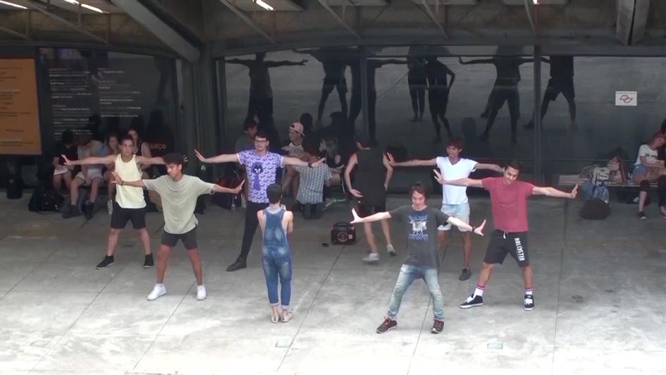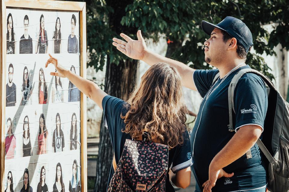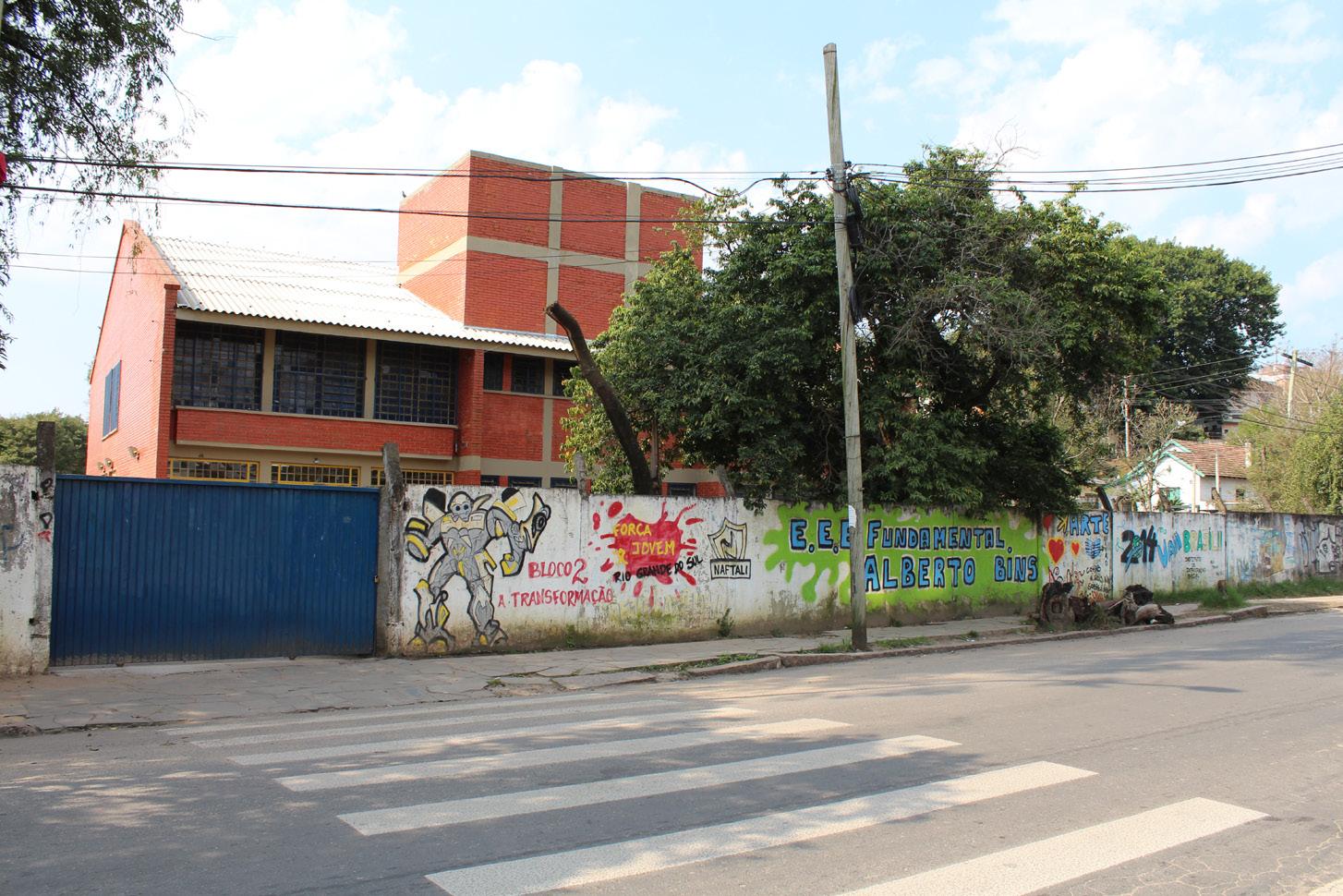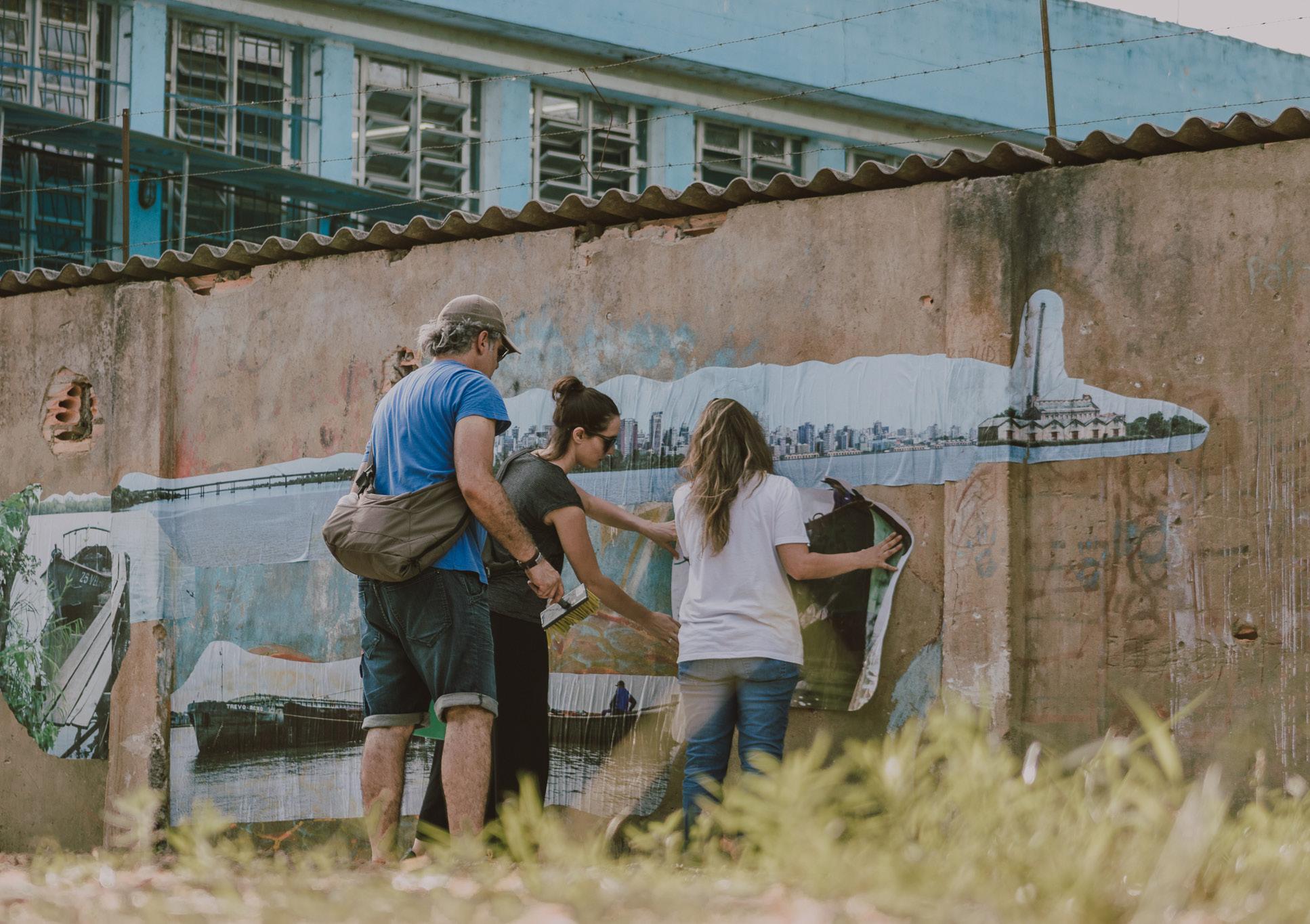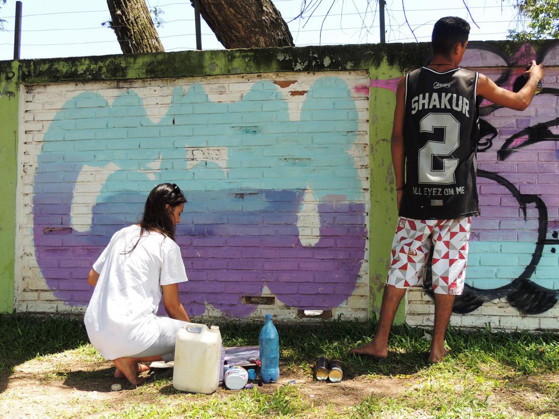 Em Compartilhando pincéis, tintas e histórias: Mutirão de graffi ti no Colégio Ildo Meneghetti, Leonardo Palhano Cabreira acom panha um mutirão de graffiti para dar novas cores ao muro do Co légio Ildo Meneghetti, no bairro Restinga em Porto Alegre/RS.