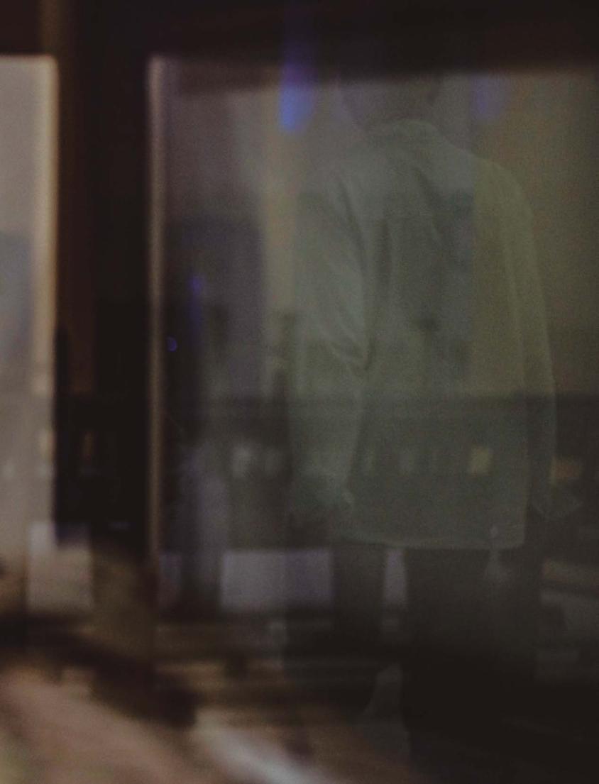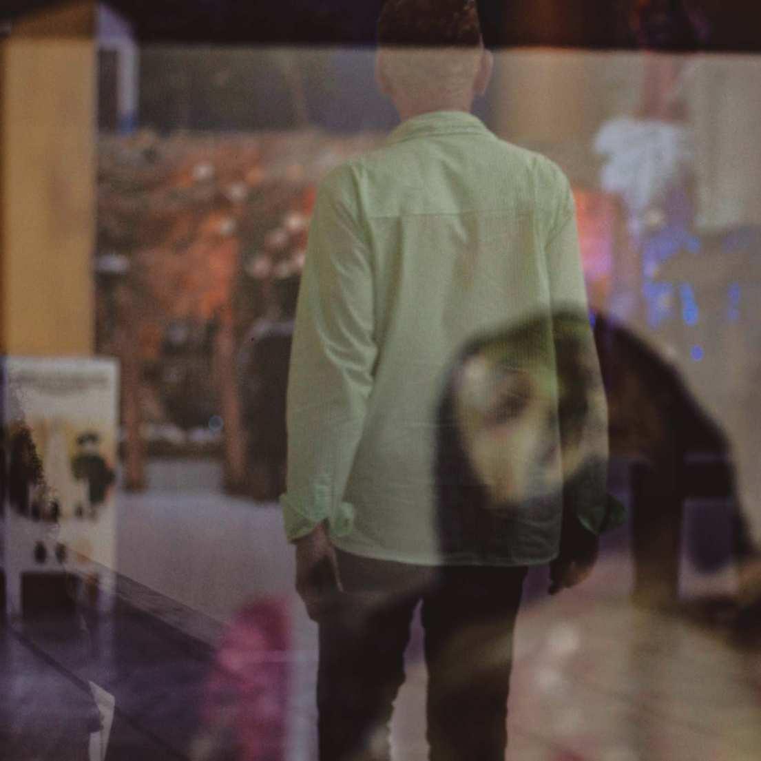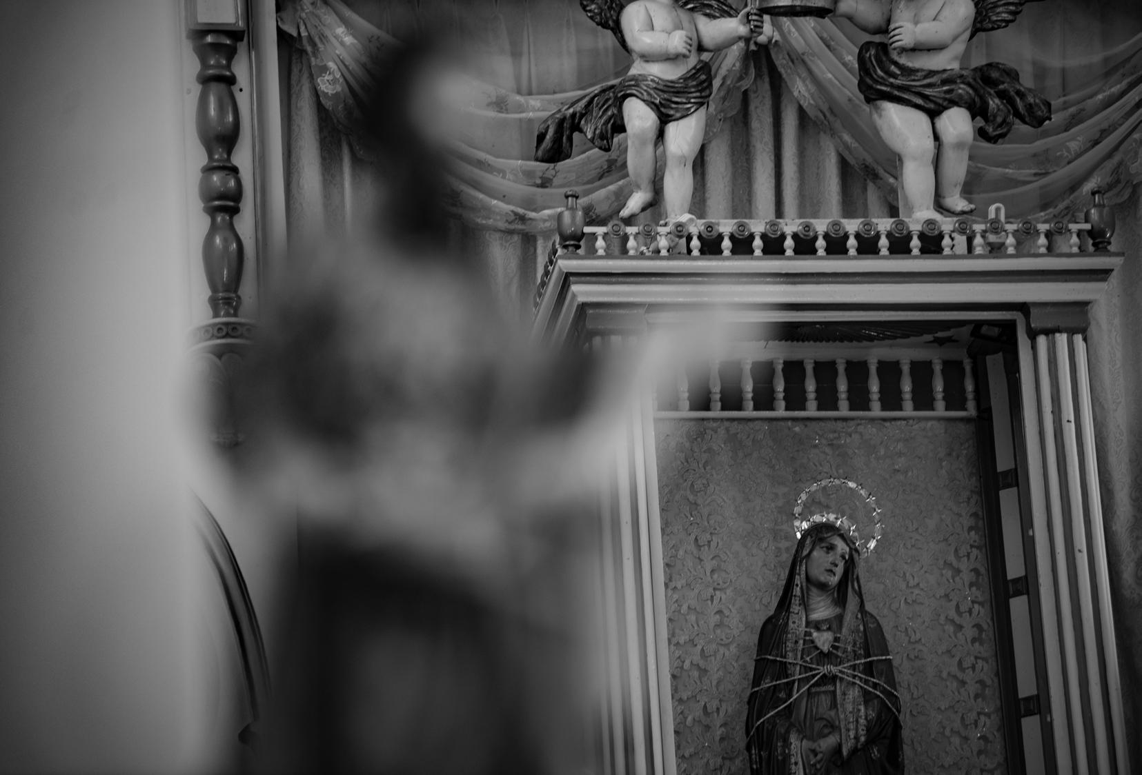 Representação do Cristo Morto e espelhamento de devoto passando pelo lugar. Ambiente interno da Basílica de Nossa Senhora das Dores./ Representation of the Dead Christ and a mirror image of a devotee passing by the place. Internal environment of the Basilica of Our Lady of Sorrows.