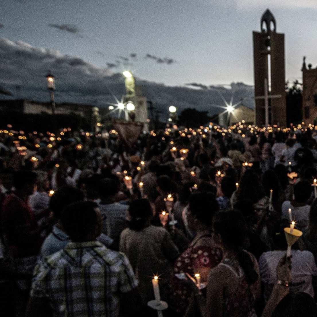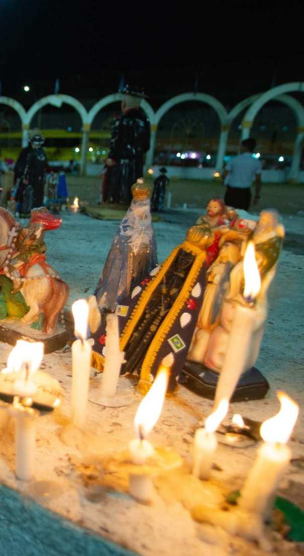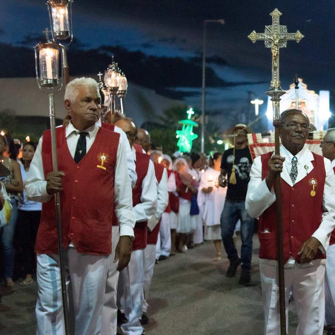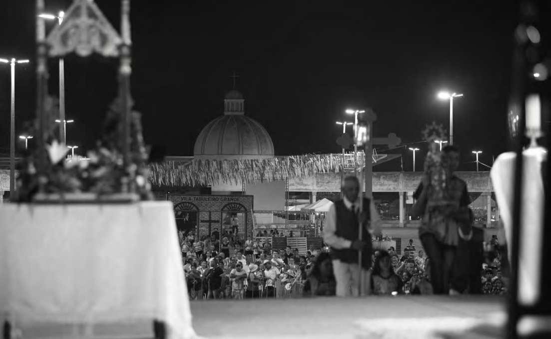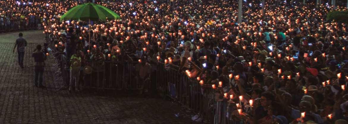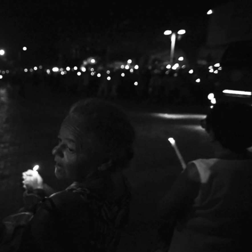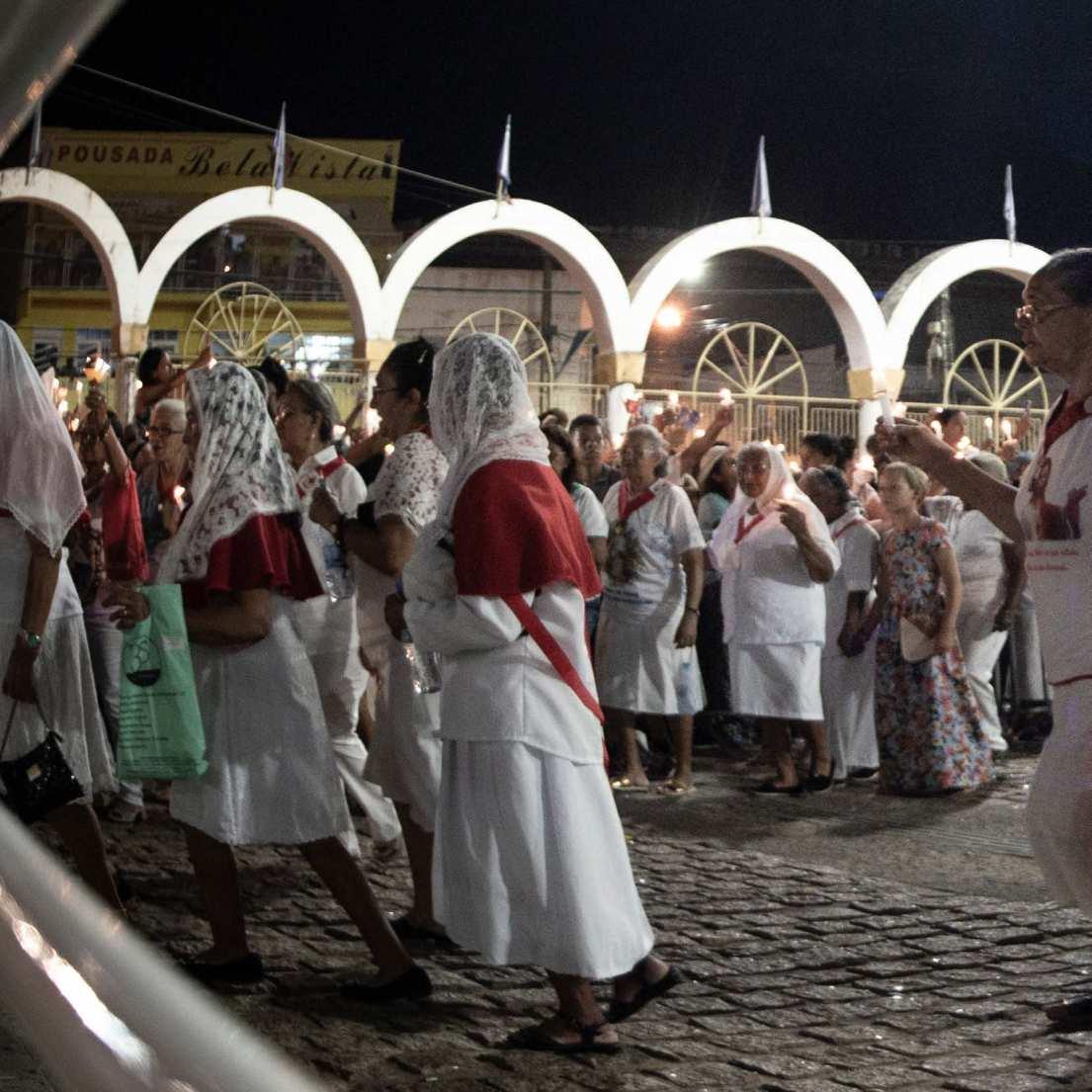 do Norte, but through memory and history in the Northeast. The first images invite us along a candlelit path that the religious procession of Nossa Senhora das Candeias will follow. Along this path we see the people of Juazeiro do Norte, and of the Northeast, and of Brazil, sculpted by light and shadow, faces lit up in the glow of their candles, no doubt the external emanation of internal faith, hope, and even spiritual ecstasy. Elinaldo Meira’s sensitive, searching camera guides us along this path of ritual, tradition, and community to an altar erected on the steps of the Igreja do Socorro (Church of Aid). Along with the candlelit ritual centered around Our Lady of the Lamps, we also witness the performance of the Eucharist and its importance as reflected in the passionate faces of the pilgrims.