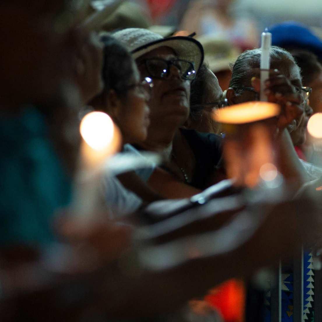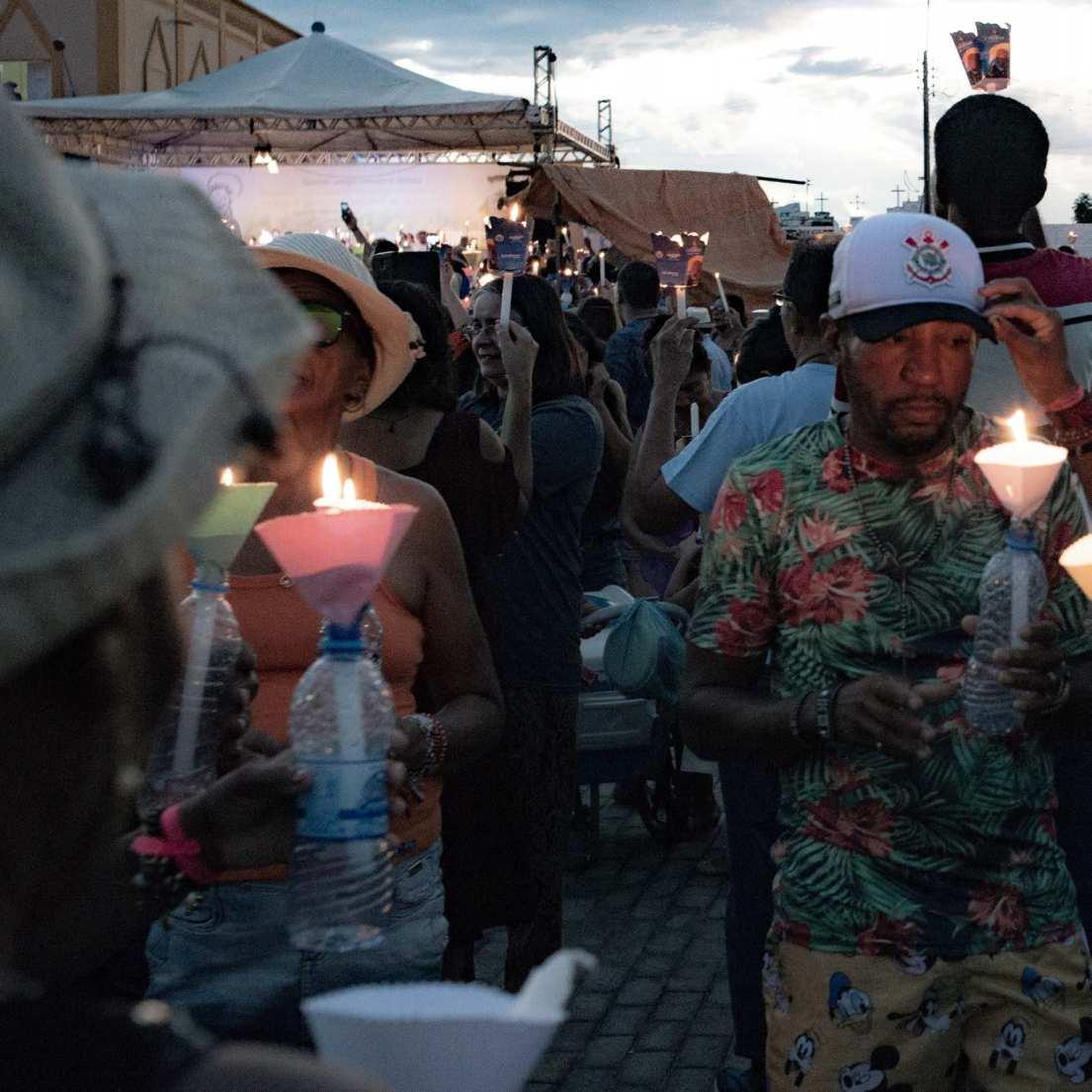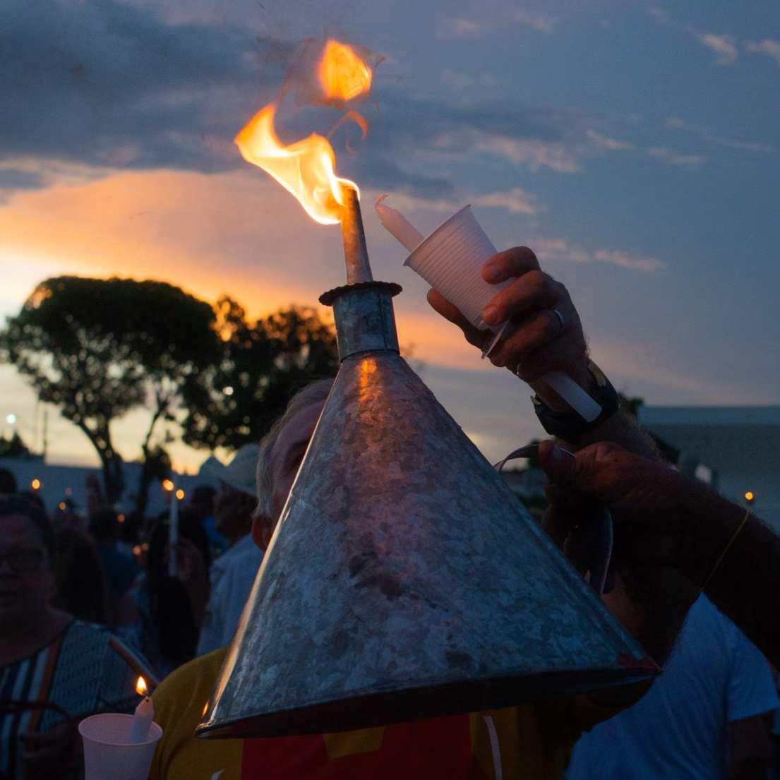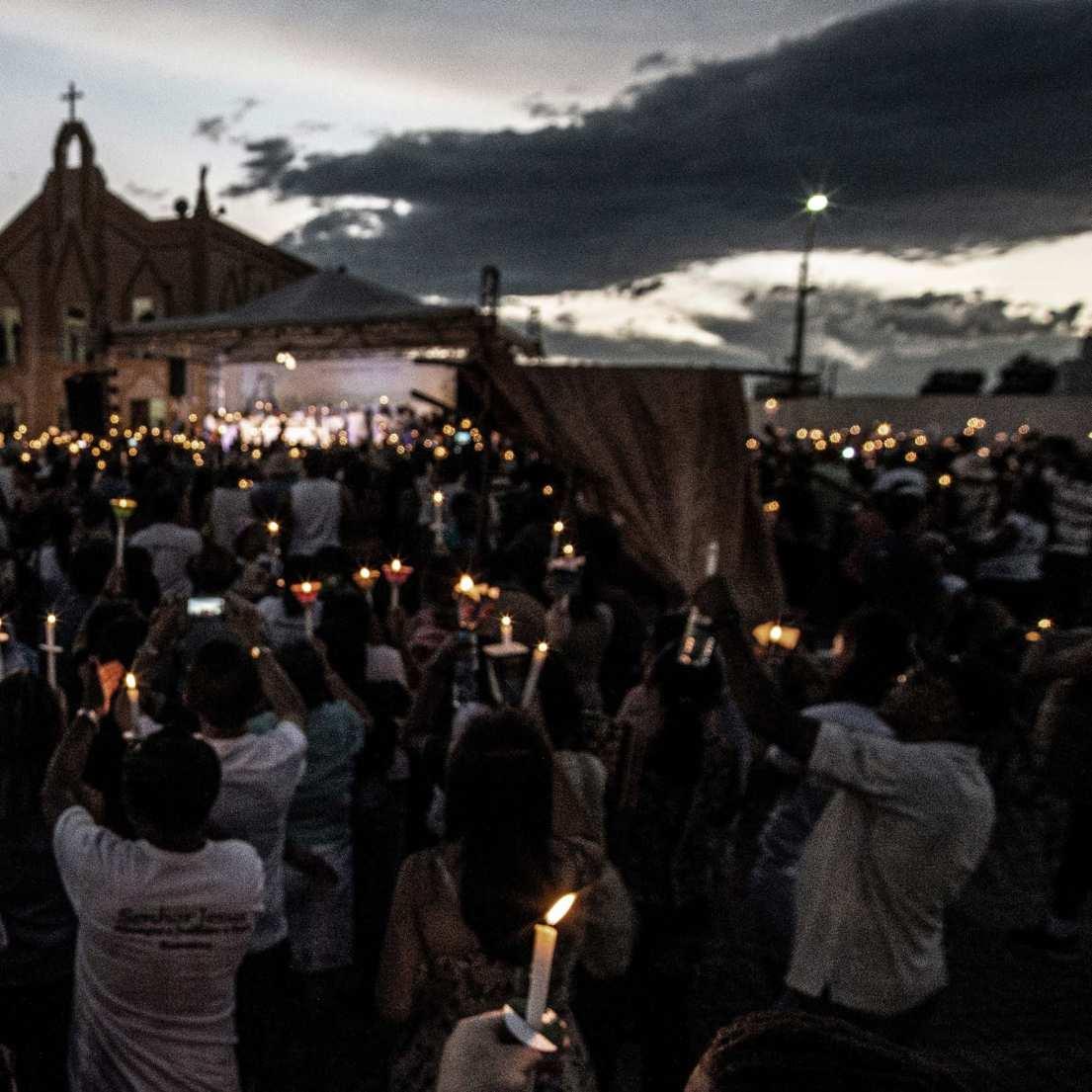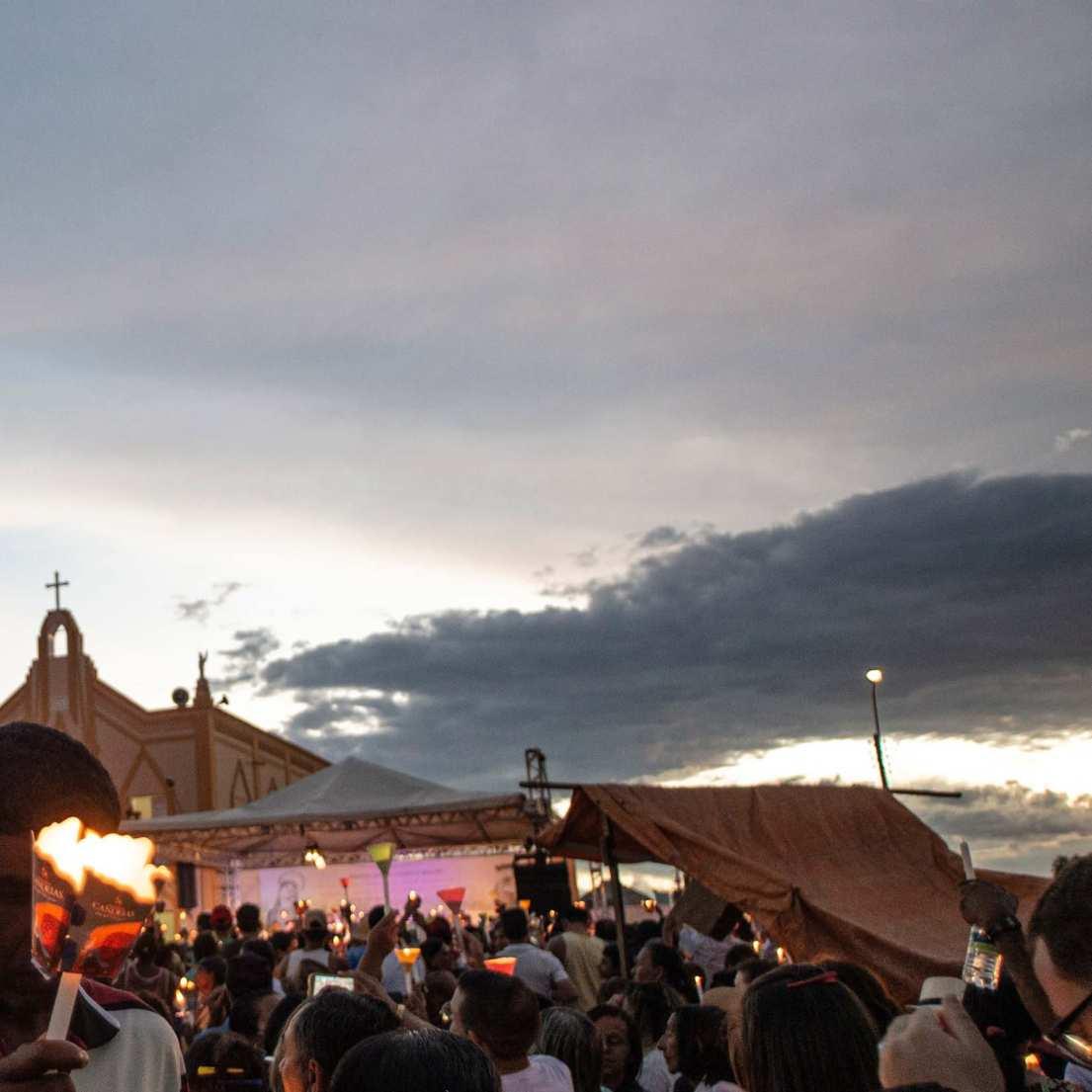 do Norte, but through memory and history in the Northeast. The first images invite us along a candlelit path that the religious procession of Nossa Senhora das Candeias will follow. Along this path we see the people of Juazeiro do Norte, and of the Northeast, and of Brazil, sculpted by light and shadow, faces lit up in the glow of their candles, no doubt the external emanation of internal faith, hope, and even spiritual ecstasy. Elinaldo Meira’s sensitive, searching camera guides us along this path of ritual, tradition, and community to an altar erected on the steps of the Igreja do Socorro (Church of Aid). Along with the candlelit ritual centered around Our Lady of the Lamps, we also witness the performance of the Eucharist and its importance as reflected in the passionate faces of the pilgrims.