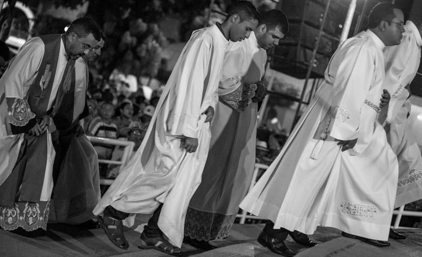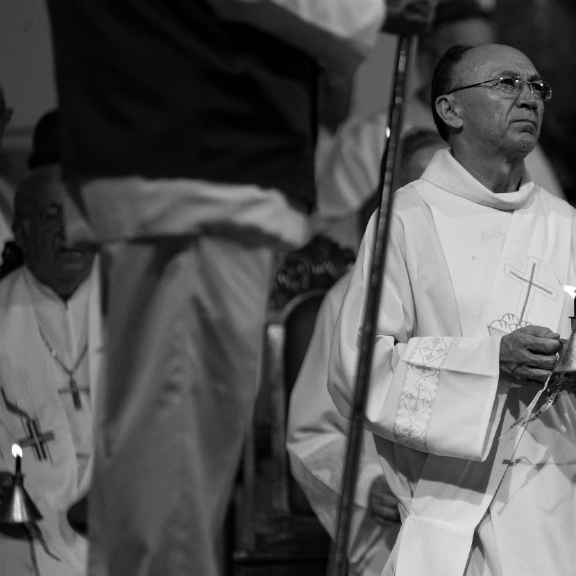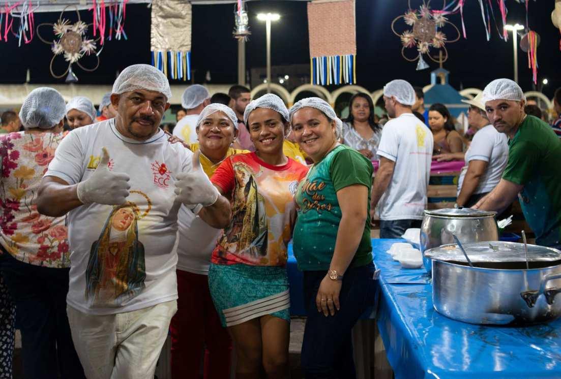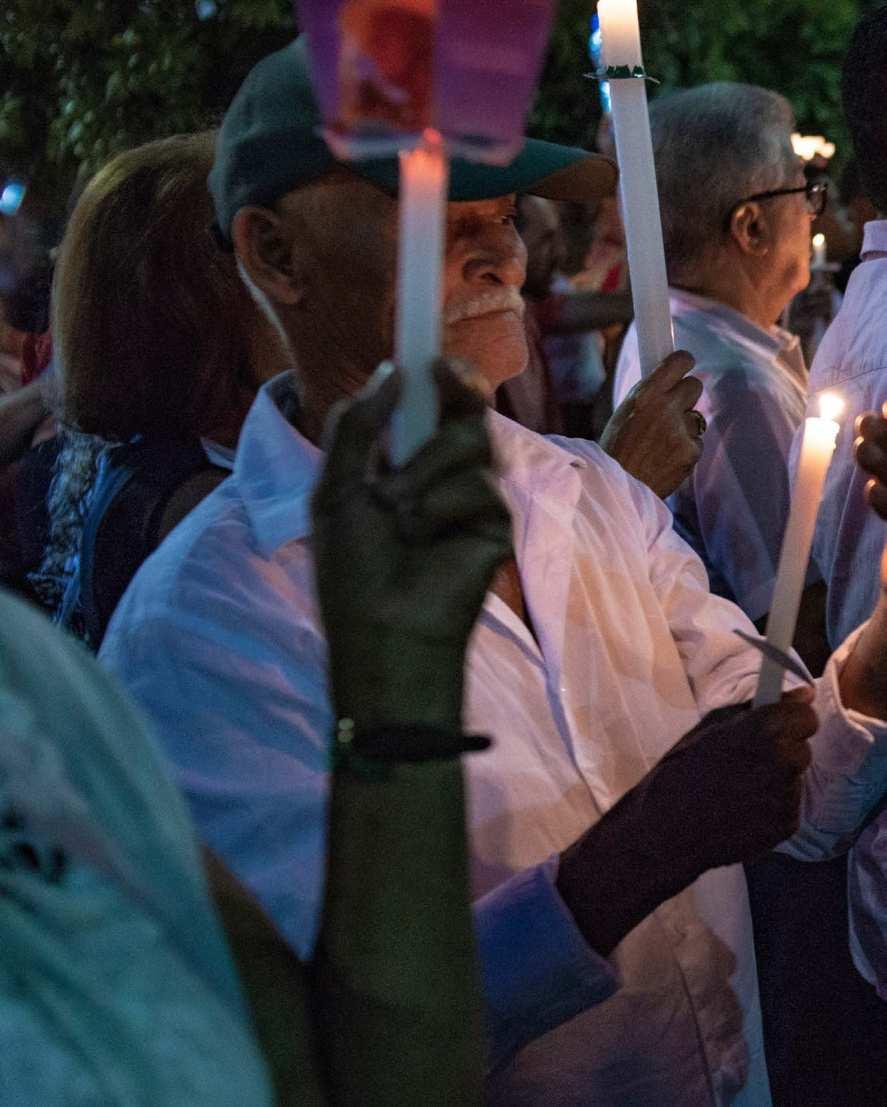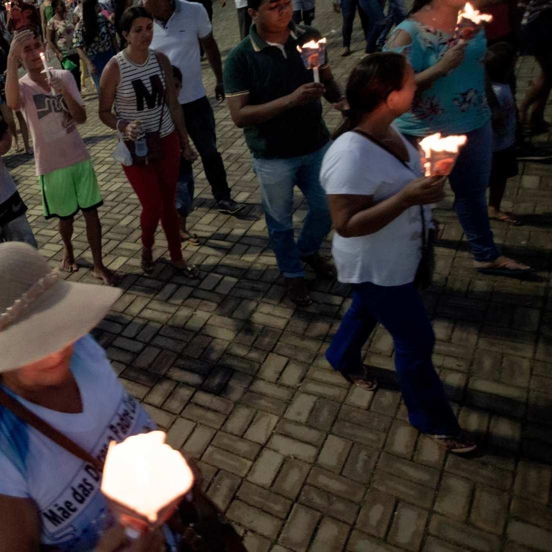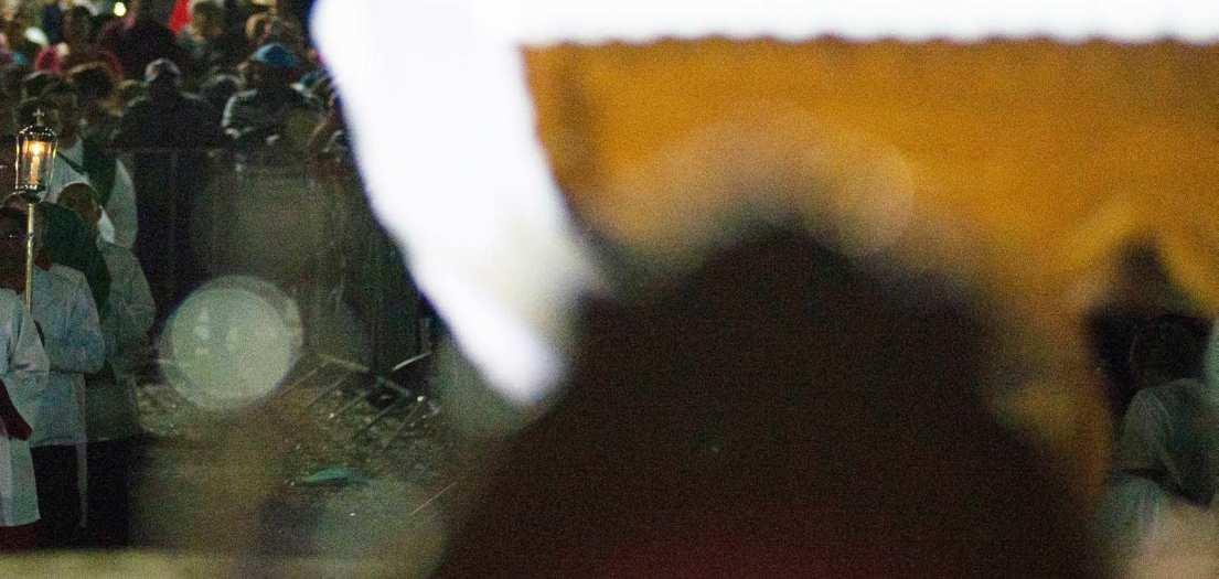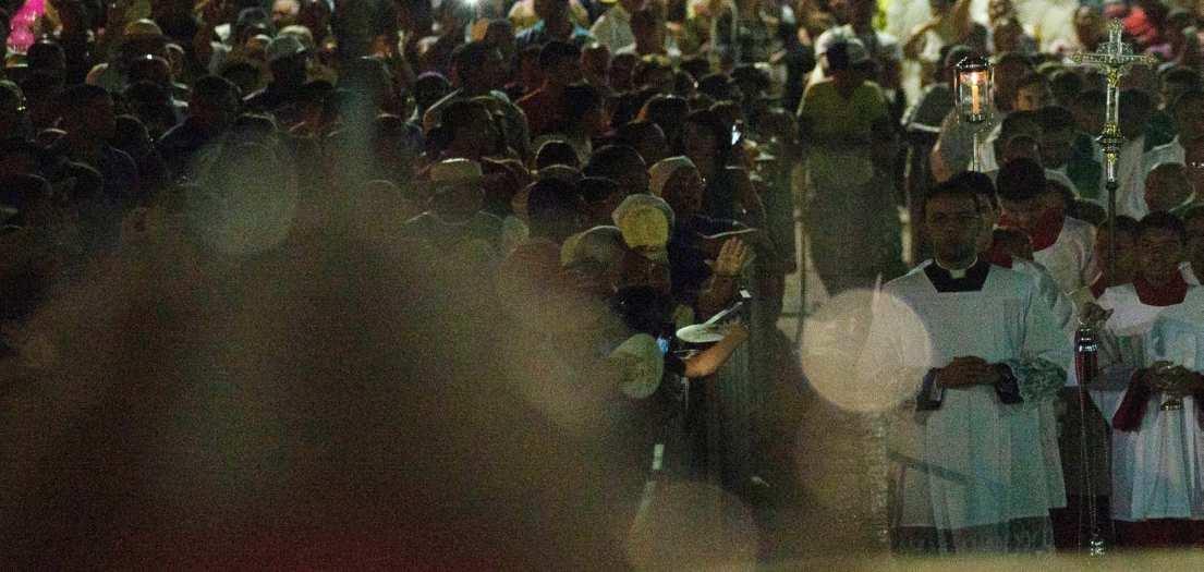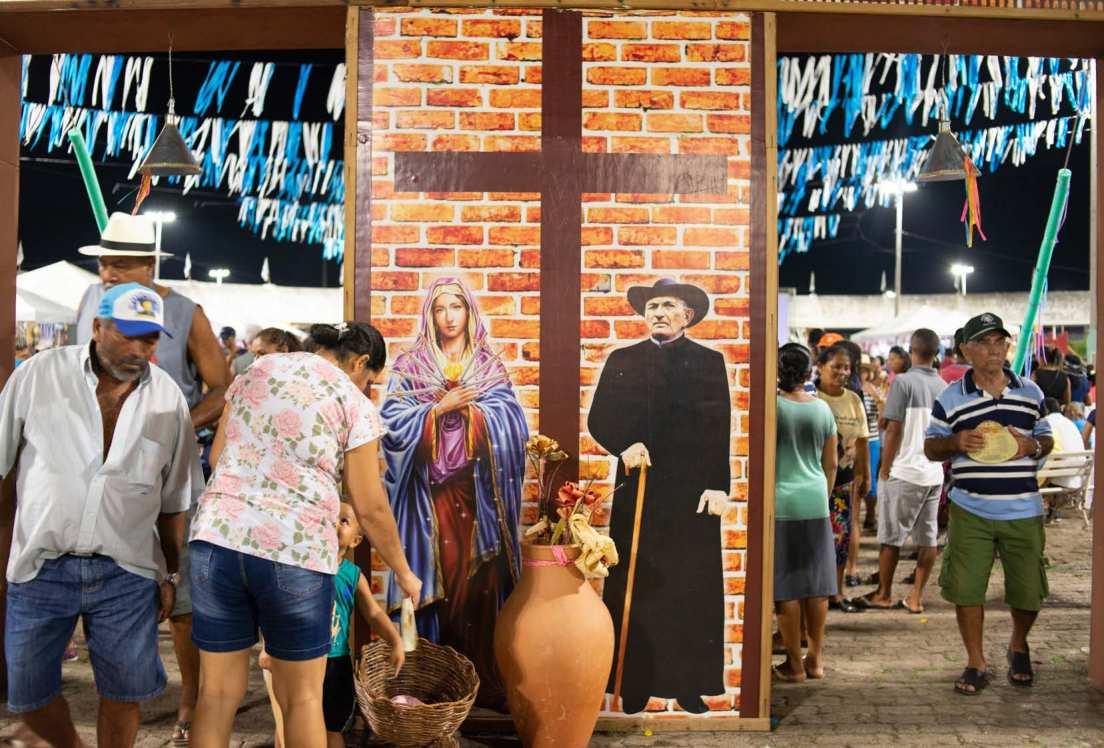 do Norte, but through memory and history in the Northeast. The first images invite us along a candlelit path that the religious procession of Nossa Senhora das Candeias will follow. Along this path we see the people of Juazeiro do Norte, and of the Northeast, and of Brazil, sculpted by light and shadow, faces lit up in the glow of their candles, no doubt the external emanation of internal faith, hope, and even spiritual ecstasy. Elinaldo Meira’s sensitive, searching camera guides us along this path of ritual, tradition, and community to an altar erected on the steps of the Igreja do Socorro (Church of Aid). Along with the candlelit ritual centered around Our Lady of the Lamps, we also witness the performance of the Eucharist and its importance as reflected in the passionate faces of the pilgrims.