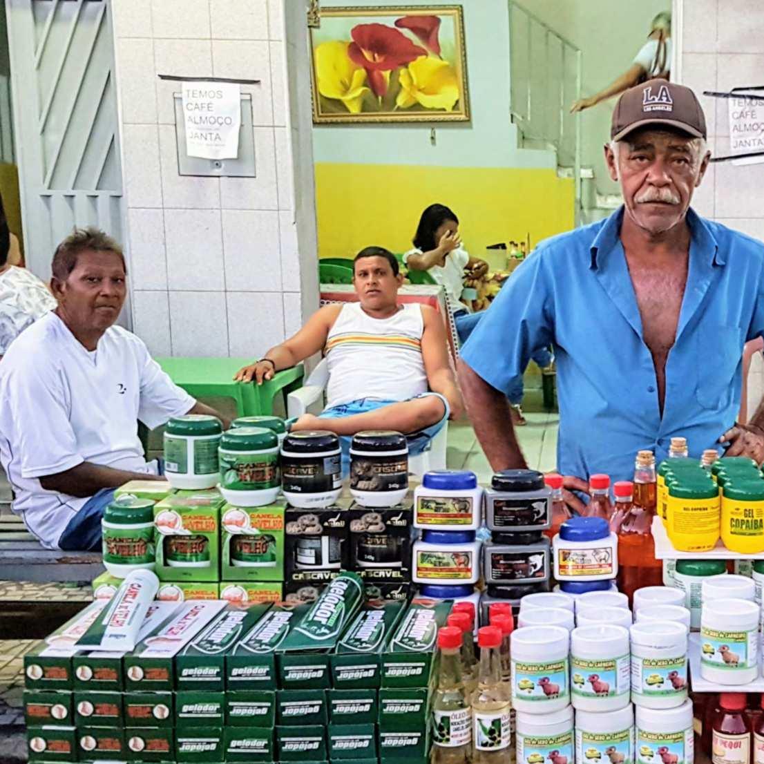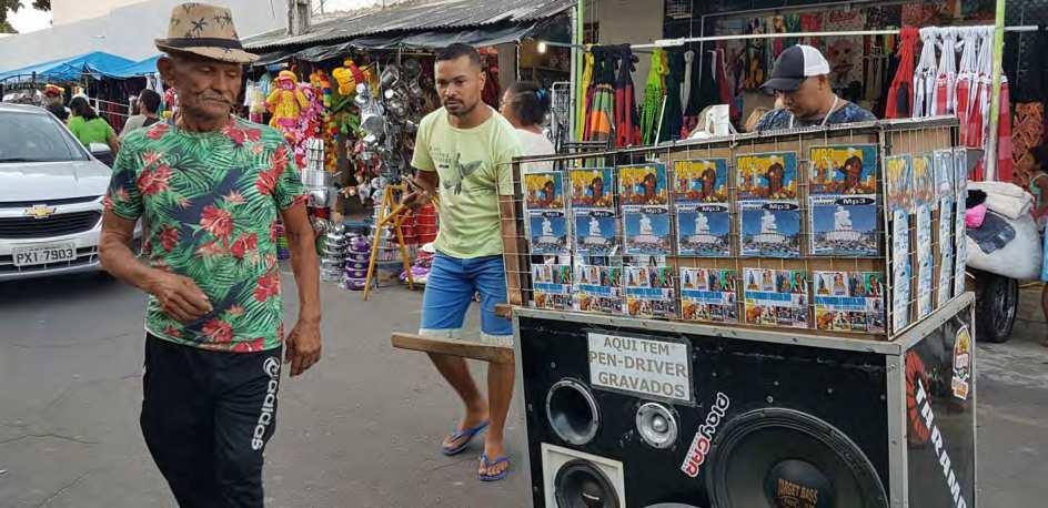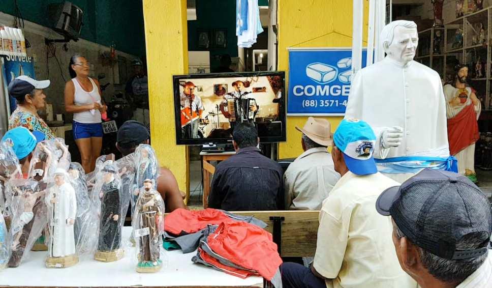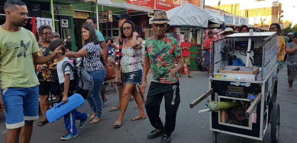 Estimulando a venda de músicas gravadas. Acompanha o vendedor o senhor Cícero Alves da Silva, em 2019 com 69 anos, conhecido como Vovô do Créu. Cícero ganhou evidência, a até chegou a participar de programas de televisão, depois que um romeiro postou em redes sociais a performance do dançarino./ Stimulating the sale of recorded music. Accompanying the seller is Mr. Cícero Alves da Silva, in 2019 aged 69, known as “Vovô do Créu” (Créu’s Grandpa). Cícero gained evidence, and even participated in television programs, after a pilgrim posted the dancer’s performance on social networks.