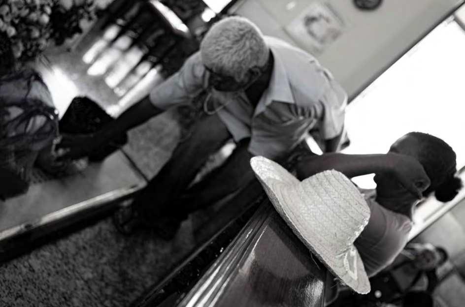 Soon the central importance of the local beato or “Blessed One,” Father Cícero (1844-1934), is revealed in the interaction of the people with icons of this religious and political leader of the early twentieth century in the region. Having become a largerthan-life figure, indeed a kind of regional, unofficial saint, Cícero is nevertheless treated with a certain intimacy by his devotees and admirers. In this sense, he is not so much famous as popular, a hero whom the people feel themselves close to, and wish to pose with for a snapshot. Indeed, we get a sense of how Father Cícero’s image proliferates throughout the city aside other Christian iconography, and on every scale imaginable, from statuettes that could be held in the palm of one’s hand, to life-size statues that pilgrims pose with as if in a family photo, to the here unseen but most well-known tribute to Cícero in the town, a 27-meter tall statue that overlooks Juazeiro do Norte from a hilltop. Meira chooses to remain at this human scale within the context of the religious festival, while some pilgrims will no doubt ascend to the heights above the town to honor Padre Cícero on a monumental level. But were he to include photographs of the statue itself, the emphasis would be more on the fame and grandeur of the miraculous priest. Instead, Meira wisely chooses not to depart from the intimacy he has established with his camera (in one photo we do see images of people posing with the famous statue, but they appear to be a merchant’s sample images on post cards or posters which are, revealingly, scaled down so that the giant statue appears on a human scale). Two photographs of people turning their backs on a statue of Jesus Christ reveal a different kind of relationship to religious iconography which does not seem to be as intimate. Perhaps it is the very nature of this particular representation of the recumbent Christ,