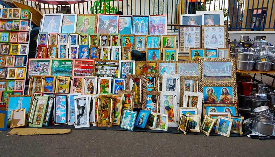 Comércio de impressões enquadradas nos arredores da Basílica de Nossas Senhora das Dores. De tudo um pouco: de astros midiáticos às santidades./ Trade prints framed in the surroundings of the Basilica of Our Lady of Sorrows. A little bit of everything: from media stars to saints.