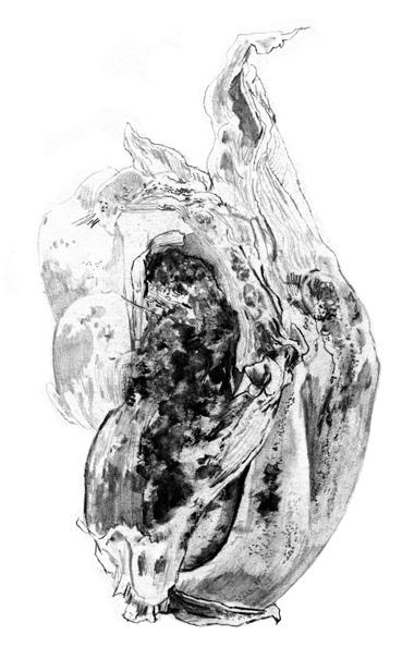 Em uma das tardes, quando estávamos próximos a uma das plantações, ela percebeu algo diferente em uma das espigas ainda no pé e, ao mexer, encontrou um huitlacoche, que arrancou e nos deu de presente, me fazendo sentir que acabara de ganhar um pequeno tesouro.