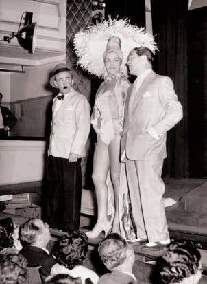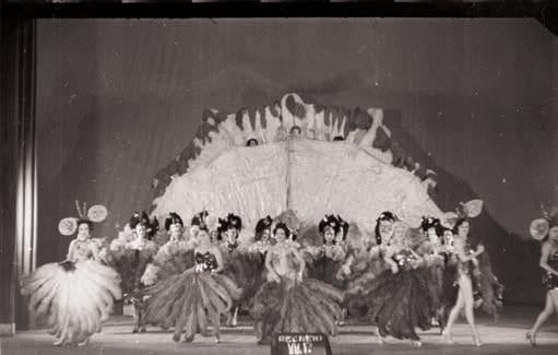 O uso da figura feminina como parte ‘viva’ do cenário também ocorreu no quadro “Bolo real” da revista Muié macho sim sinhô, no qual, porém, o próprio bolo era um dinâmico elemento cenográfico, que se abria durante a cena, e as girls em cima dele e em seu interior davam continuidade a essa movimentação. Naquela fase do quadro não havia telões; o bolo era o elemento principal da cenografia. A despeito do grande uso de telões é possível identificar em alguns espetáculos de Walter Pinto proposta cenográfica alternativa, como os objetos-cenário e construções cuja estrutura incorporava elementos “vivos”. Além de Muié macho sim sinhô (1950), com o bolo, e de É fogo na jaca (1953), com espelhos e girls-candelabro, podemos ainda citar dois quadros de Está com tudo e não está prosa (1949): “O leque”, formado inteiramente por girls e seus leques de plumas (i104 e i105), e a apoteose “Lenda do mar” (i106), com imenso carrossel de cavalos-marinhos. E ainda outro carrossel (i107), na apoteose de Botando pra jambrar (1956).
