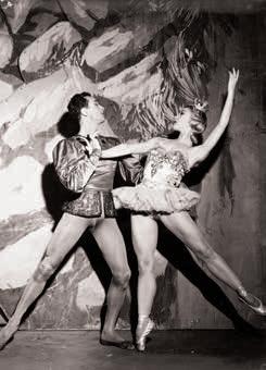 Apesar de “Sonho de Cinderela” ter sido o quadro com maior número de fotografias, não constituiu narrativa visual porque não houve preocupação em documentar fotograficamente o desenrolar do enredo. Produziram-se retratos do casal de bailarinos e da bailarina sozinha, com o figurino da cena, mas fora de seu contexto e, talvez, reproduzindo algum momento da coreografia desenvolvida para a segunda fase (i100 a i102). Eram retratos realizados no próprio teatro, em geral no palco, com a luz de cena e, às vezes, outro ponto de luz preparado pelo fotógrafo. Procurava-se colocar os atores e bailarinos caracterizados e aludindo a algum momento da cena do espetáculo. Os retratos desse tipo eram normalmente usados nos programas da Companhia ou na divulgação na imprensa. Na década de 1950 a bailarina Marina Marcel aparece em inúmeras imagens publicadas nos programas da Companhia.