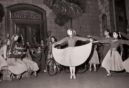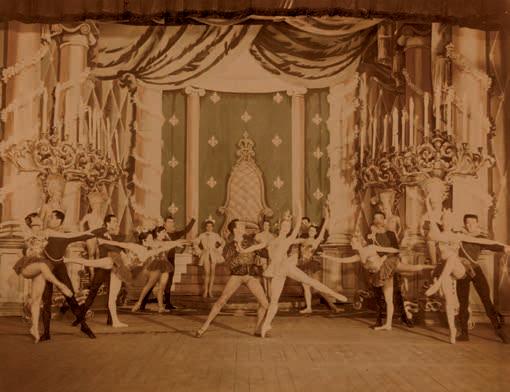 O quadro de fantasia “Sonho de Cinderela” foi o que apresentou maior número de fotografias no dossiê de É fogo na jaca presente no Arquivo Walter Pinto. Não é difícil imaginar por quê. As fotografias revelam quadro luxuosamente elaborado em termos de figurinos e cenografia, com destaque para a coreografia de balé clássico apresentada pelos primeiros bailarinos Marina Marcel e Léo Lauer com o corpo de baile, além do “truque surpresa”, realizado com jogo de espelhos. Não foi a primeira vez que Walter Pinto o utilizou em seus espetáculos. Foto publicada no Programa da Companhia Walter Pinto de 1951 registra cena de espetáculo em que aparece o recurso, infelizmente sem identificação do espetáculo em questão; tampouco essa imagem foi localizada em outro dossiê do Arquivo. Fato é, contudo, que o jogo de espelhos já tinha sido empregado em outra ocasião, ainda que com temática bem diferente.